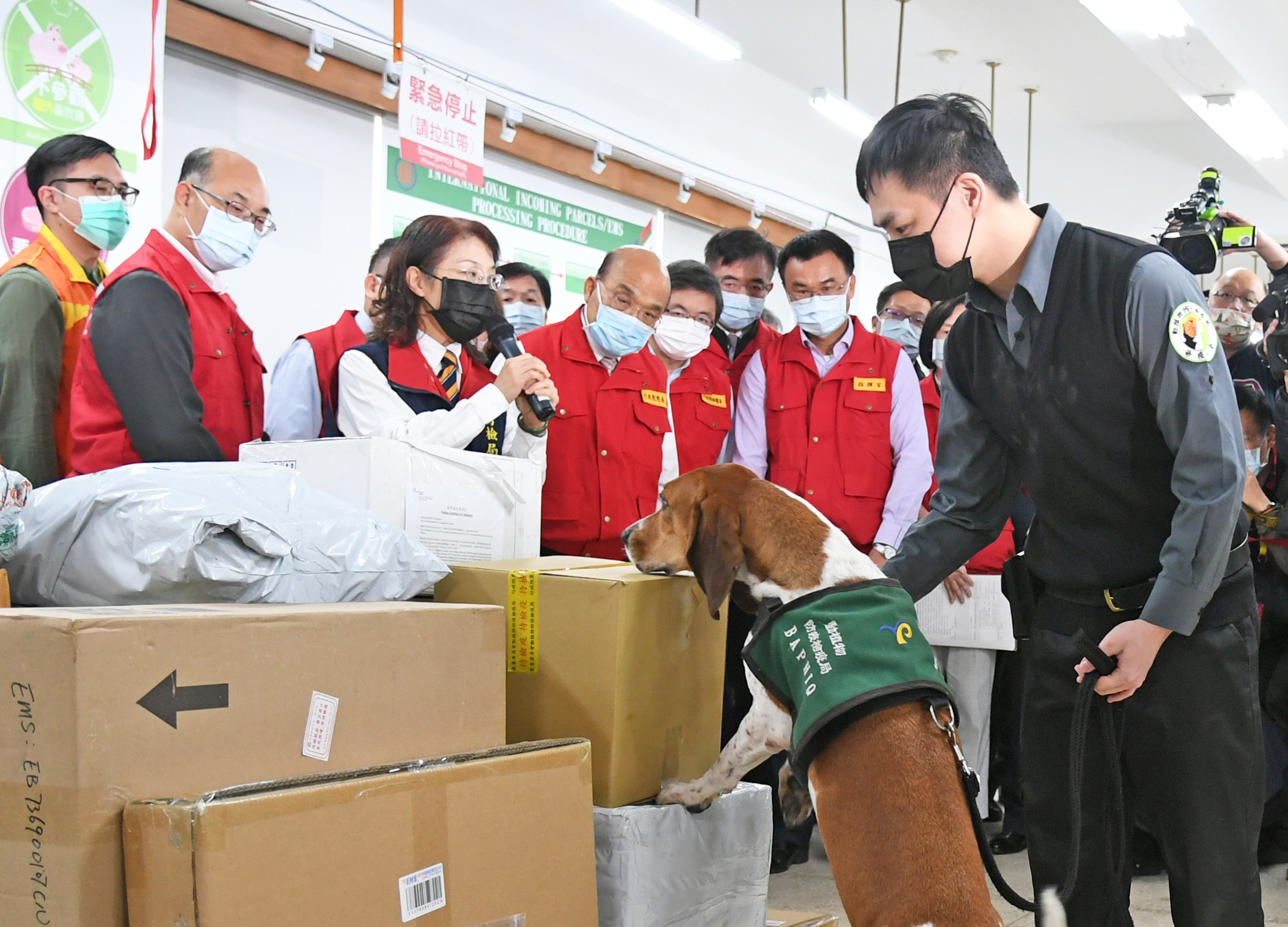 蘇院長此行聽取臺北郵件處理中心林煌城主任解說後,實地視察,瞭解郵政人員將來自非洲豬瘟高風險疫區的郵包分流集中送上輸送帶,進行檢疫犬查驗、關務署人員逐件X光檢驗,以及包裹開封查驗等檢疫流程作業。院長十分關切查獲郵包內不合格檢疫物的處置情形,對於同仁現場開封郵包取出香腸肉製品,也表達肯定。