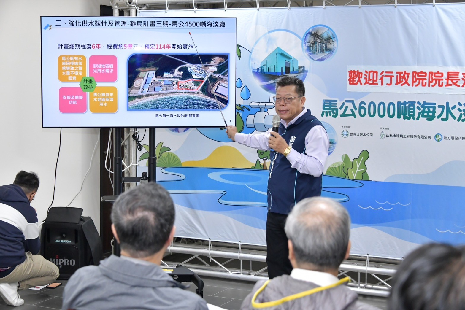 卓院長進一步說,澎湖興仁、烏崁及山水里等地區目前尚未有自來水供應,為改善當地民眾用水,政府未來將在澎湖馬公新建一座4,500噸海水淡化廠,持續補強地方用水需求,進一步完善澎湖智慧水網系統。他強調,中央非常重視此項工程計畫,請經濟部及台灣自來水公司於明年開始實施後,全力做好相關工程建設,厚實澎湖地方基礎建設,同時中央會全力協助改善澎湖交通問題,以提供充裕運輸量能,為澎湖觀光注入更多活力,吸引國內外旅客前來度假觀光,打造澎湖成為國際觀光島。