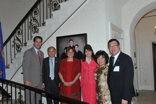 稍晚,一向勤政愛民,關心財政赤字及民眾失業的美國威斯康辛州(Wisconsin State)州長史考特(Governor Scott Walker)及副州長蕾碧卡(Lt. Governor Rebecca Kleefisch),於首府麥迪遜州長官邸,親自接待行政院政務委員兼臺灣省政府主席林政則、專員張智軒、技佐顧士洋等人,並由我國駐芝加哥經濟與文化辦事處處長申佩璜、組長王振福、領事吳正偉陪同出席。史考特州長賢伉儷、副州長蕾碧卡暨威斯康辛州政府重要官員威州商務廳長保羅(Mr. Paul Jadin)、農業廳副廳長傑夫(Mr. Jeff Lyon)、觀光廳副廳長戴夫(Mr. Dave Fantle)、商業廳經理史丹利(Mr. Stanley Pfrang)、農業發展署顧問陸瑗(Ms. Jennifer Lu)、前聯邦參議員羅拔特(Mr. Robert W. Kasten, Jr.)、Orion公司資深副總裁凱文(Mr. Kevin Crawford)等,於州長官邸與林政委一行人召開座談。