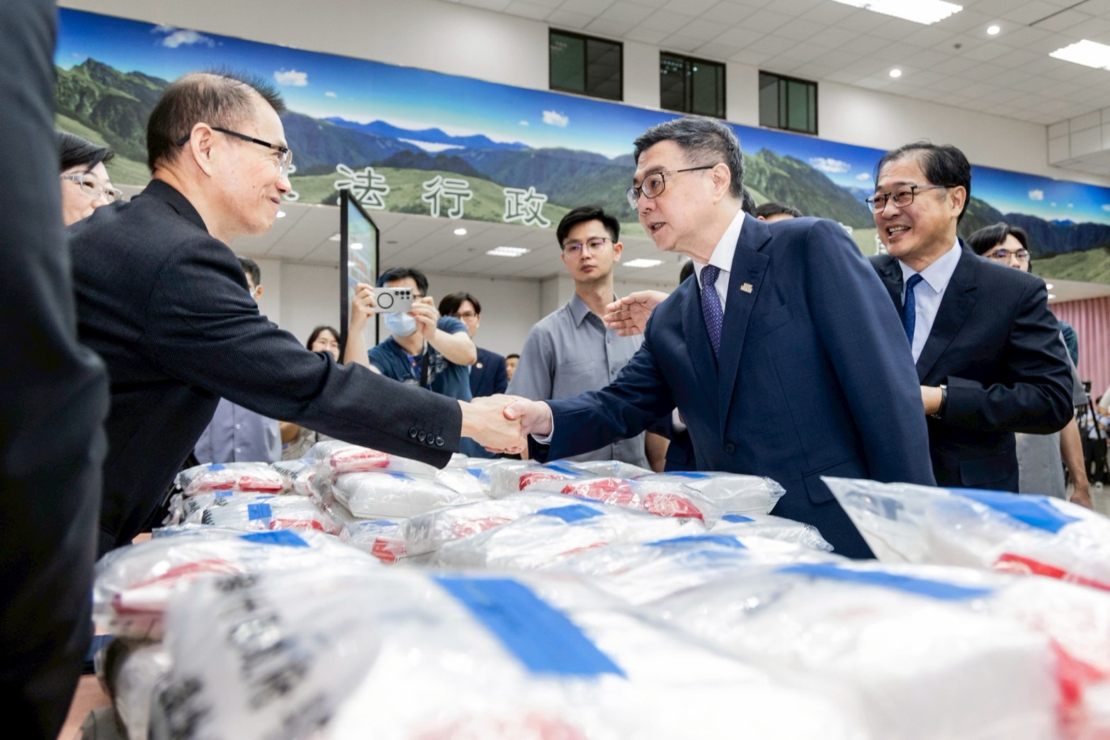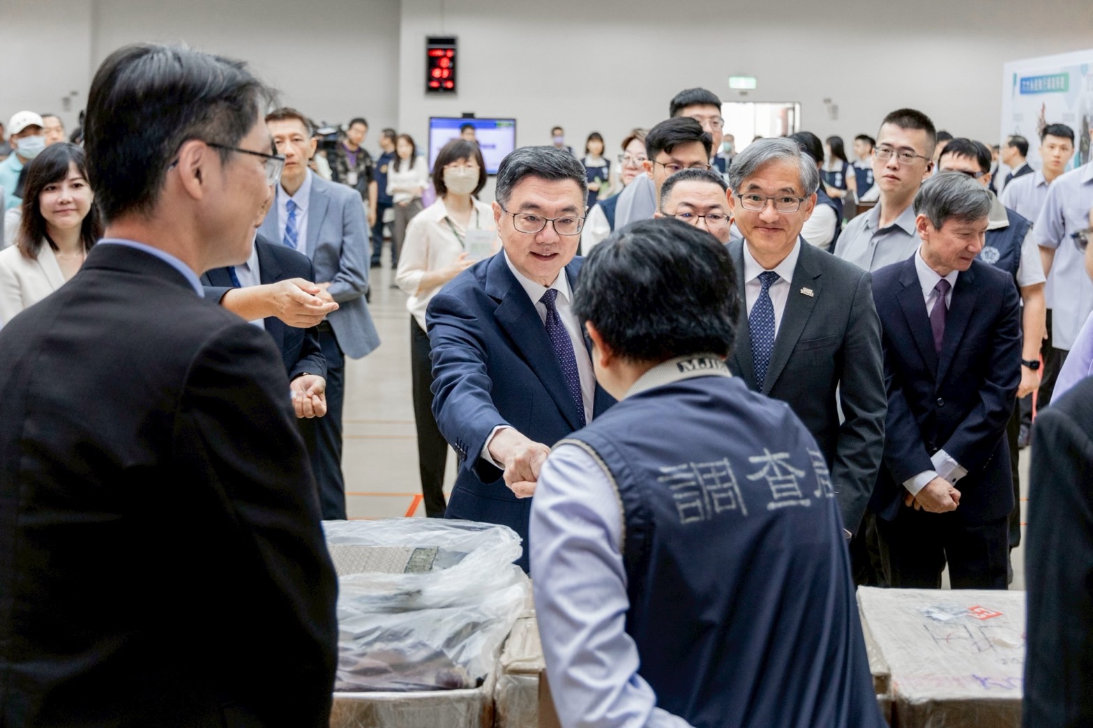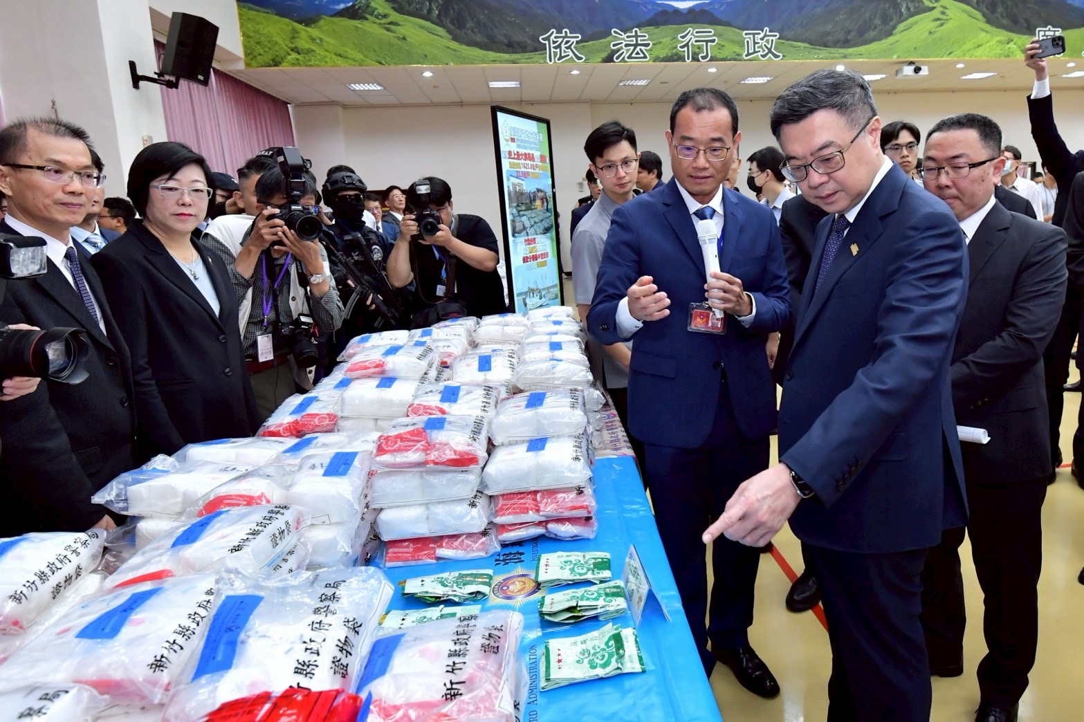 致詞結束後,卓院長偕同行政院林明昕政務委員、李慧芝發言人、財政部莊翠雲部長、法務部鄭銘謙部長、最高檢察署邢泰釗檢察總長、臺灣高等檢察署張斗輝檢察長、財政部關務署彭英偉署長、 法務部調查局陳白立局長、內政部警政署陳永利副署長、海洋委員會海巡署謝慶欽副署長、憲兵指揮部鄭禎祥指揮官、內政部警政署刑事警察局周幼偉局長等合影留念。