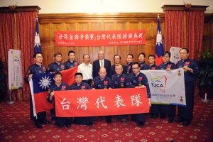 行政院長吳敦義今(22)日出席「世界金廚爭霸賽」台灣代表隊授旗典禮,預祝台灣代表隊旗開得勝獲得金牌,並期許十二位代表隊的成員將台灣的美食帶入國際領域,弘揚於國際。