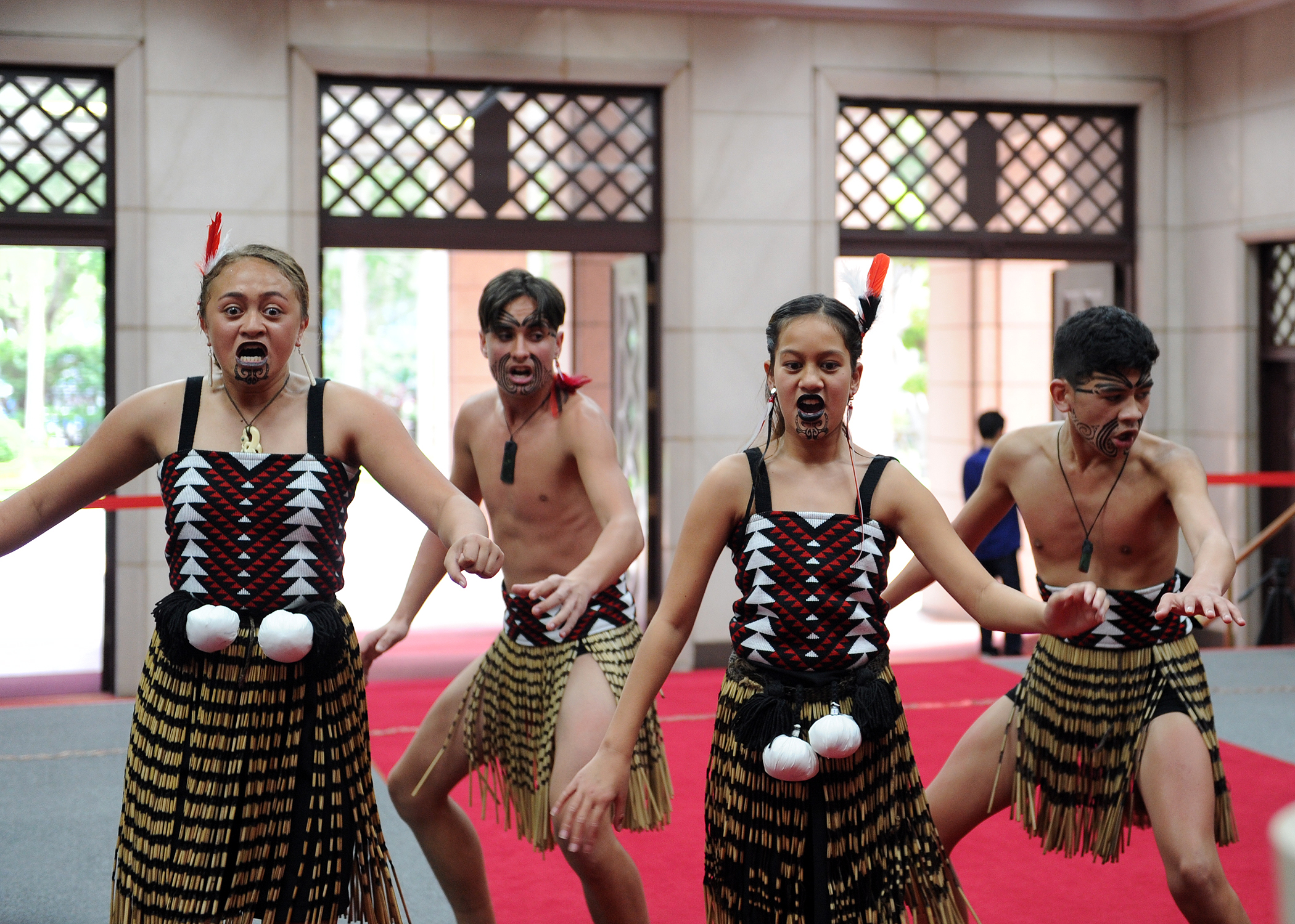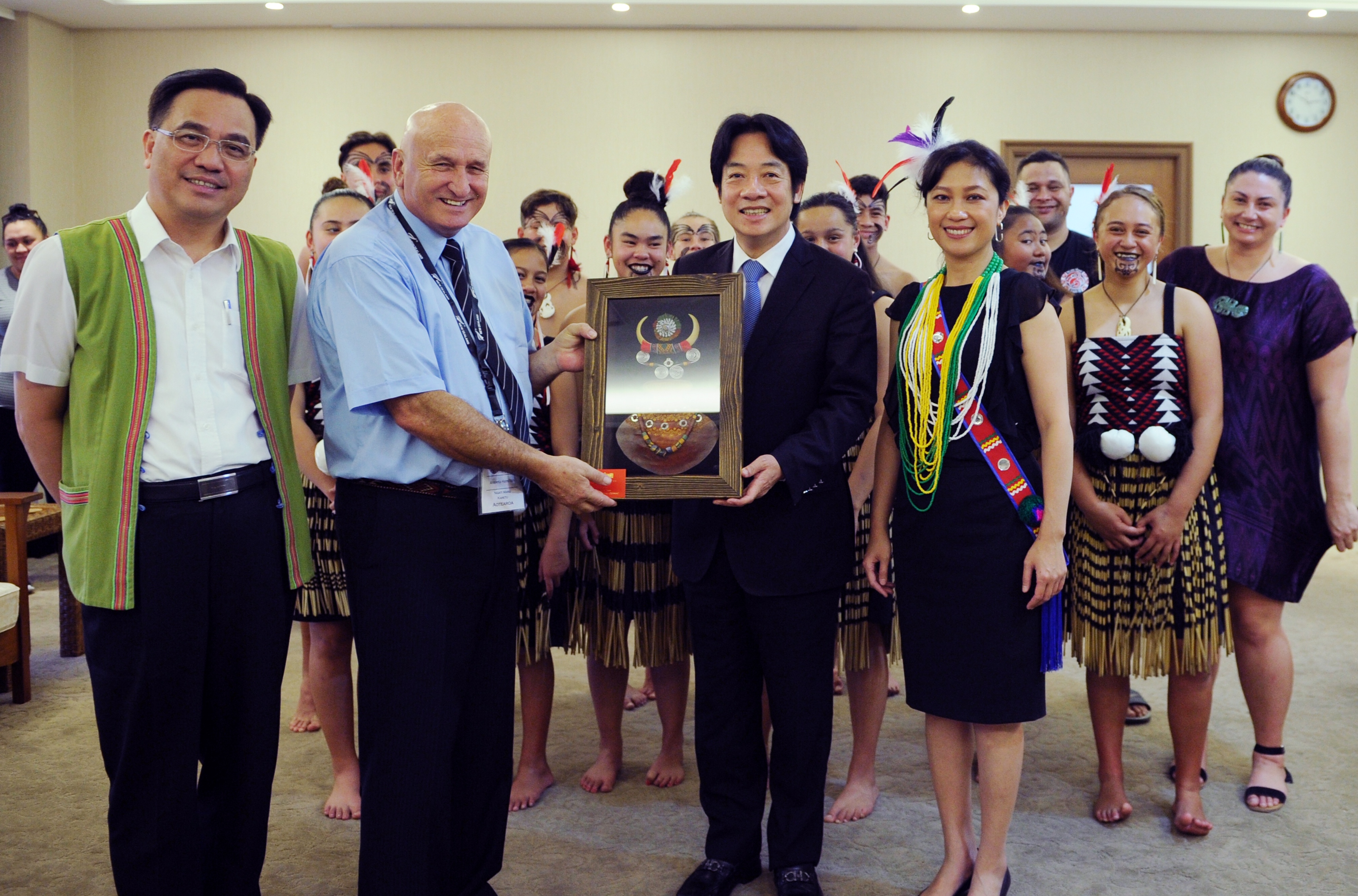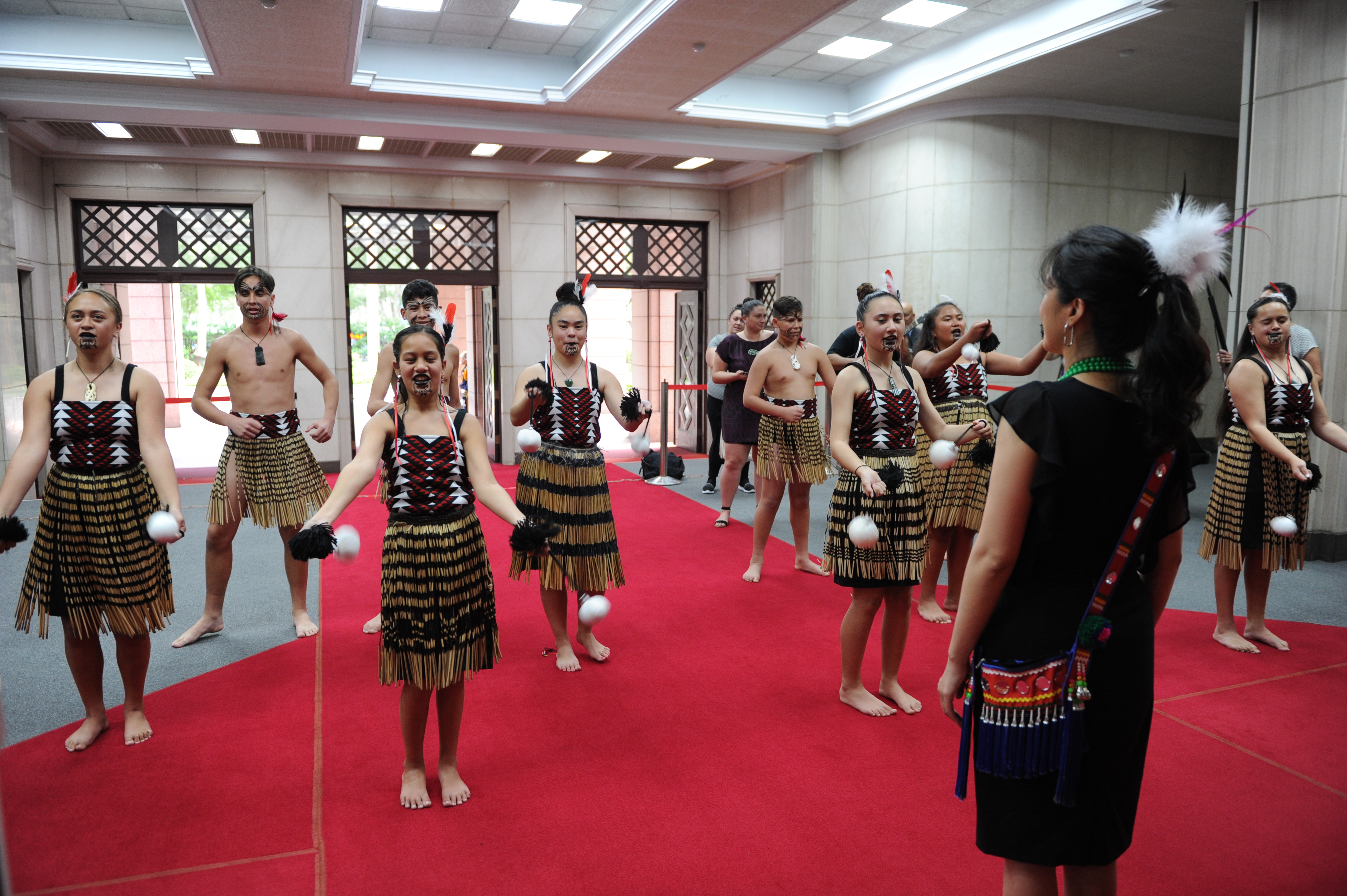 稍後,訪問團成員也在行政院中央大樓大廳表演Kapa Haka(毛利戰舞),現場氣氛熱絡。原住民族委員會表示,許多學術界研究將台灣視為南島語族的起源地,紐西蘭北島Ngāti Manu毛利部族也認為台灣原住民族與毛利族人具深遠的關係,並認為台灣是「一切的發源地」。台、紐原住民族的語言及文化有高度相似性,因此,原民會非常支持「台紐原住民族青少年文化尋根(Hawaiki Nui)計畫」,全力協助參訪行程的各項安排。
