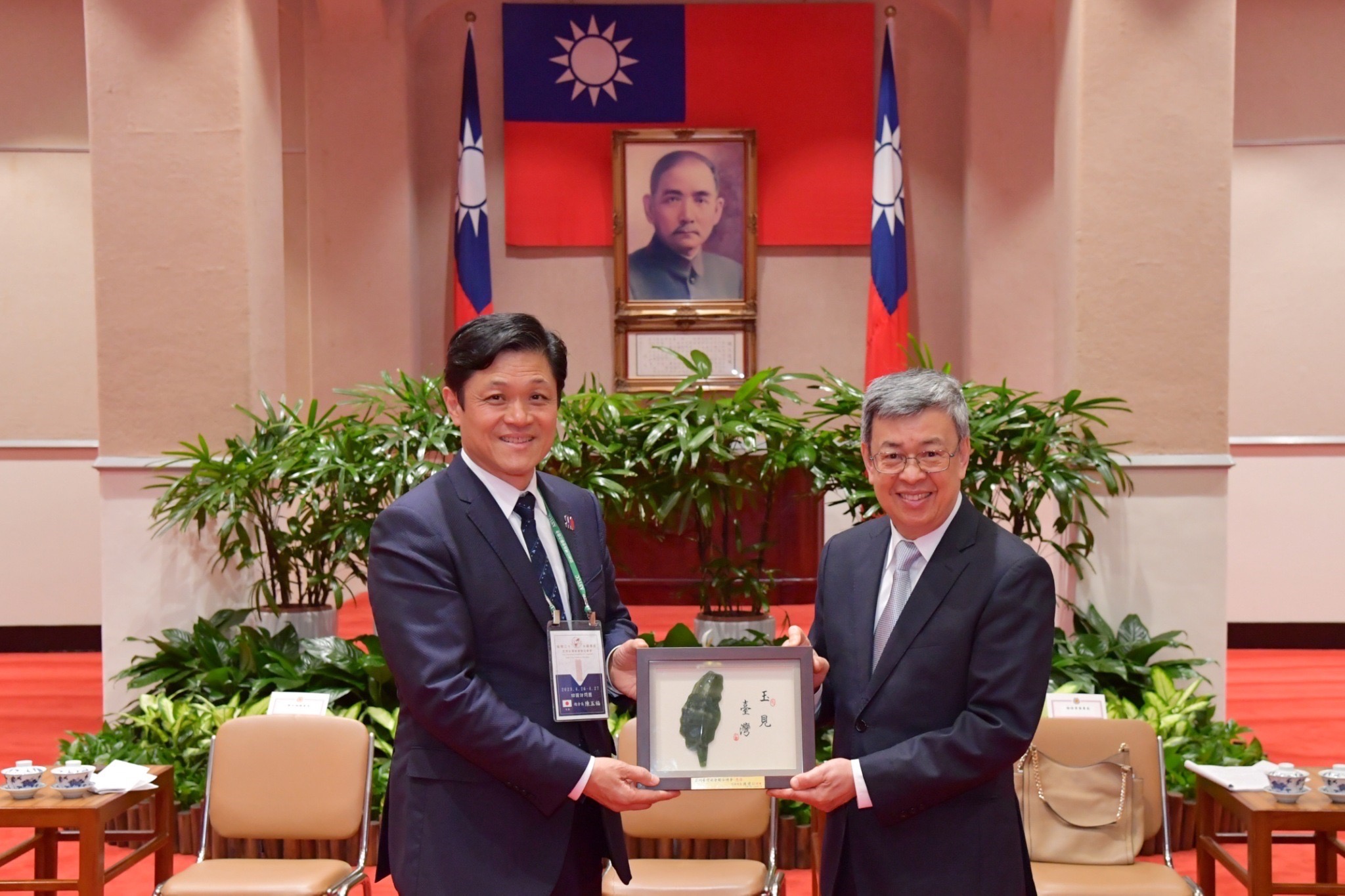 訪賓一行由僑委會委員長徐佳青陪同,前來行政院拜見陳院長,經濟部政務次長陳正祺也在座。陳總會長致贈院長「金玉滿堂,吉祥如意」–水琉璃紀念牌,陳院長則回贈陳總會長「玉見臺灣」-玉石立體雕刻,雙方並合影留念。