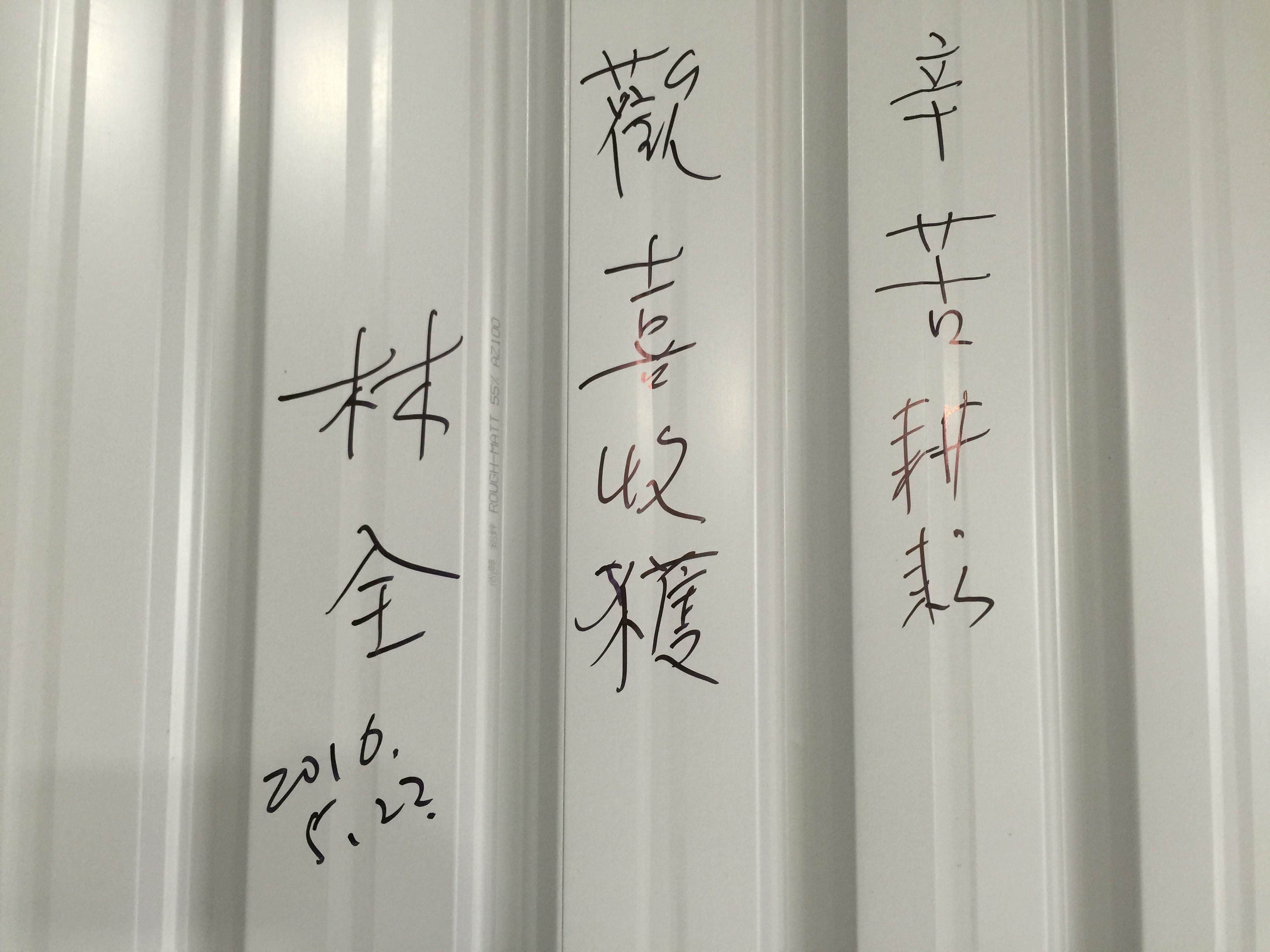 隨後,林院長在現地視察時應農民要求,在尤惠璋農友的農舍題下「辛苦耕耘、歡喜收穫」。
