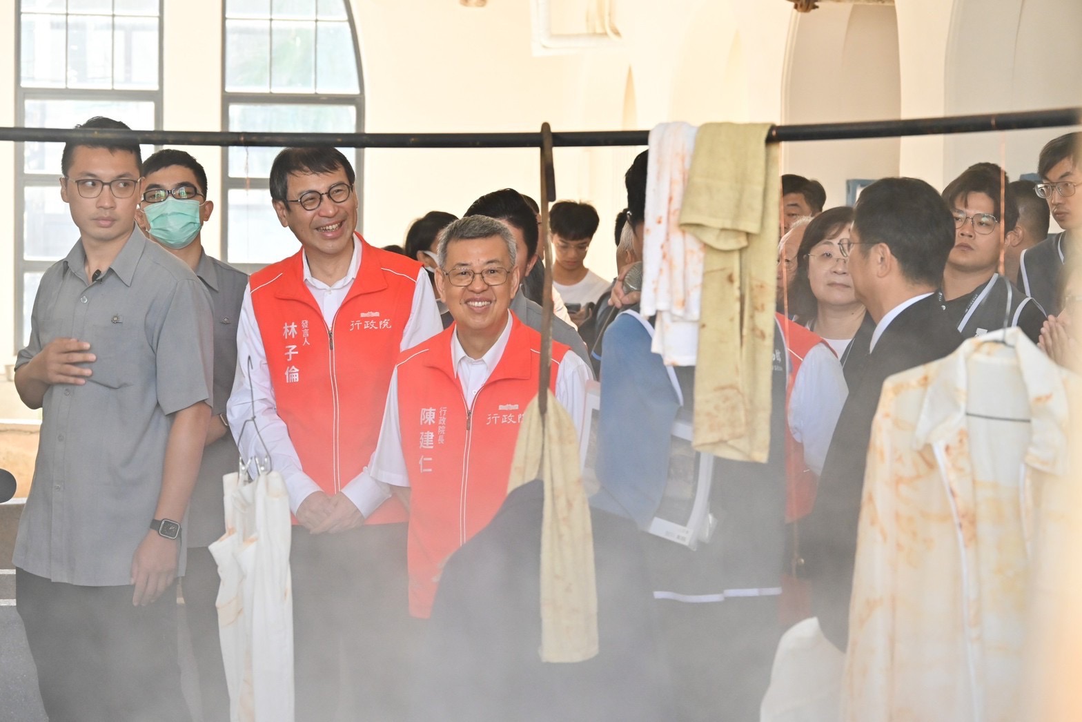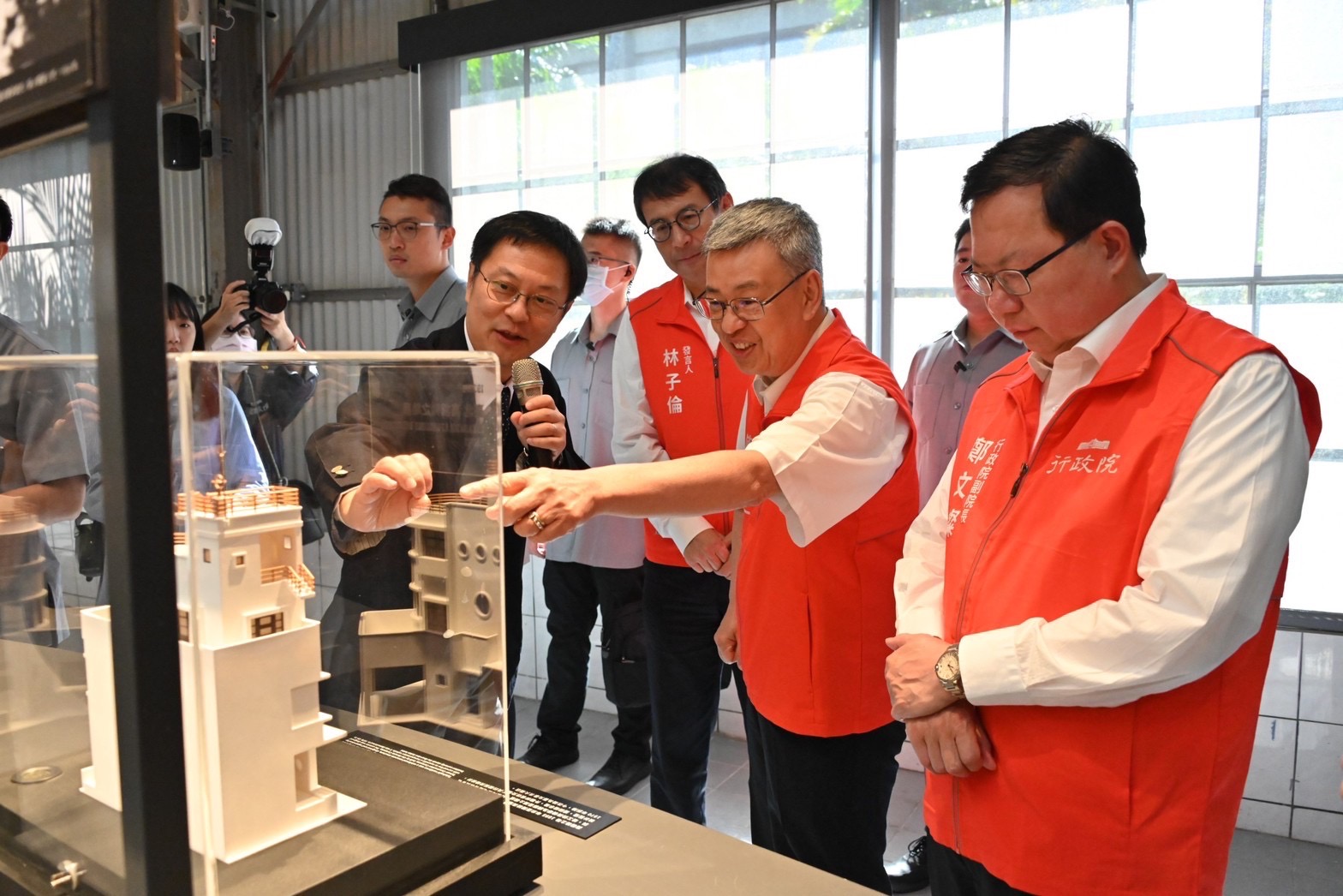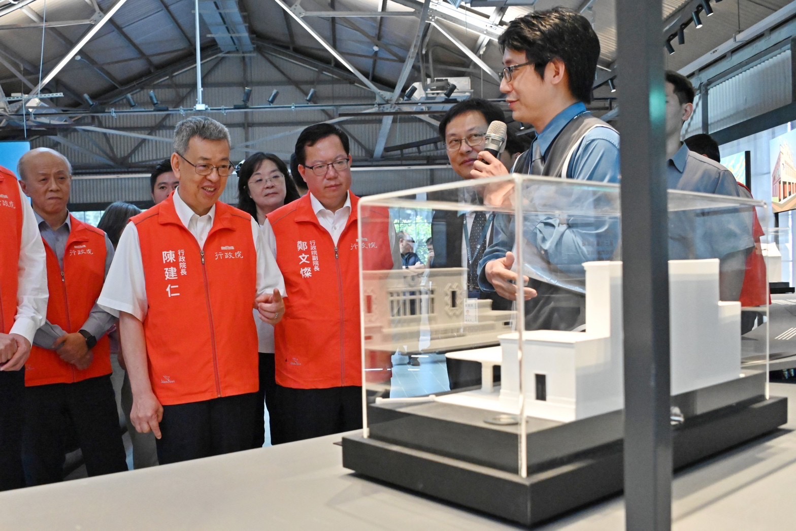 此行,陳院長首先聽取國家鐵道博物館籌備處鄭銘彰主任簡報「活的鐵道博物館進行式」,了解臺北機廠員工澡堂轉型為展示場館的發展歷程。致詞結束後,陳院長與鄭文燦副院長、行政院林子倫發言人、文化部徐宜君次長、交通部胡湘麟次長等人參觀《氤氳時代》員工澡堂常設展,逐一觀看第三代臺北車站模型、中央浴池的再現職工生活展區,以及文資保存古蹟修復展區,聽取中央通風器介紹、文資修復原則,以及結合藝術創作活化古蹟的理念;最後,一行人也於中央浴池前合影留念。