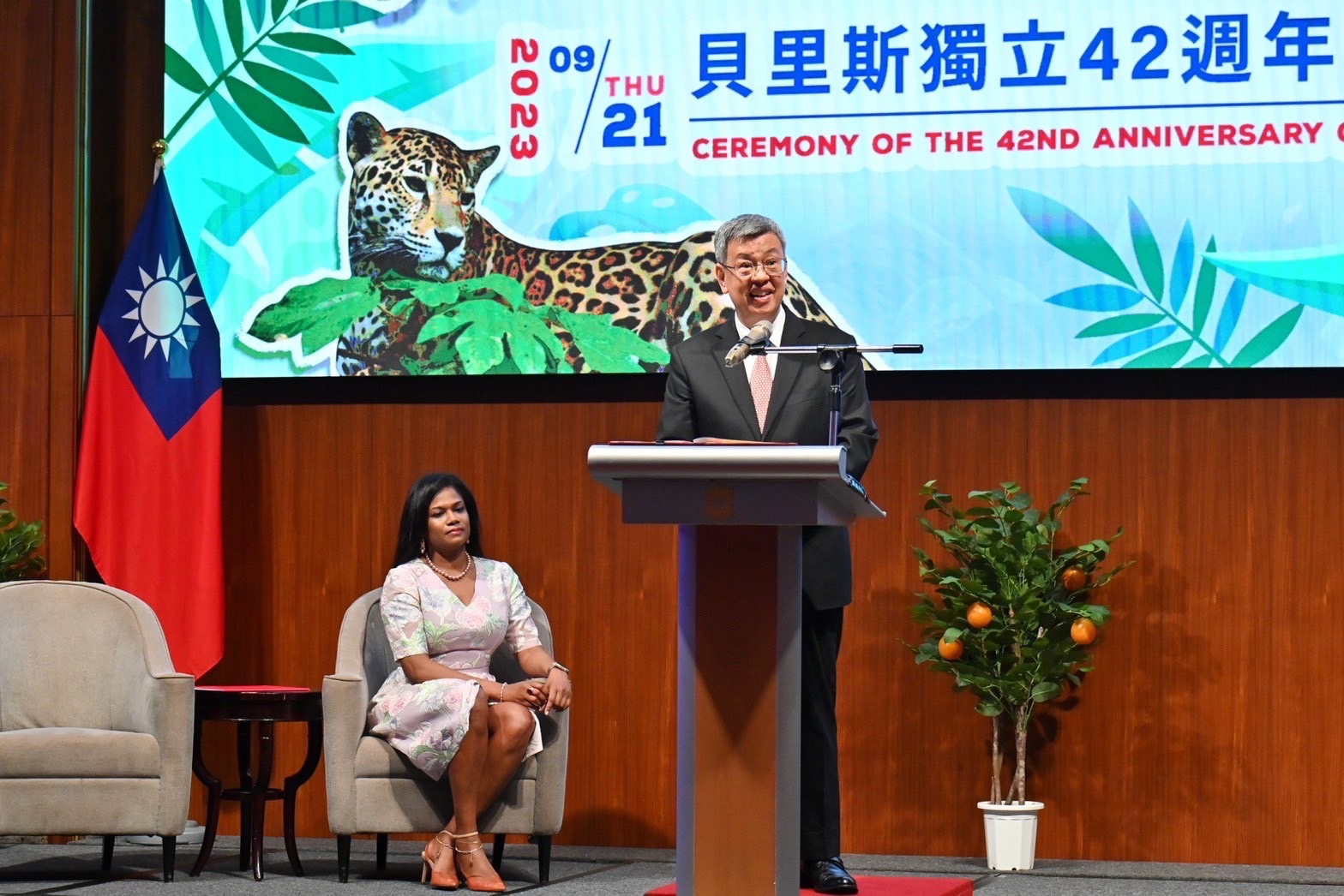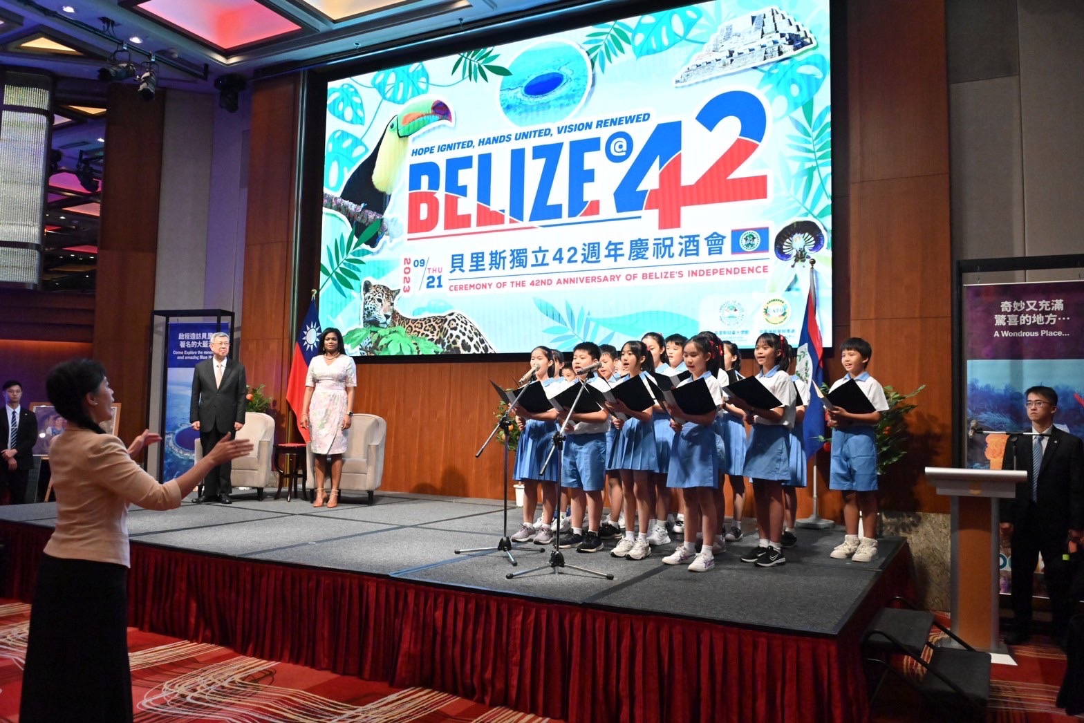 慶祝酒會首先由貝里斯學生致祝禱詞,以及臺北市日新國小學生演唱中華民國與貝里斯國歌。隨後,院長致詞時指出,他很榮幸受邀參加中美洲友邦貝里斯獨立42週年紀念日慶祝酒會,謹代表臺灣政府及人民向貝里斯政府及人民表達最誠摯祝賀,祝福貝里斯生日快樂。院長表示,臺灣與貝里斯建交34年來,兩國逐步發展出深厚的合作夥伴關係,在基礎建設、醫療公衛、農業技術、環境永續、婦女賦權、文化教育及資通訊等領域皆密切合作。近年來世界各國面臨嚴重特殊傳染性肺炎疫情、俄烏戰爭爆發、全球通膨與氣候變遷等諸多挑戰,但臺貝兩國彼此相互扶持、共度難關,不僅使許多貝國人民生活條件獲得改善,更加深兩國患難與共、堅定不移的兄弟情誼。