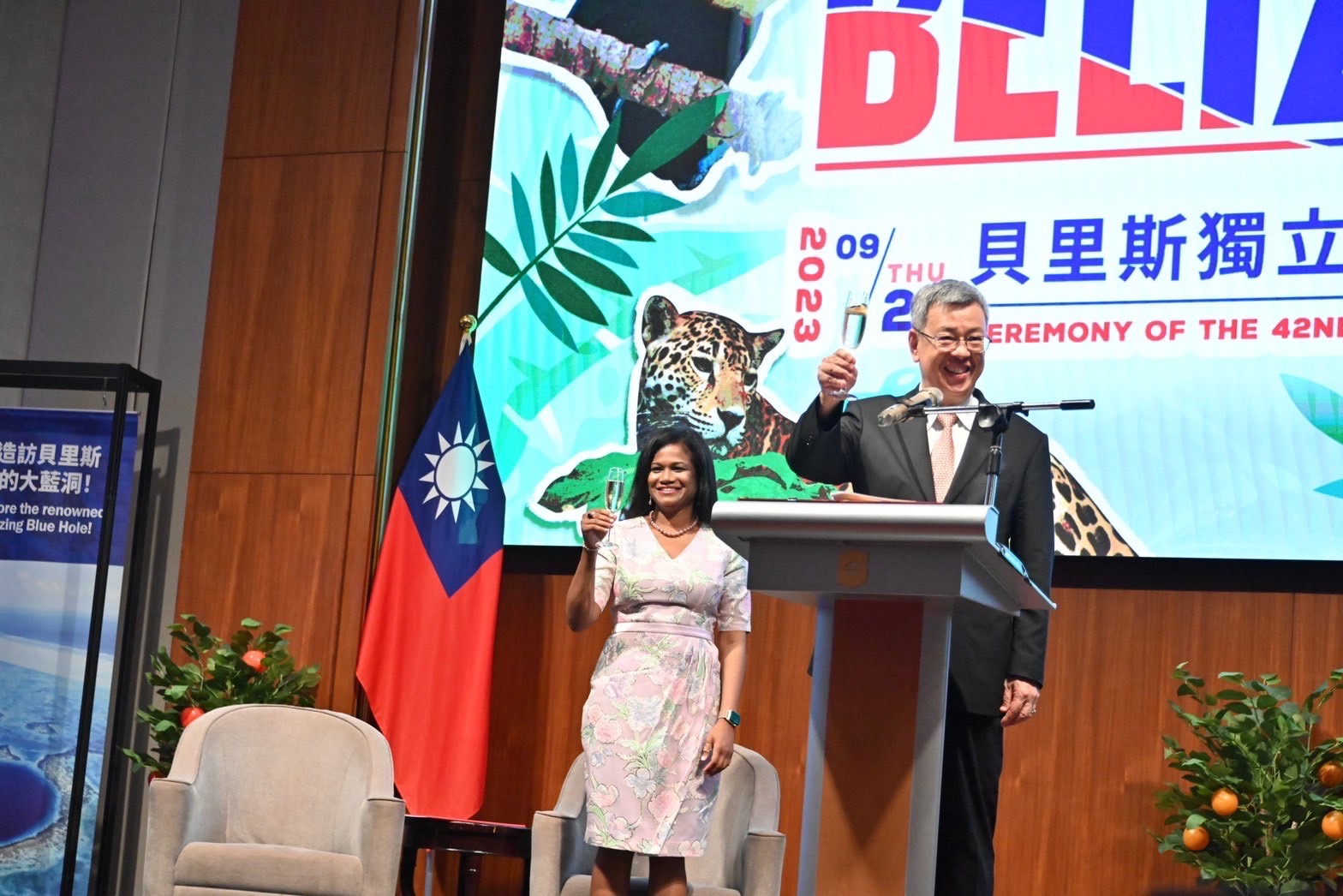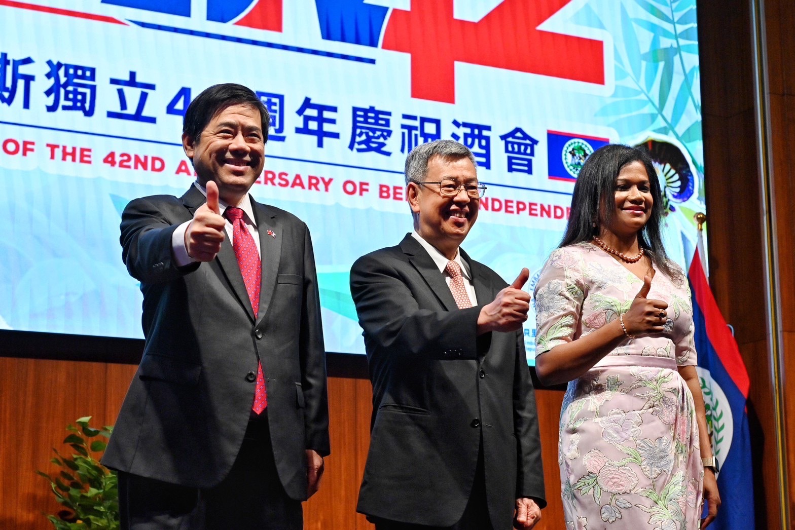 行政院長陳建仁今(21)日出席「貝里斯獨立42週年紀念日慶祝酒會」時表示,臺貝建交34年來,彼此相互扶持,兄弟情誼堅若磐石,不僅兩國高層互訪頻密,在基礎建設、醫療公衛、農業技術、環境永續、婦女賦權、文化教育及資通訊等領域也密切合作,去(2022)年貝國對我國輸出貿易額更較2021 年大幅成長317%。此外,貝里斯多年來也情義相挺,堅定聲援及支持臺灣國際參與,他要代表臺灣政府及人民向貝里斯政府致上誠摯謝忱,至盼兩國為繁榮共好持續攜手前行,並祝福臺貝邦誼永固。