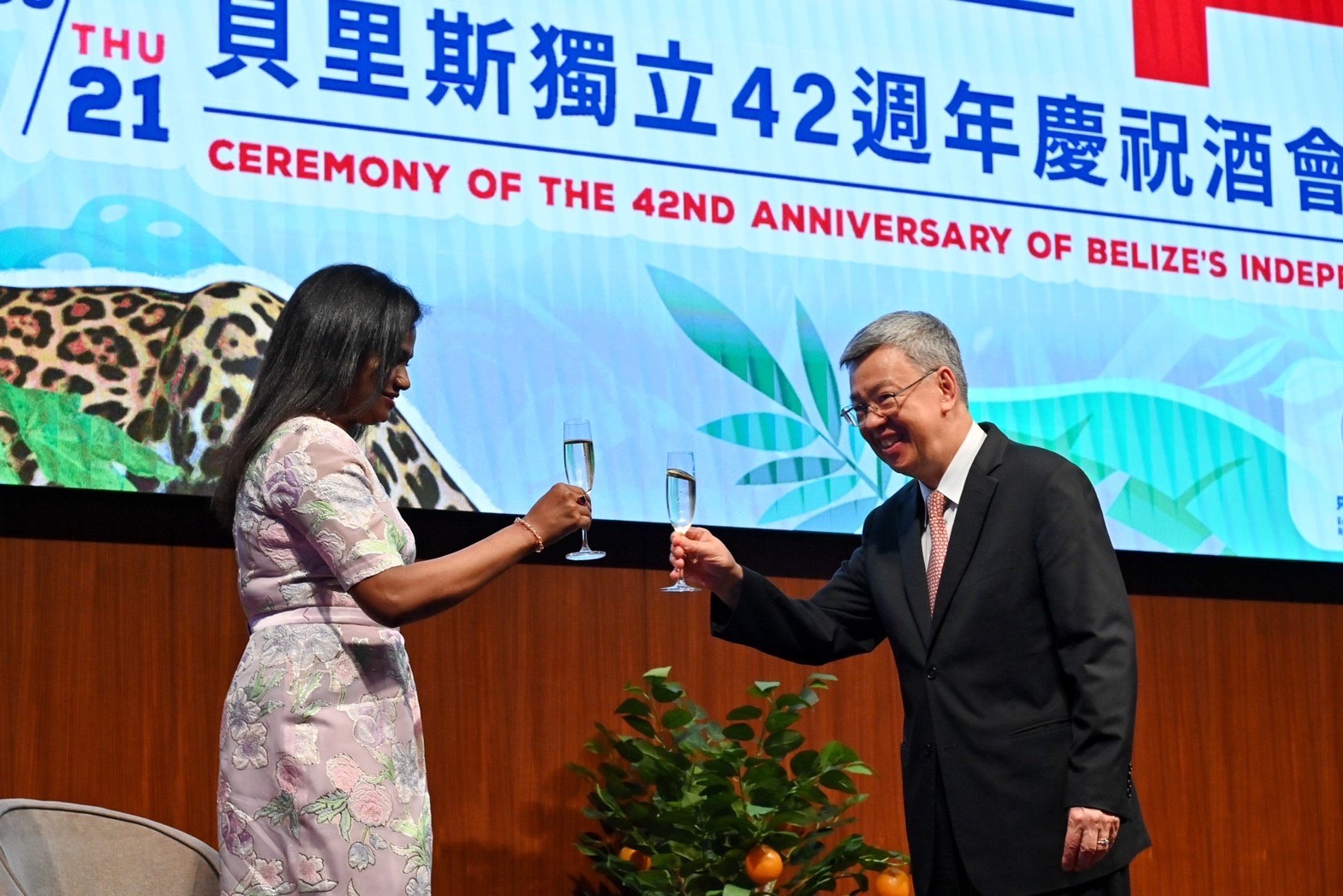 陳院長再次代表臺灣政府及人民向貝里斯政府致上誠摯謝忱,並引用貝里斯獨立42週年的慶祝主題「點燃希望、攜手向前、嶄新願景(Hope ignited, hands united, vision renewed)」,以及重申蔡英文總統的信念:「我們會持續與貝里斯政府堅定地走在自由民主的道路上,為自由民主前行,為和平穩定前行,為繁榮共好攜手前行。」最後,院長邀請所有與會貴賓共同舉杯,敬祝貝里斯國運昌隆、生日快樂,臺貝兩國邦誼永固。