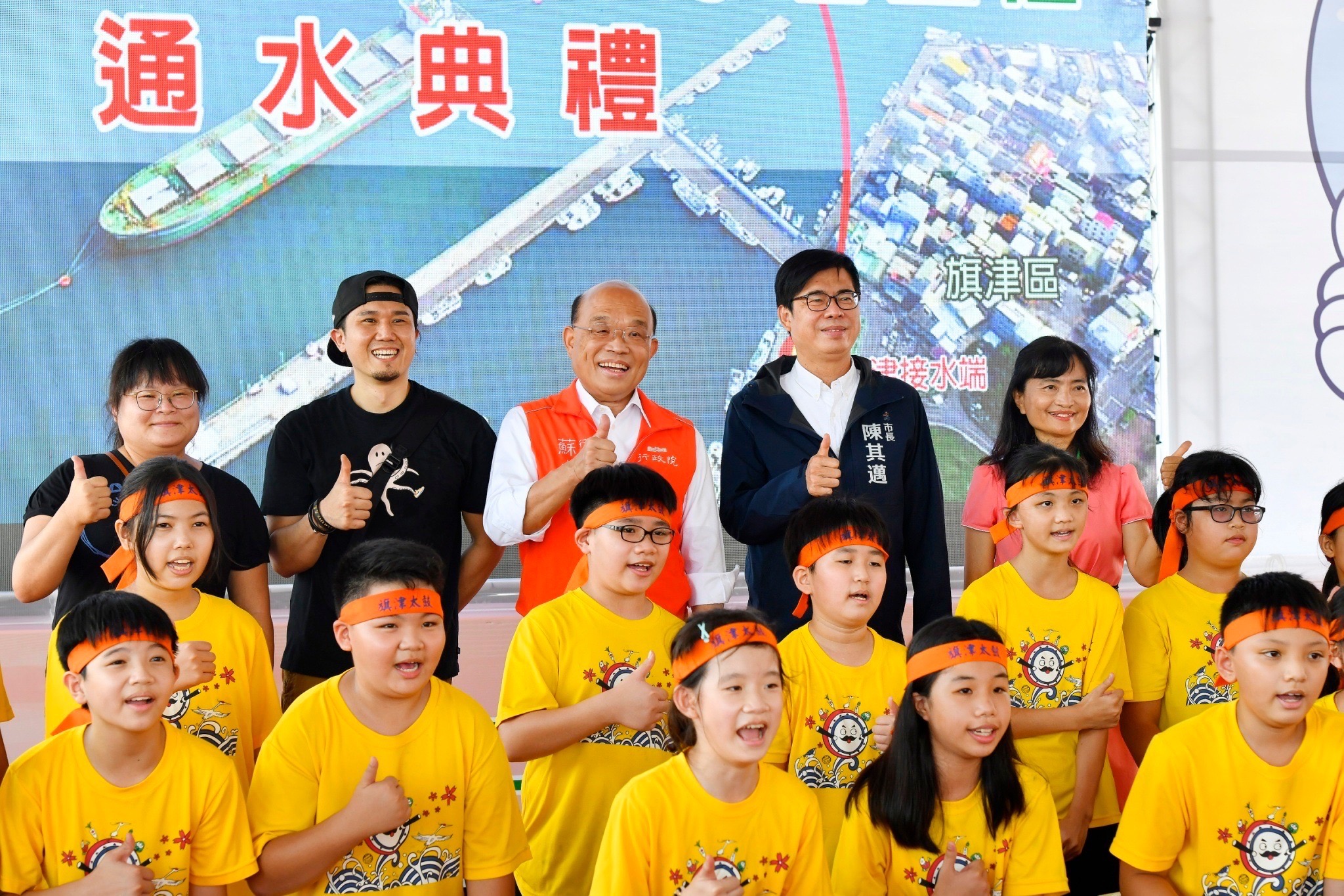 此行,蘇院長與陳市長等貴賓首先欣賞旗津國小太鼓隊的開幕表演,小朋友們精神抖擻、動作齊一,展現優異的演出,博得院長與貴賓們喝采,院長並與小朋友們一同合影留念;隨後,蘇院長聽取台灣自來水公司胡南澤董事長簡報旗津第2條送水管工程興建歷程,並觀看工程紀錄短片。
