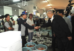 行政院長吳敦義關心春節前各項農漁產品及蔬果供應情形,今(10)日清晨五時特別前往台北漁產公司漁市拍賣市場及台北農產公司果菜拍賣市場視察。吳院長在行政院秘書長林中森、農委會主委陳武雄及台北市長郝龍斌的陪同下巡視各拍賣市場,慰勉農漁蔬果業者的辛勞,並在探詢各項農漁產品價格及供應狀況後表示,農漁產品供應價格平穩、貨源充足,無論對生產者或消費者而言,都能快快樂樂過新年,院長並向大家拜年,祝福大家生意成功發大財。