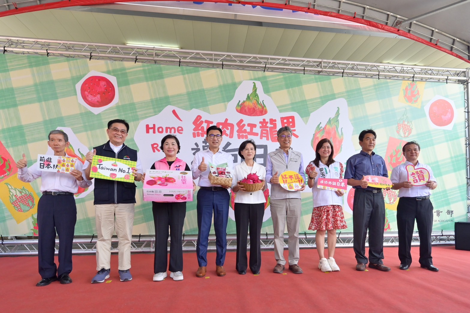 行政院副院長鄭麗君今(3)日出席「Home Run Go紅肉紅龍果邁向日本」外銷日本首運記者會時表示,非常高興來到臺中市豐原參加紅肉紅龍果首批出口的啟運記者會,見證紅肉紅龍果即將外銷日本歷史性的一刻,鄭副院長說,今天迫不及待要來跟日本的好朋友分享臺灣民眾包括自己最愛吃的紅龍果,為了讓日本朋友在市場就能買到臺灣的紅肉紅龍果,臺灣努力了八年,是一個漫長的過程,非常感謝參與相關單位的朋友,包含生產的農友、輔導單位農業部、產業界及貿易商,大家共同的努力。