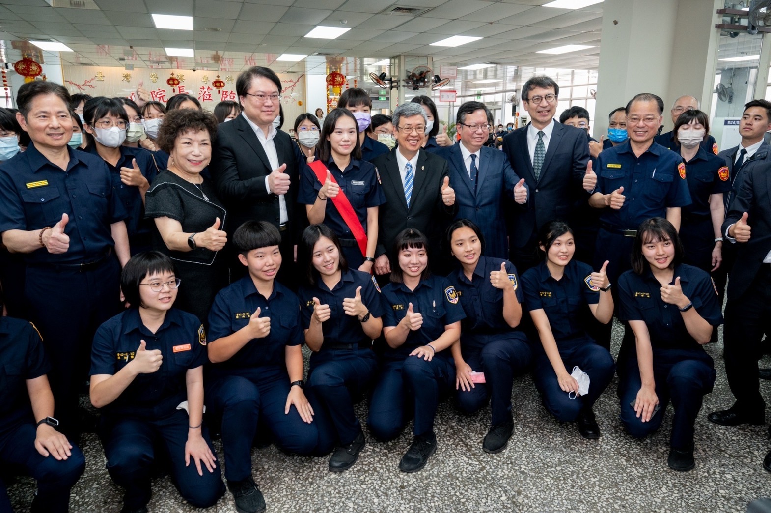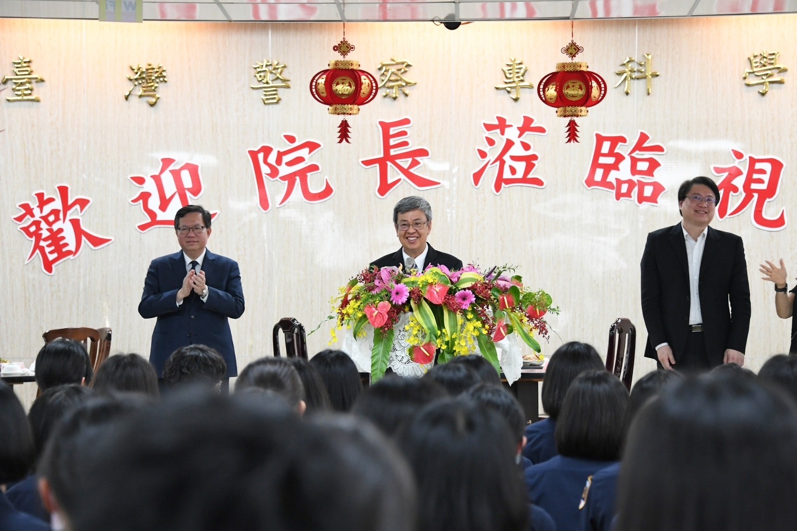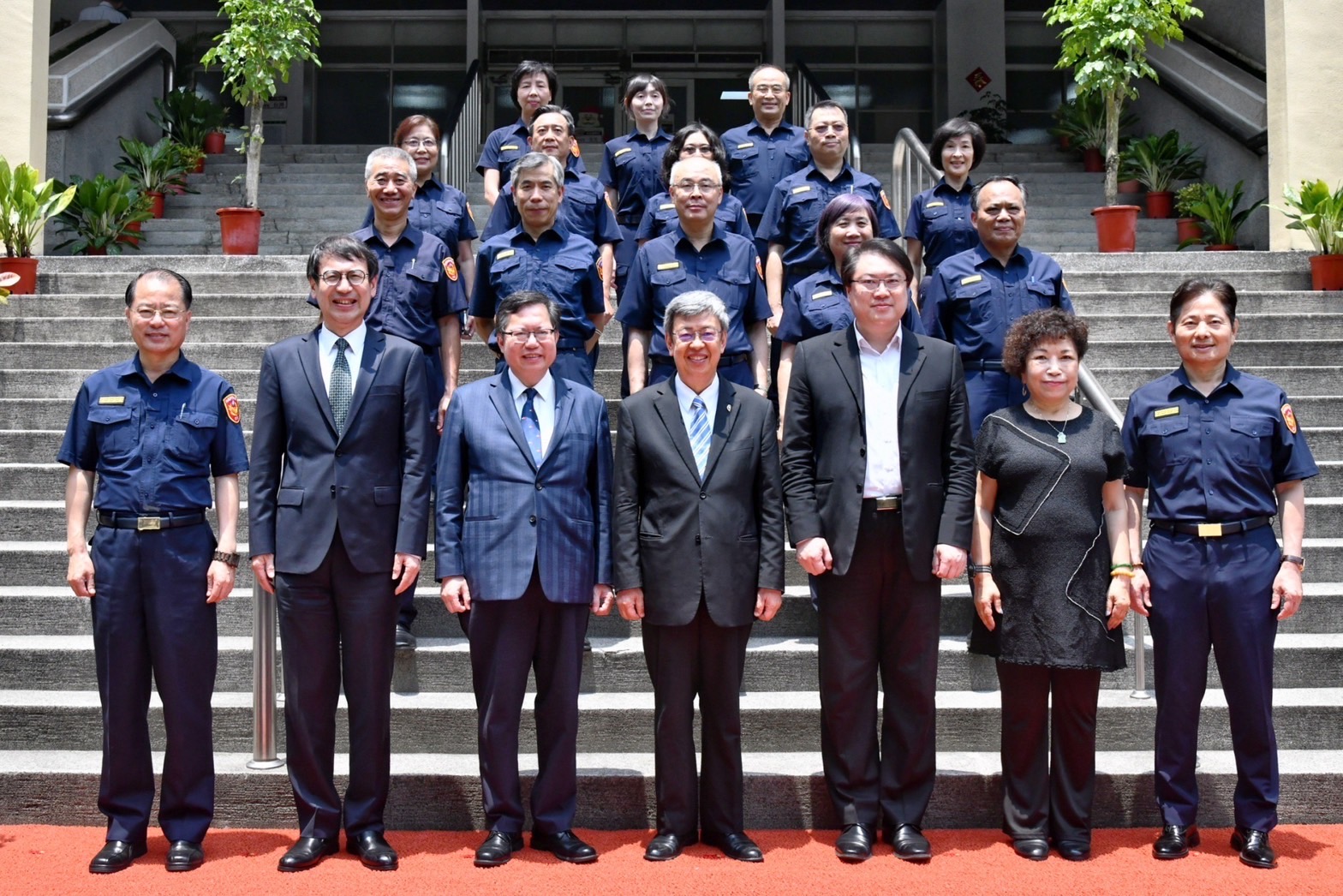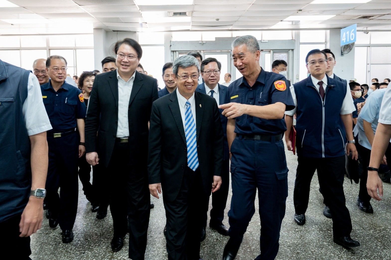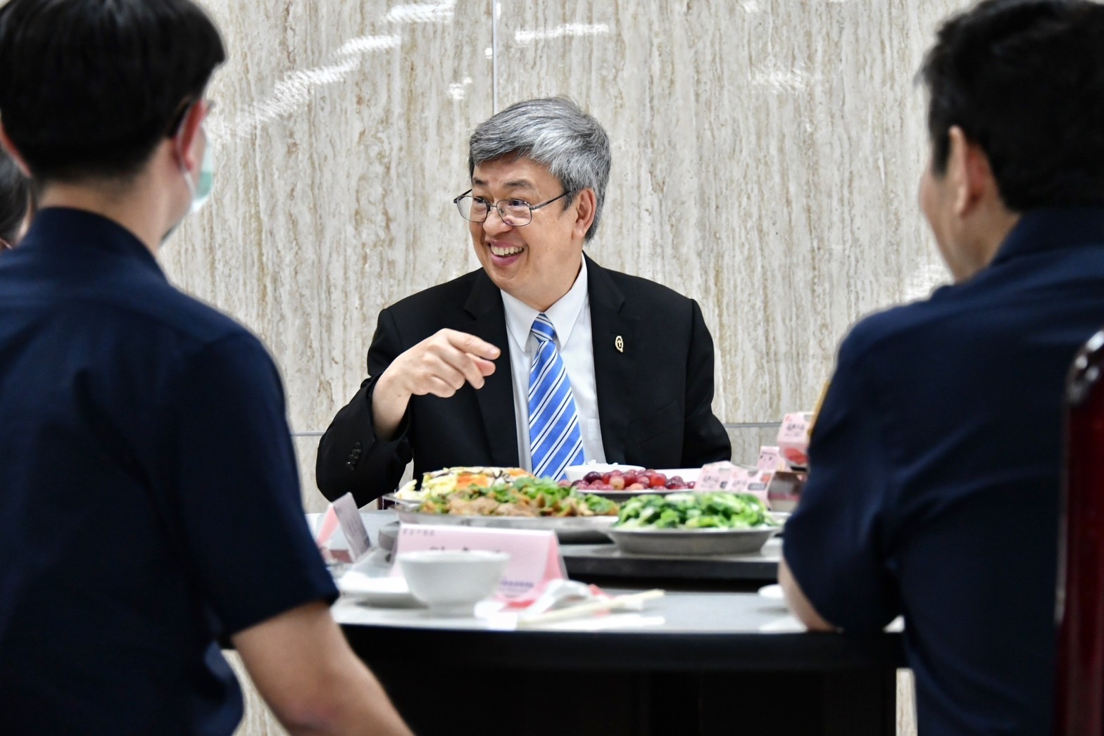 陳院長到場後,偕同鄭文燦副院長與林右昌部長等人先視察警專學生宿舍大樓新建工程,關切工程進度與學生住宿品質,隨後前往餐廳了解學校供餐情形及伙食狀況,並與學生及教職員一同享用美味午餐;用餐結束後,一行人於餐廳外與警專教職員合影留念。