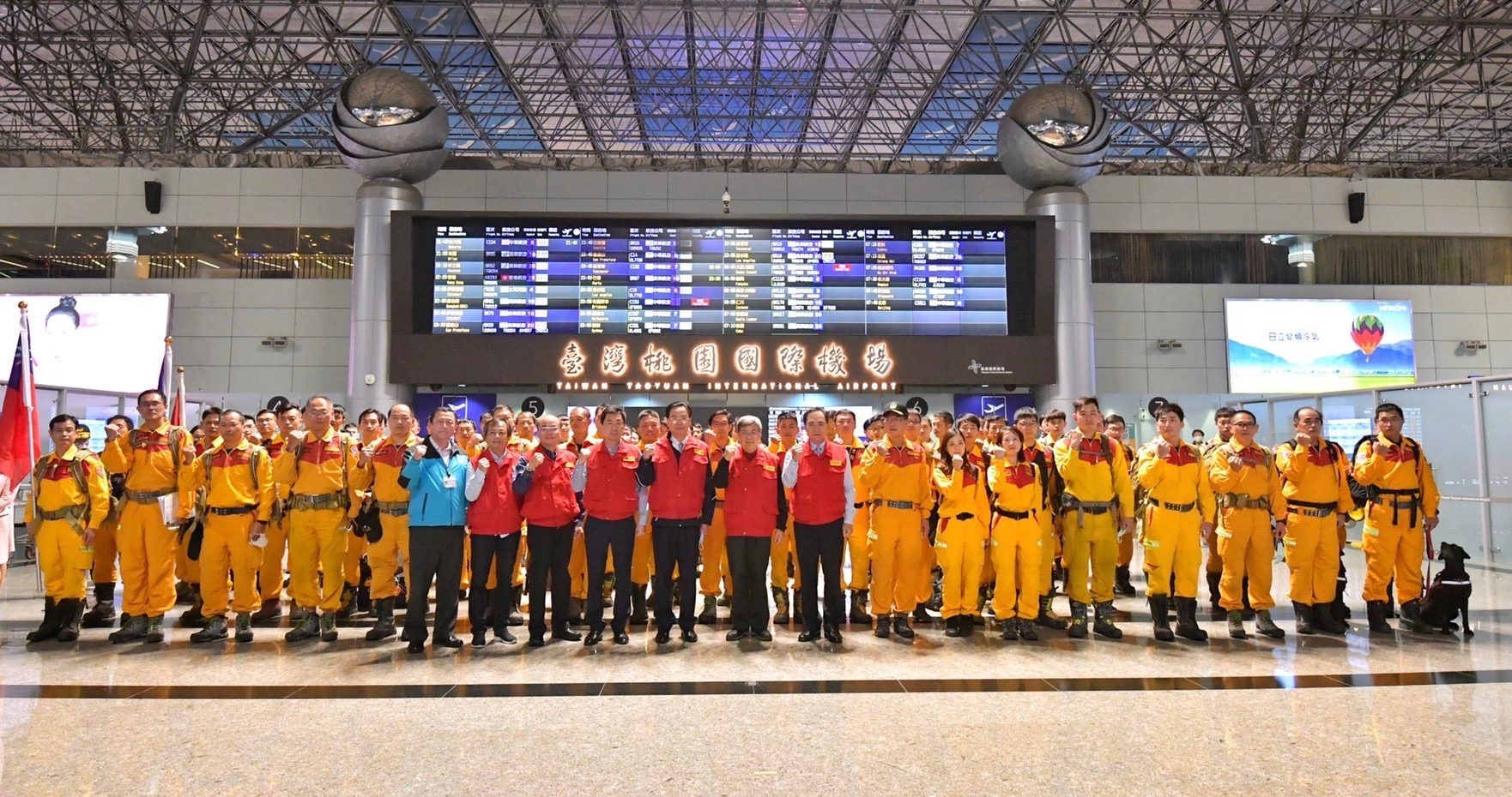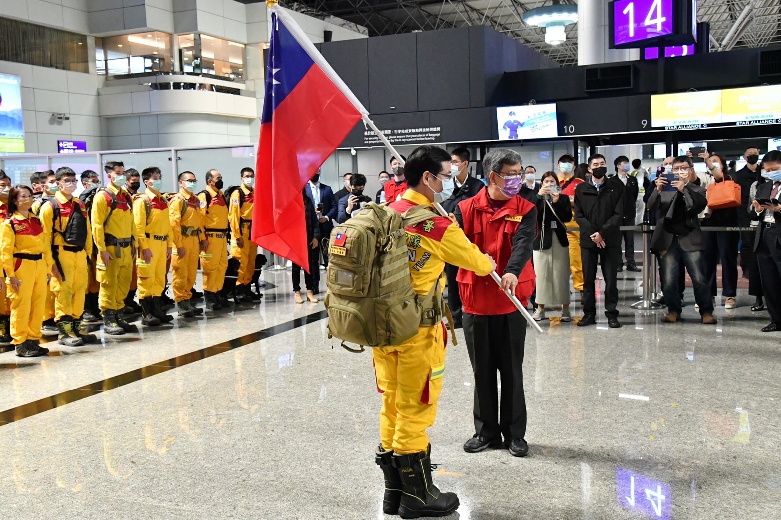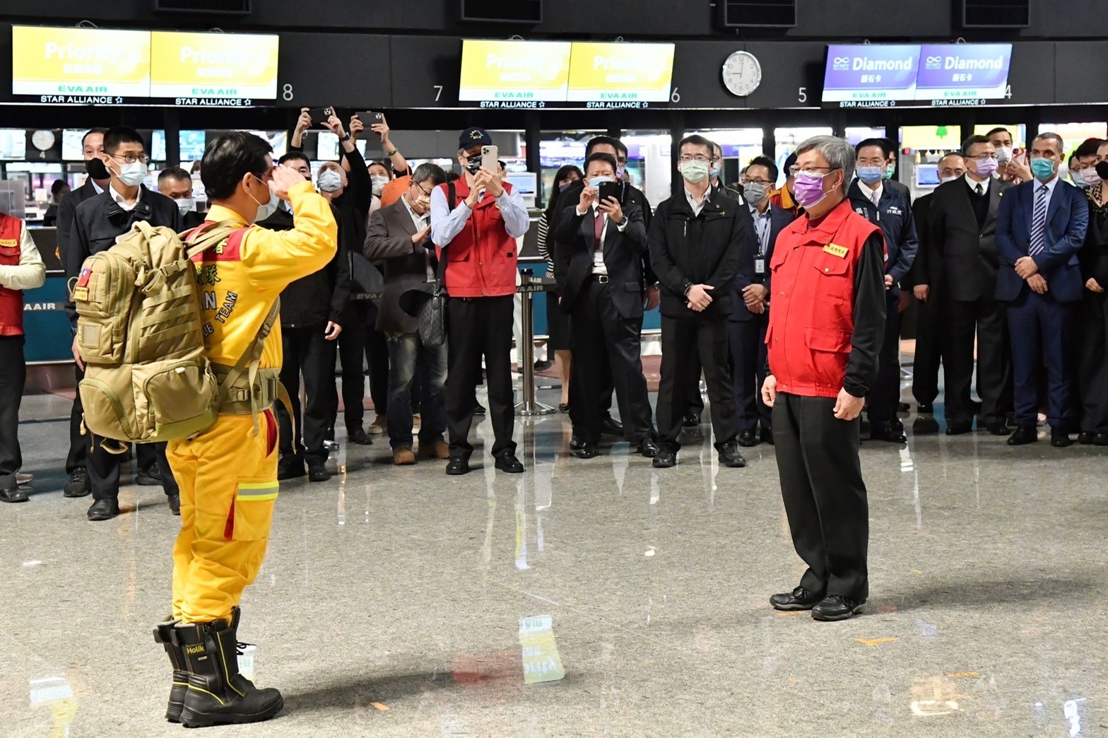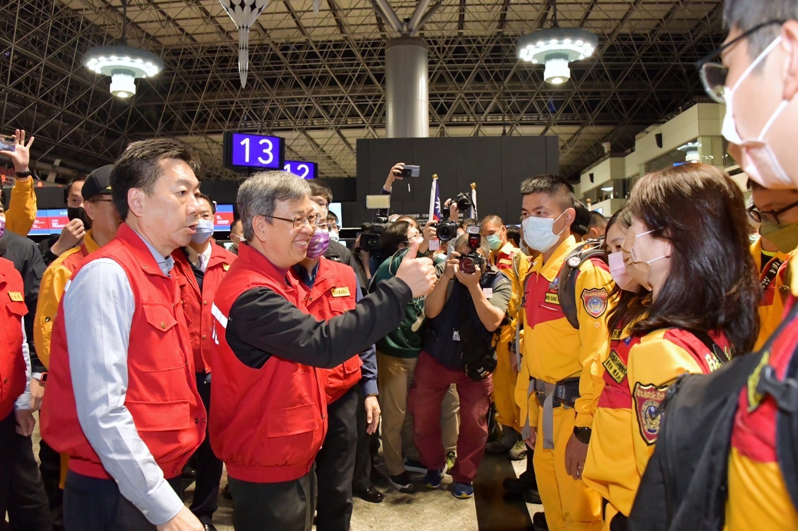 陳院長抵達桃園機場後,隨即為第二梯次臺灣國際搜救隊授旗,此次亦為臺灣首次以專機方式,搭載我國國際搜救隊前往國外執行國際人道救援任務。陳院長於致詞結束後,特別與搜救隊員合影,並一同高呼臺灣加油、土耳其加油,同時也祝福搜救隊此行圓滿達成任務、平安返國。