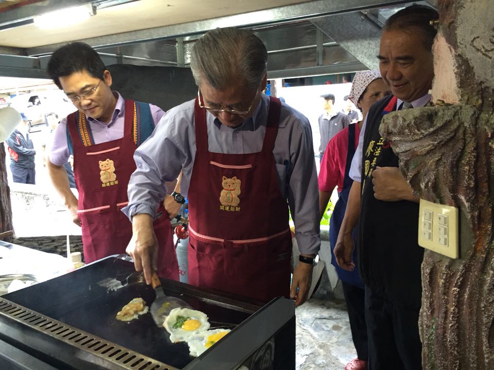 今天毛院長在關懷站親自煎製荷包蛋,更透露自己為了此行特別在家中重新練習了奶奶傳授的煎蛋功夫,完成後招呼孩童取餐入座並共進早餐,場面熱鬧溫馨。