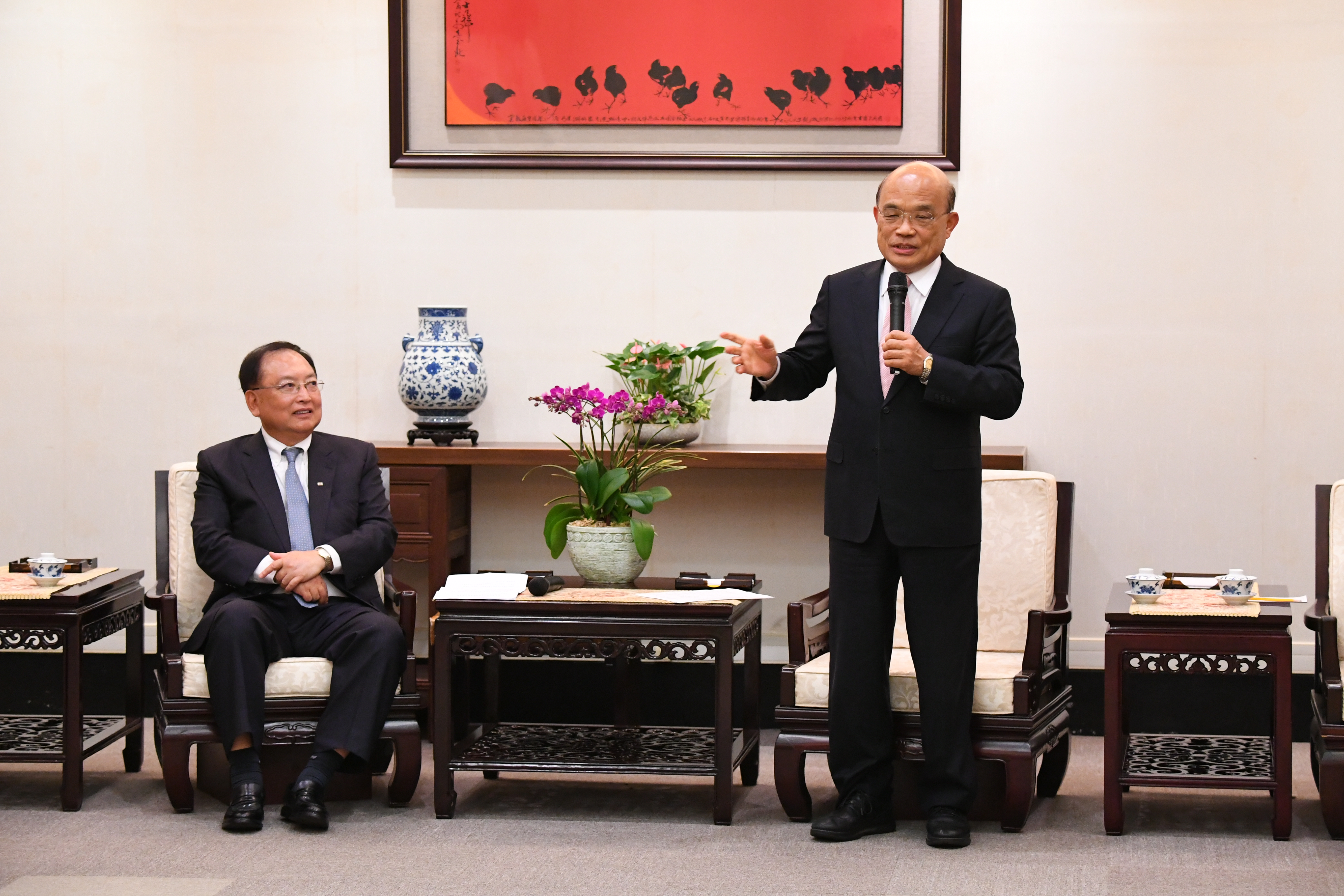 行政院長蘇貞昌今(30)日接見第28屆國家磐石獎暨第21屆海外台商磐石獎得獎企業代表,並於入場時特地一一向企業代表握手道賀。蘇院長指出,他代表政府向大家致謝,因為企業經營成功能創造就業機會,因此政府在各方面要做得好,讓大家了解「有政府、會做事」,百姓安居樂業,也能協助各行各業與自海外回國的成功企業家發揮志氣與想法來推展業務。