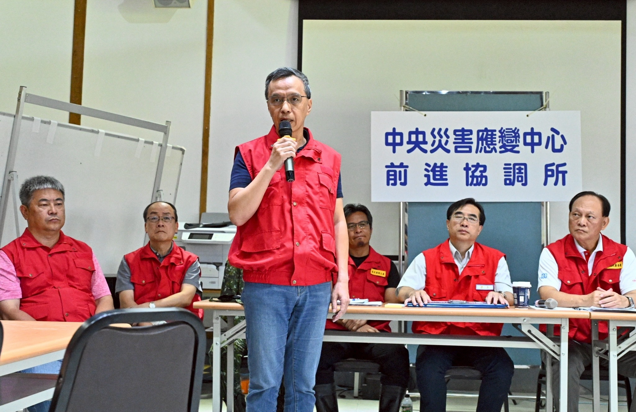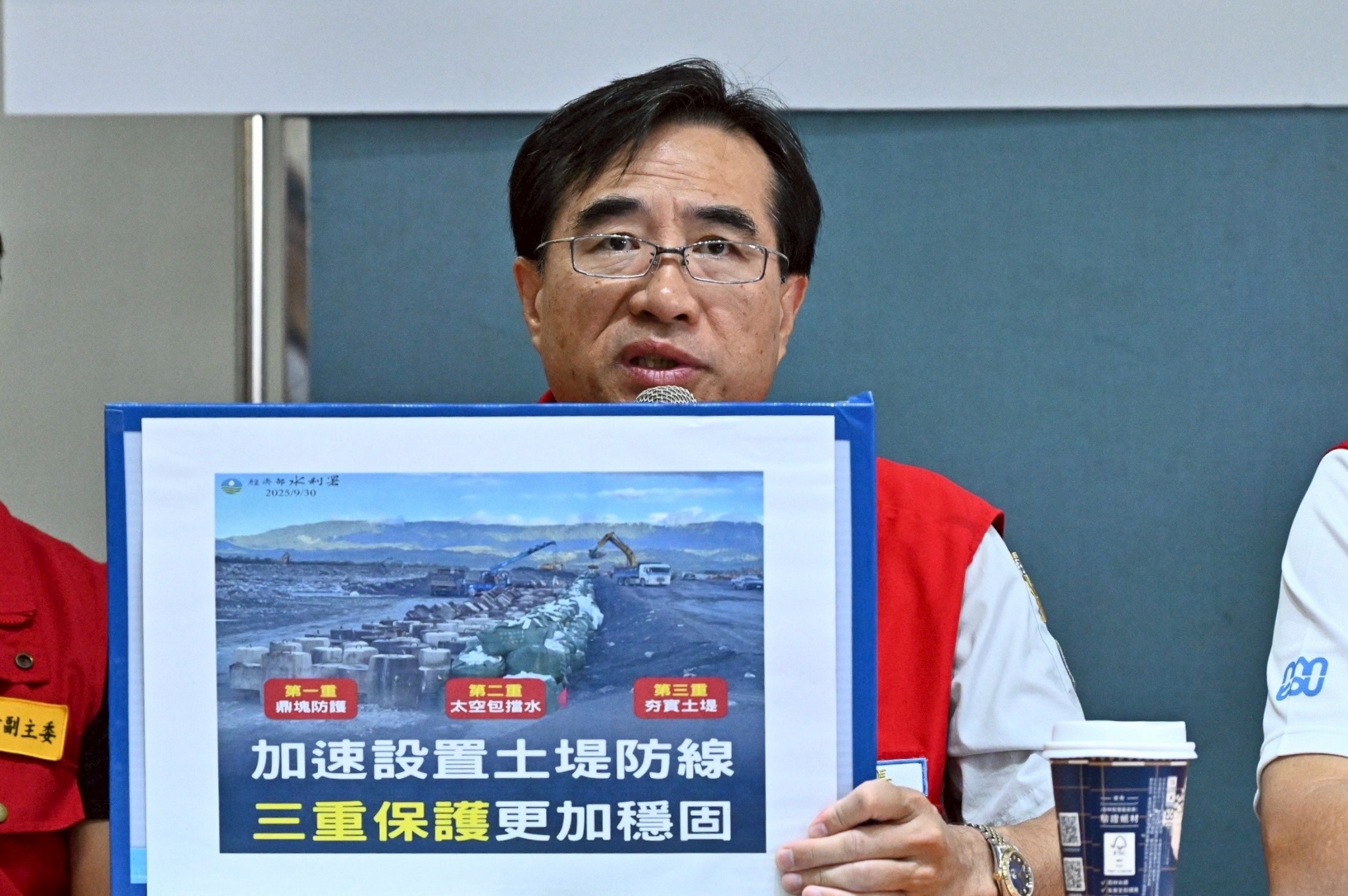 隨後,經濟部水利署林元鵬署長說明,目前首要目標是於本週六(10/4)前建構第一階段臨時土堤,高度約3公尺,後續將再加高至5公尺,相當於計畫原水位高度,以提供保護措施,目前已動員近500名人力及267部機具,其中包含109部怪手同時進入河道執行作業;截至昨日下午4時,已完成1,300公尺,約占整體45%,平均每日可施工約500至600公尺,本日修復堤段將可進入光復市區佛祖街下方,完成率接近7成。