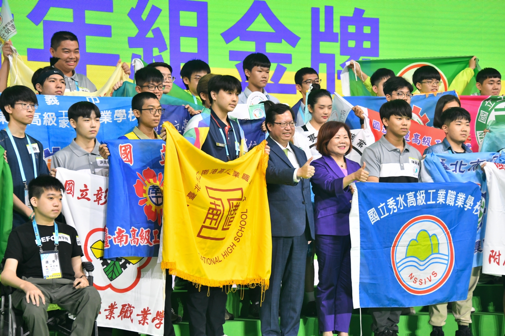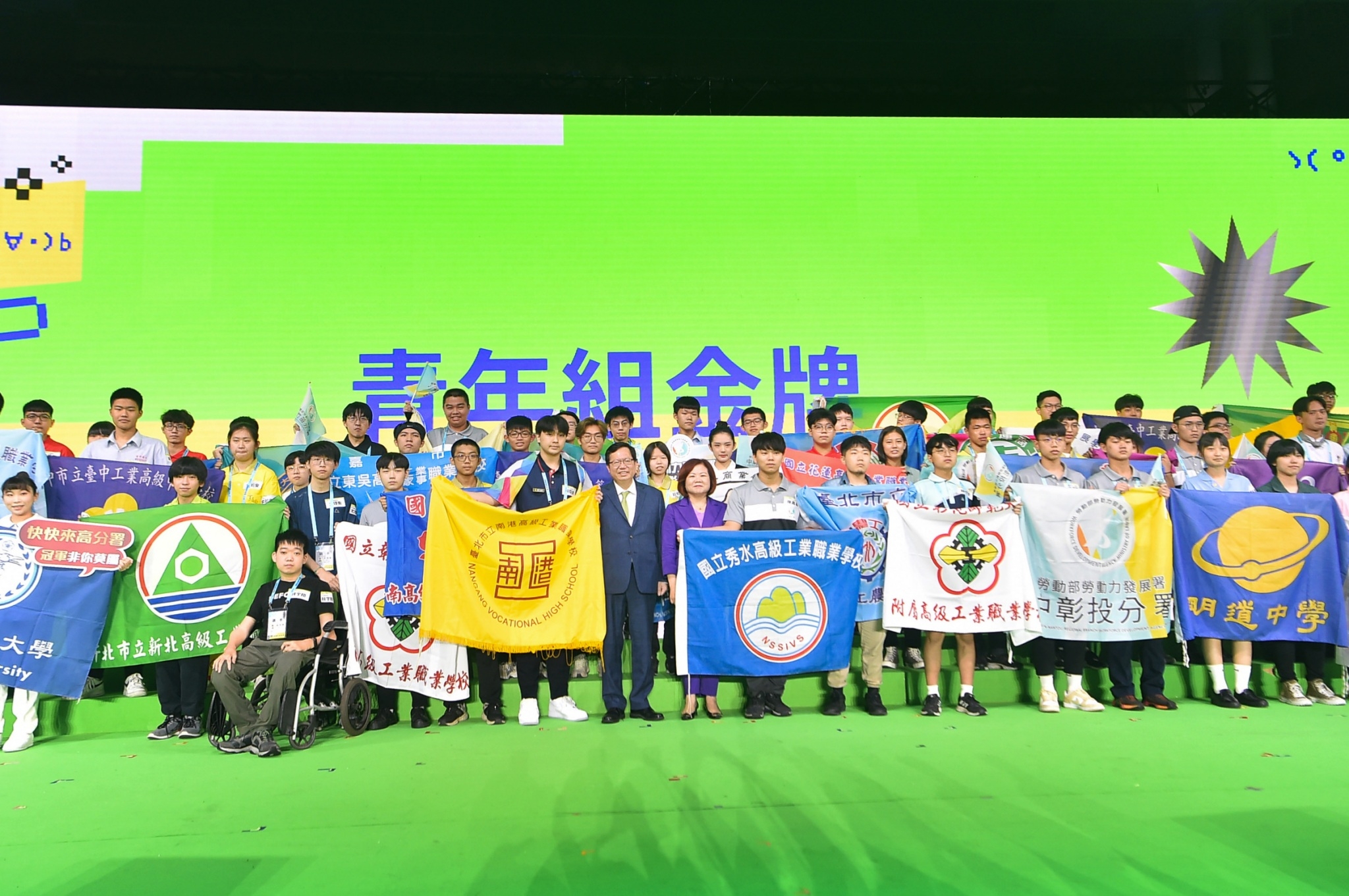 此行,鄭副院長到場後,首先觀賞本屆全國技能競賽花絮影片,並於致詞結束後,於走道中央按下燈柱臺按鈕,舞臺螢幕隨即揭曉青年組金牌獲獎名單;隨後,鄭副院長、勞動部許銘春部長與55個職類62位青年組金牌獲獎選手一同合影留念,選手們並開心展示各自學校校旗,場面熱絡。