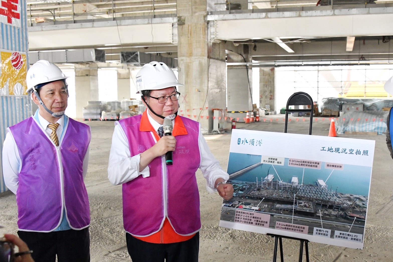 鄭副院長抵達水頭港區之後,首先聽取交通部航港局葉協隆局長、金門縣政府港務處許嘉興處長分別簡報金門國內商港概況及水頭港客運中心工程進度,並於致詞後與金門縣陳福海縣長、蔡其雍議員及在場貴賓一同視察工程進度並合影留念,最後轉往目前使用中的客運中心聽取交通部航港局施惠真副組長簡報金門小三通最新執行情況。
