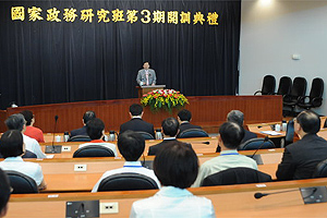 劉院長指出,國家政務研究班自民國83年開始辦理,他曾擔任講座、副班主任到現在的班主任,一路多次參與,當中研究班也更換了多次名字,最早期為「國建班」,現在則更名為「國家政務研究班」。院長表示,辦理研究班的目的,是為了培育具宏觀思維、國際視野、體察時代演進變化,以及帶動國際政經發展趨勢,並符合現代領導能力的高級文官。經由國政班的訓練,可以讓經常處於例行性業務的公務員能夠有機會接觸新的思維,培養新的眼光以及看法,對於整個國家及人民的福祉是有正面影響的。