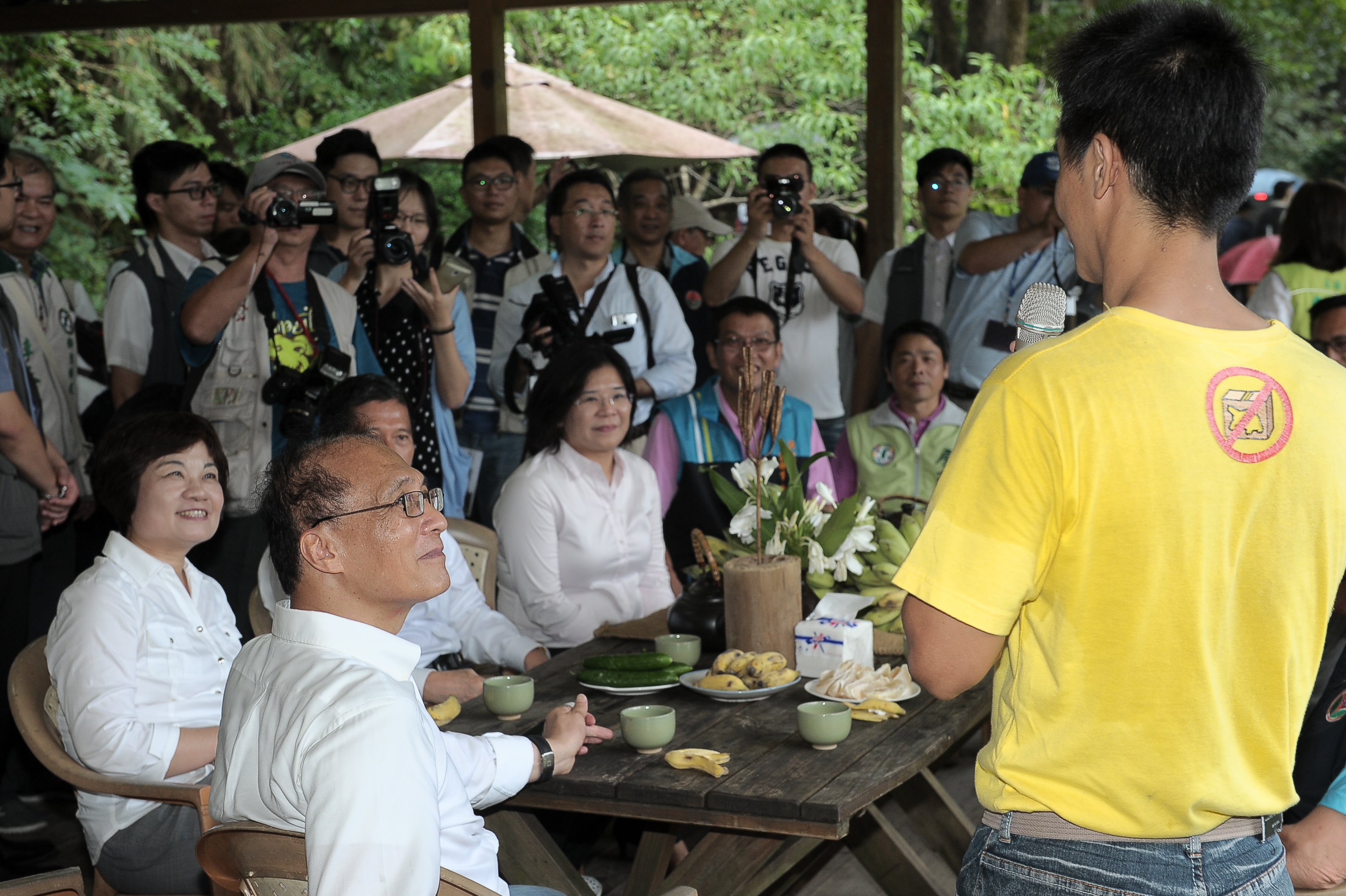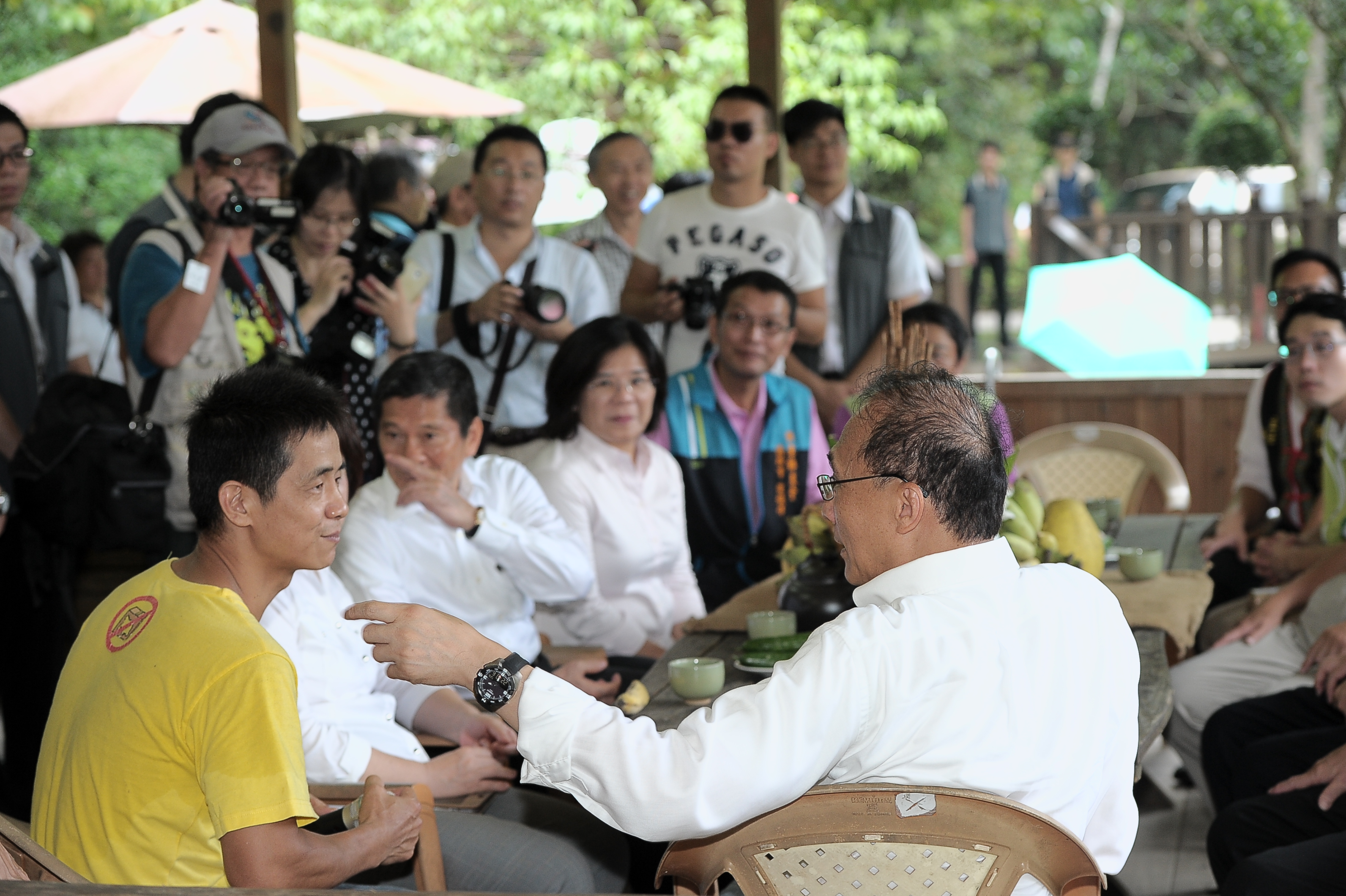 林院長參訪「獅潭紙湖農場」時,與農場主人彭文淦先生敘談,讚許其對在地產業的情感與投入,並聆聽鄉親對地方發展的看法。