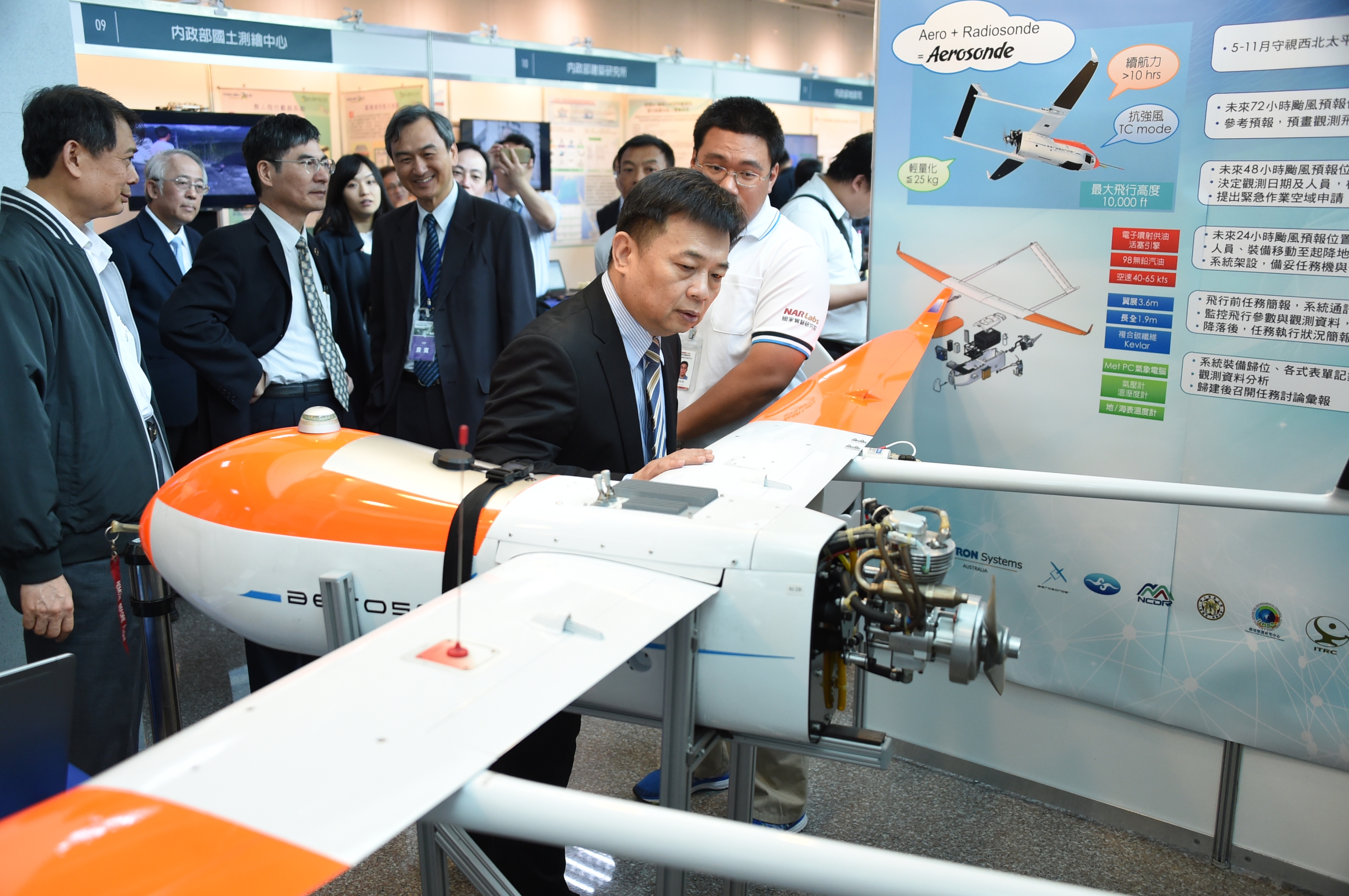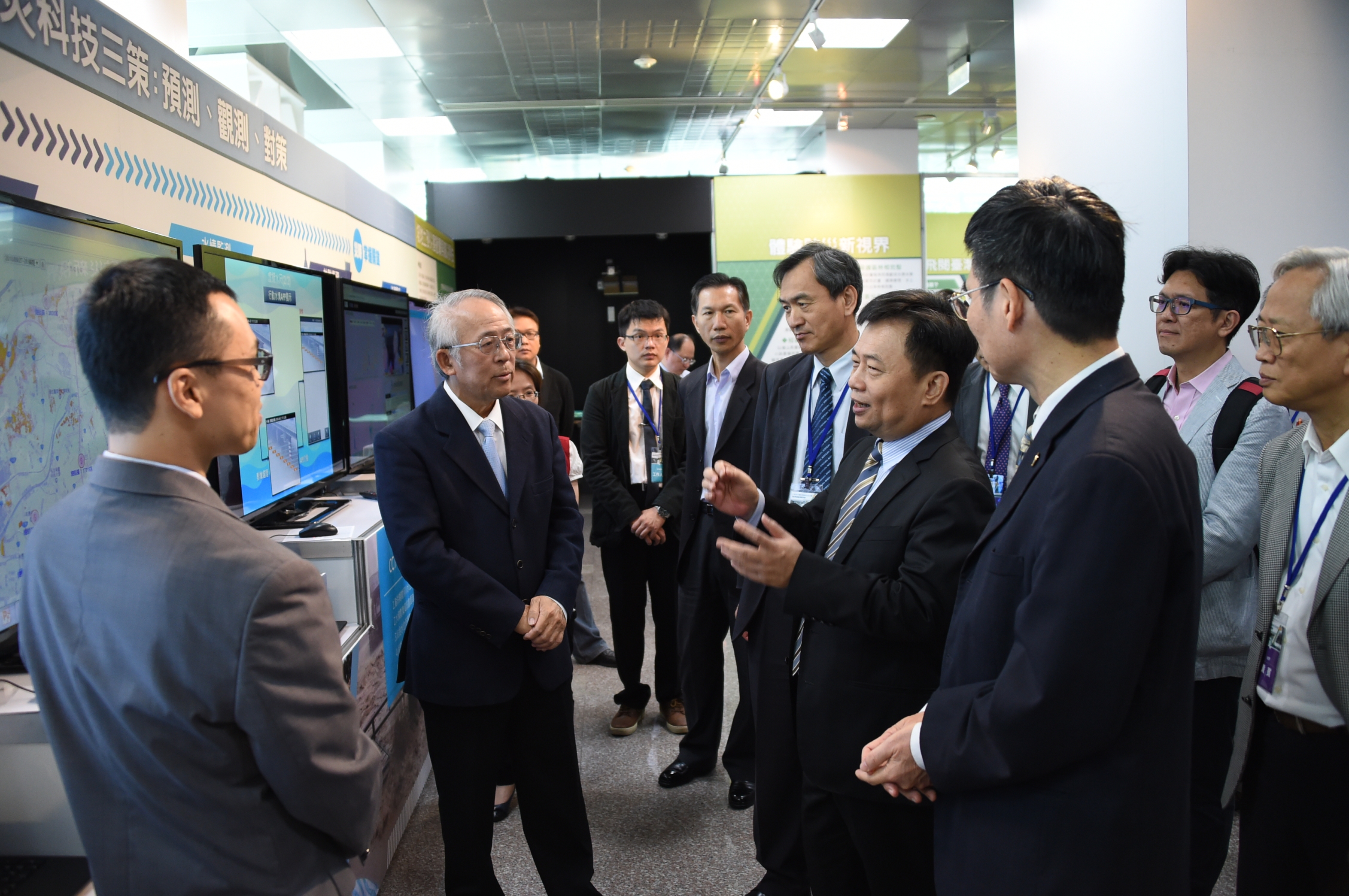 林副院長並參觀會場主題館,瞭解科技部、經濟部、交通部等部會投入防災情資整合與科技結合災害預測、觀測並形成對策的成果。在「飛閱台灣iFlyover」展示區,林副院長更戴上VR(虛擬實境)眼鏡,親身體驗由災前災後圖資結合而成,所產生出的災區重建影像新科技。