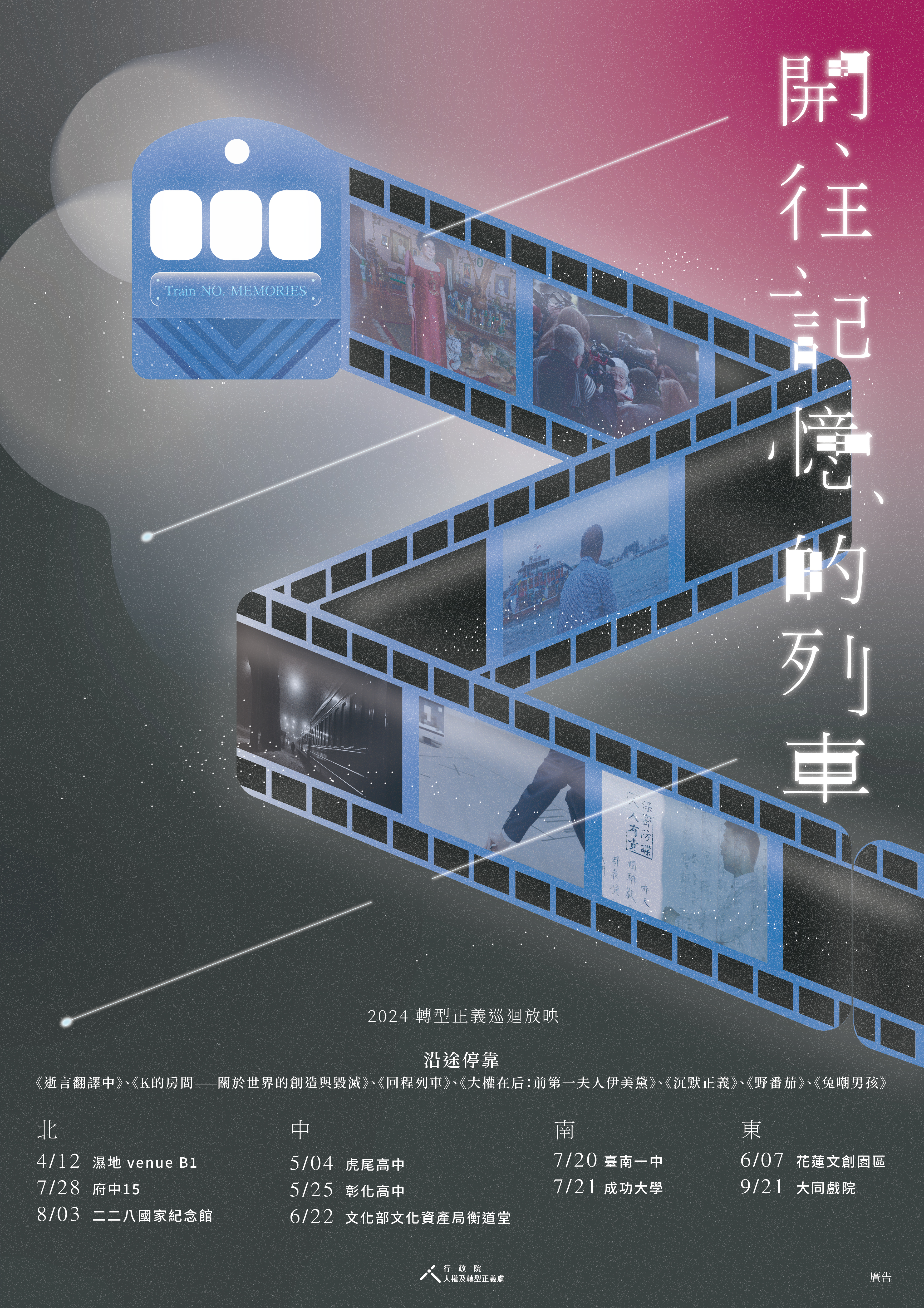 行政院委託話鹿學人有限公司辦理「轉型正義影音資源推廣服務案」,規劃舉辦「開往記憶的列車:轉型正義巡迴影展」,於本(113)年在北、中、南、東部舉辦10場次社會溝通推廣活動,邀請社會大眾一同欣賞7支轉型正義相關電影,並結合映後座談等活動進行探討與交流,以促進思辨對話及增進對於轉型正義多元議題的認識。
