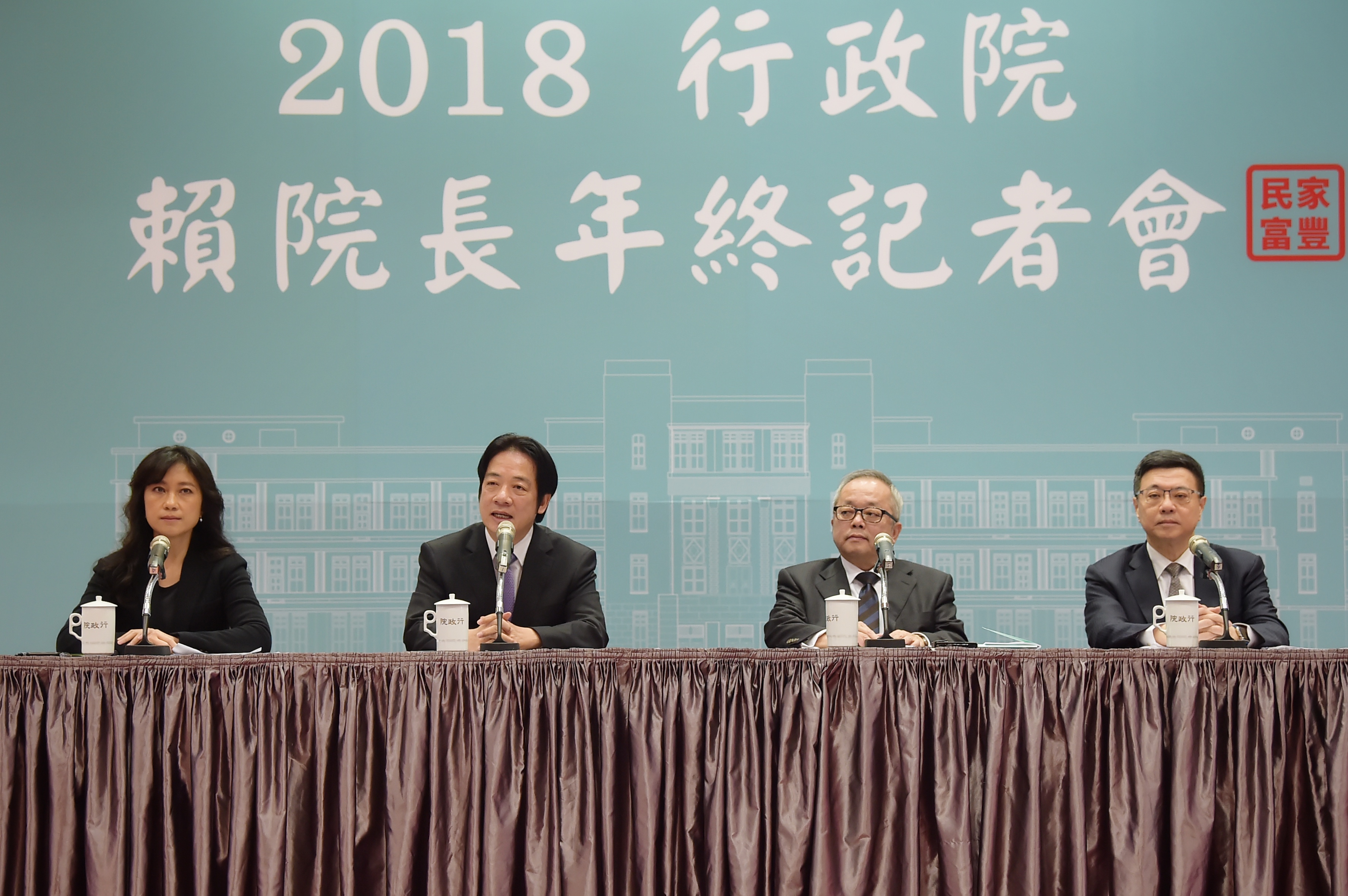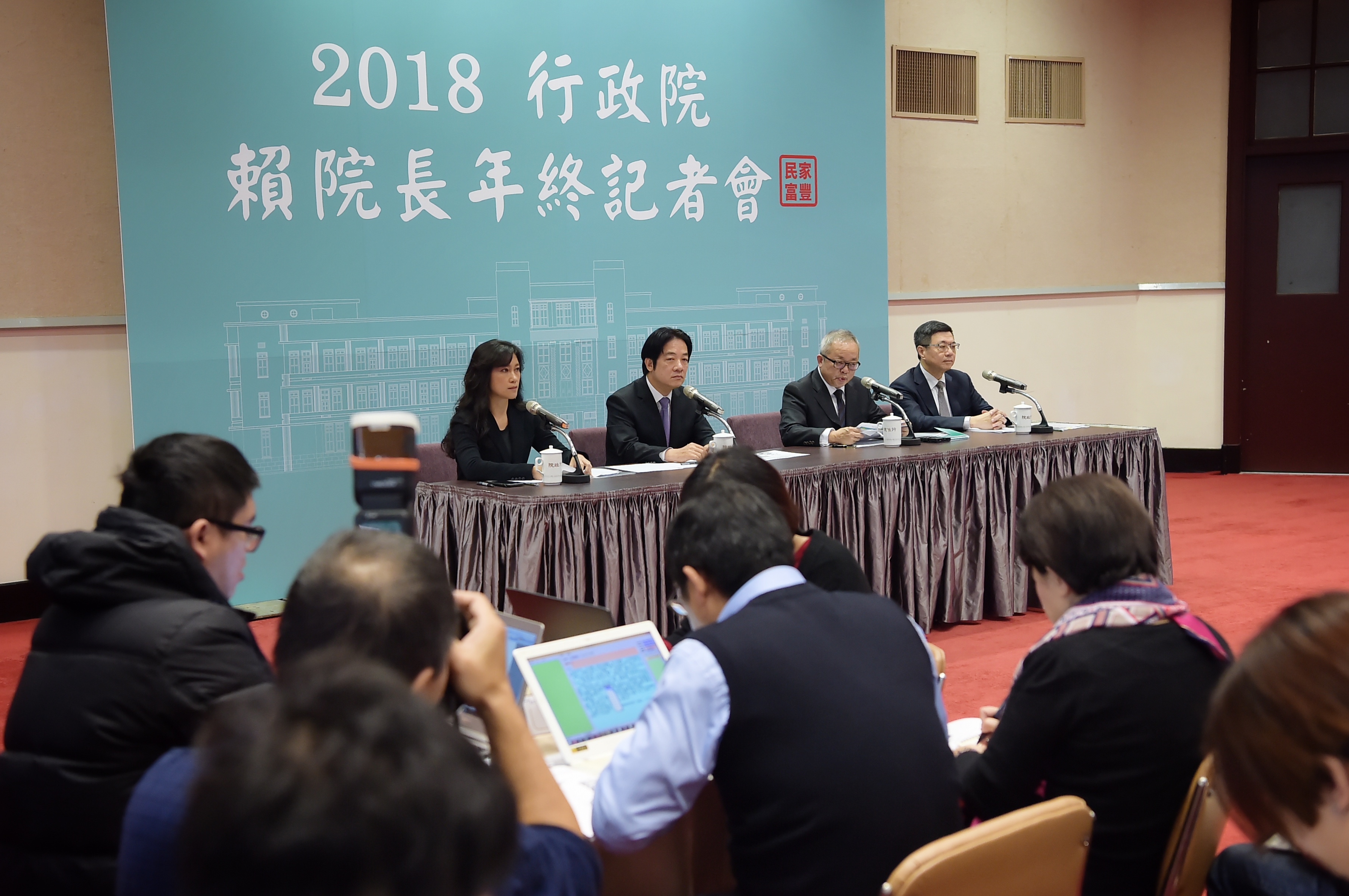 行政院長賴清德今(28)日偕同副院長施俊吉、秘書長卓榮泰及發言人Kolas Yotaka召開「107年行政院年終記者會」。賴院長表示,在未來一年,非洲豬瘟防疫、拚經濟及推動地方創生、雙語國家、服務型智慧政府,為政府持續加強推動的施政重點,並呼籲各界為台灣共同努力,在未來面臨美中貿易衝突、經濟更具挑戰的情形下,大家仍要穩步前進。