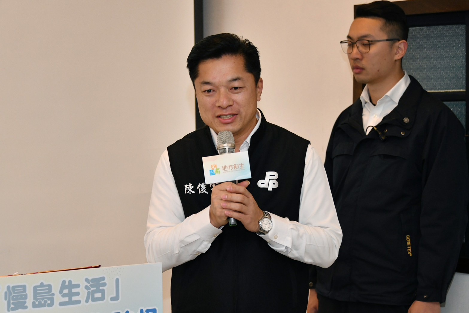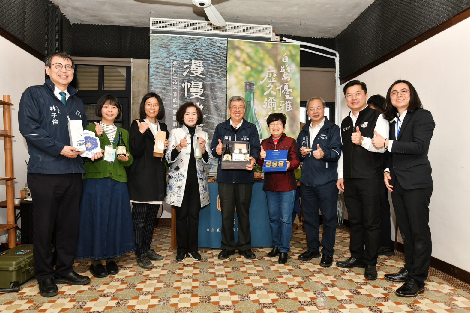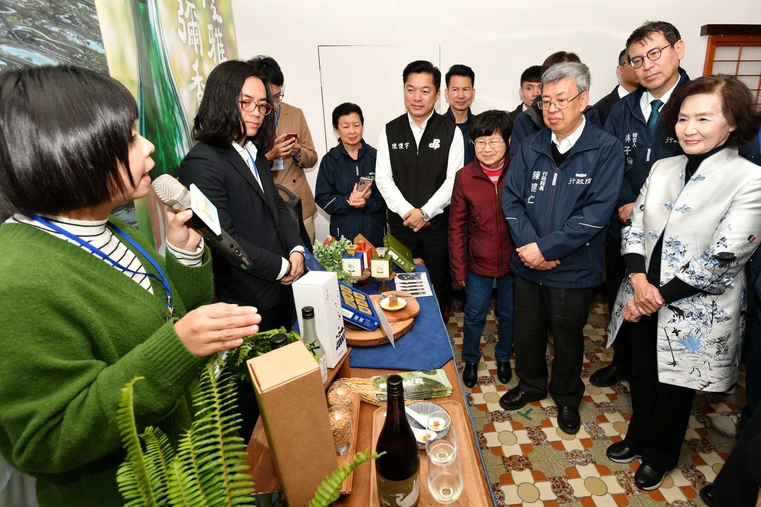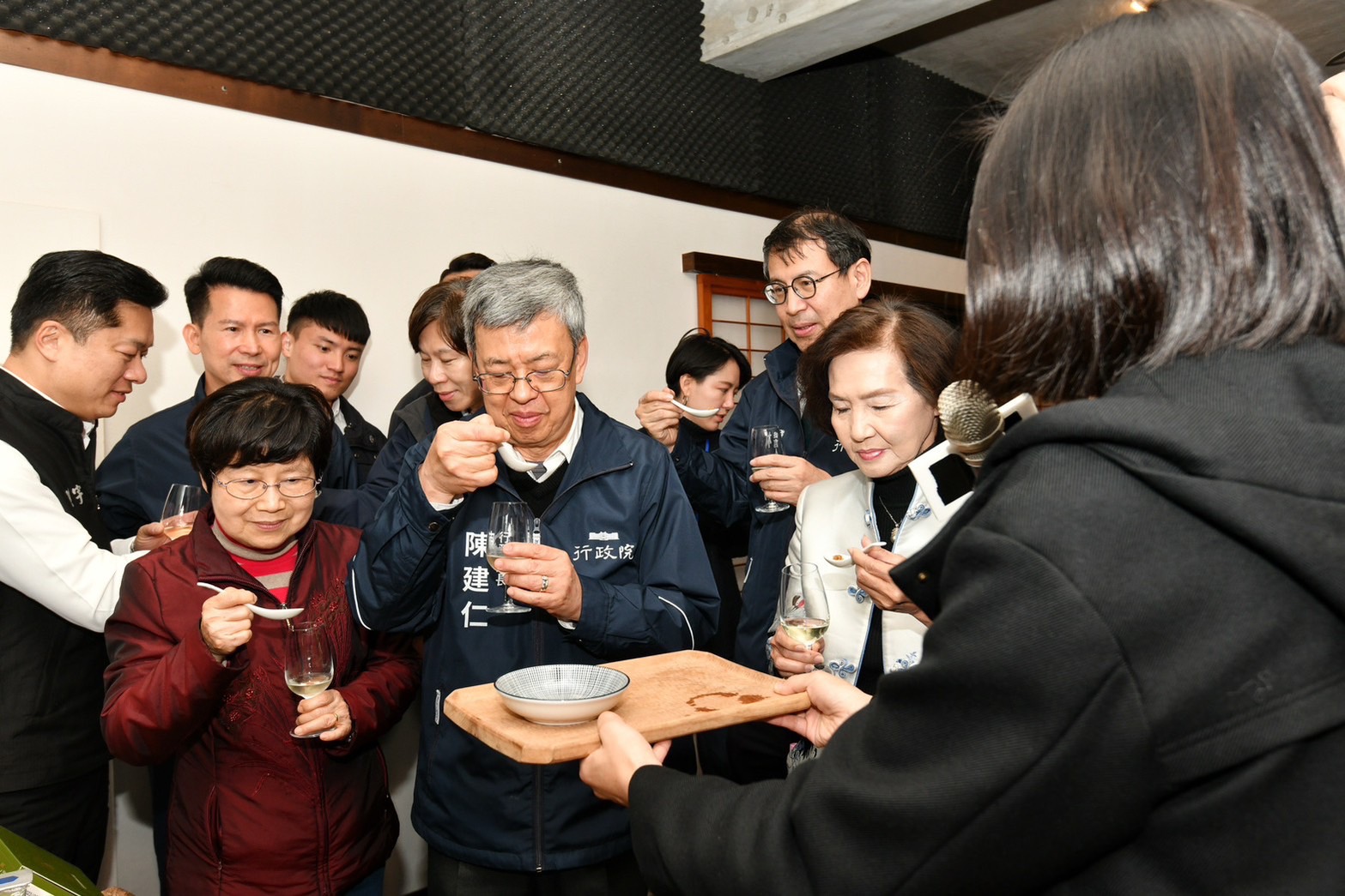 陳院長抵達後,首先聽取慢島生活宋若甄共同創辦人說明「深溝二代計畫團隊簡報」,並於致詞結束後,偕同夫人、行政院林子倫發言人、國家發展委員會龔明鑫主委、陳俊宇立委及宜蘭縣林姿妙縣長等貴賓,一同品嚐地方創生團隊以在地食材製作的松露橄欖油豆腐乳,以及嗅聞深溝地酒的香氣,並與在地團隊合影留念。