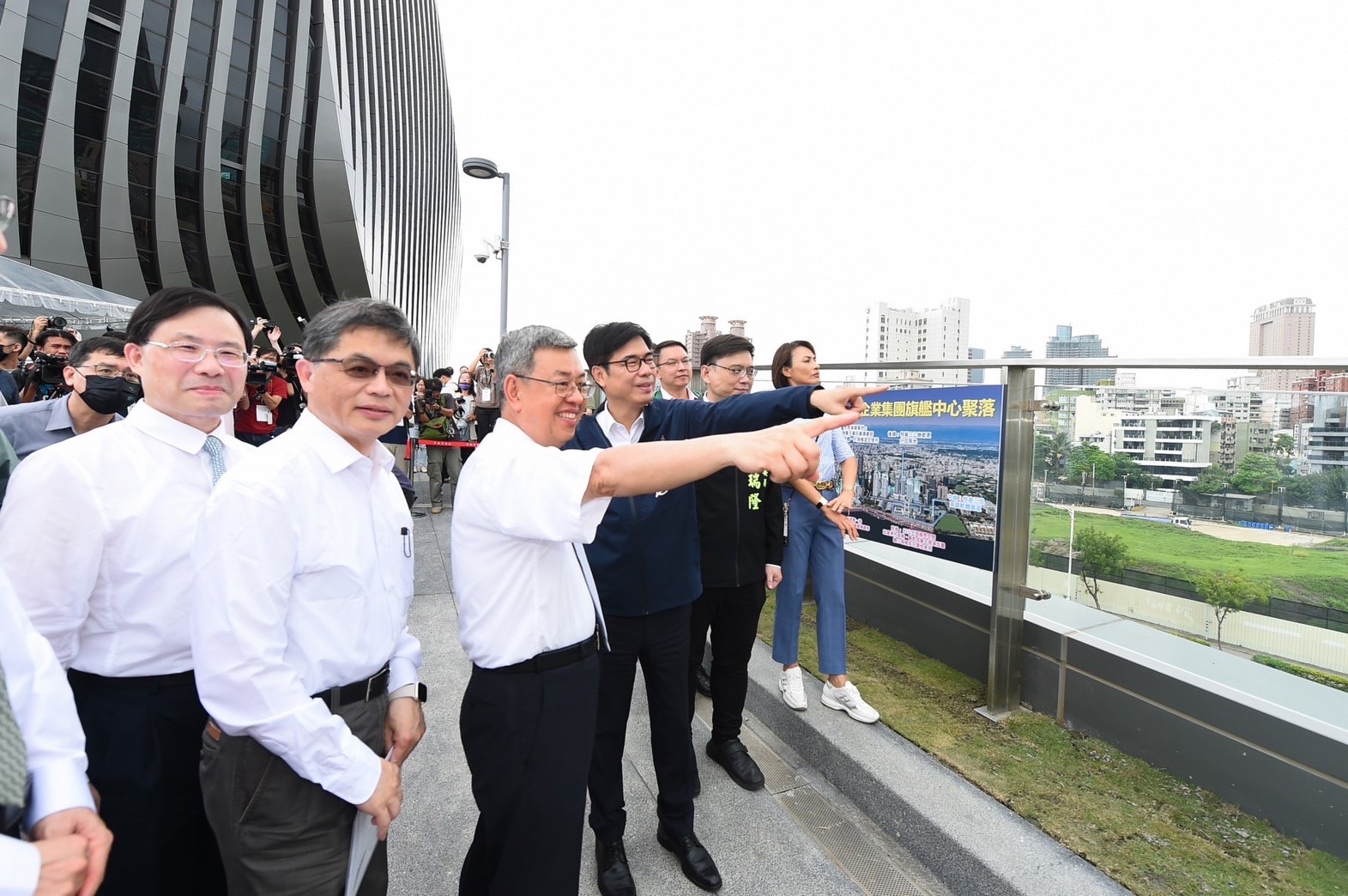 陳院長抵達後,分別聽取經濟部工業局主任秘書周崇斌簡報「亞灣2.0智慧科技創新園區推動方案」,以及高雄市副市長羅達生補充說明,並於合影後,前往會場前方遠眺園區預定地位置,聽取陳其邁市長解說該園區未來發展前景。