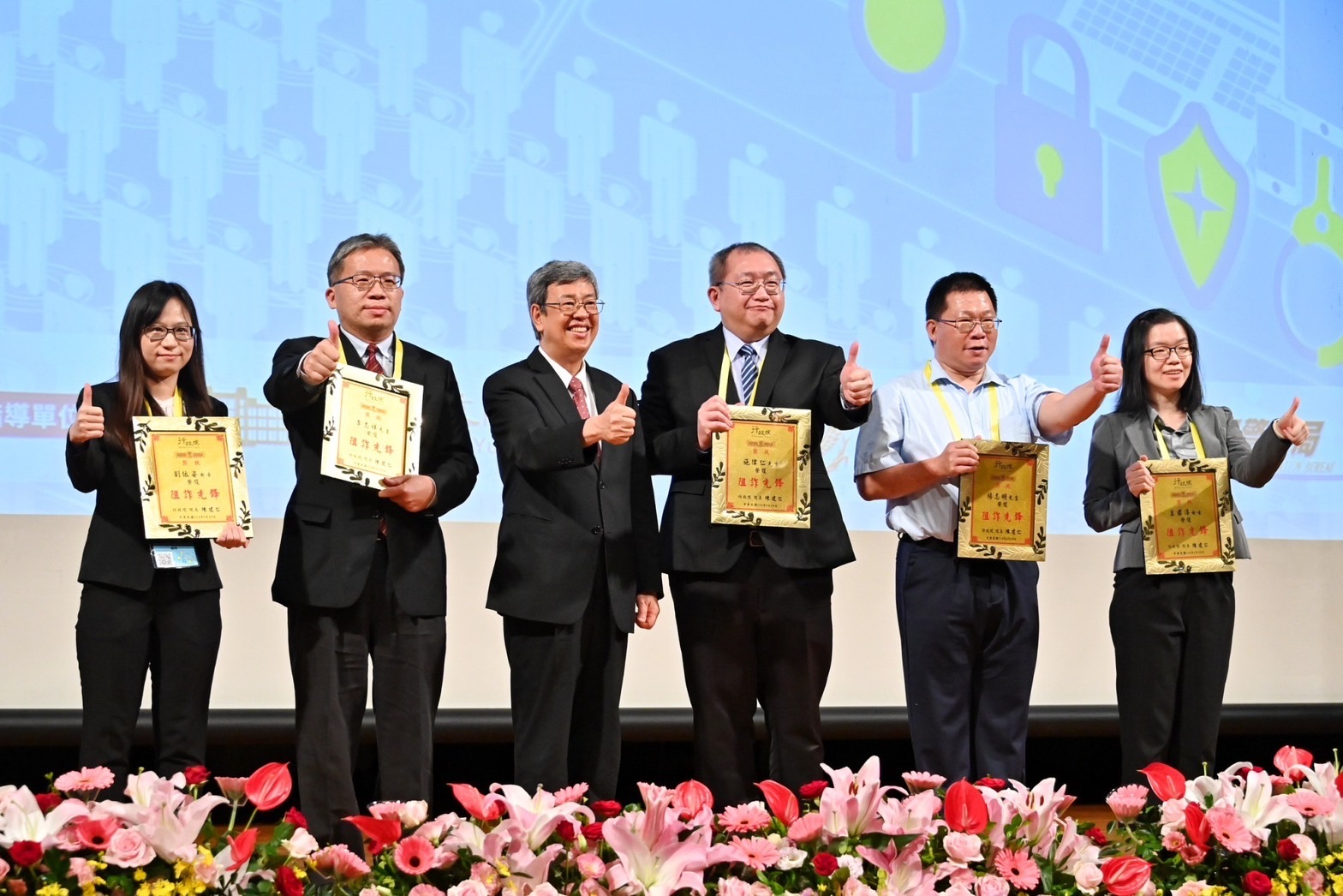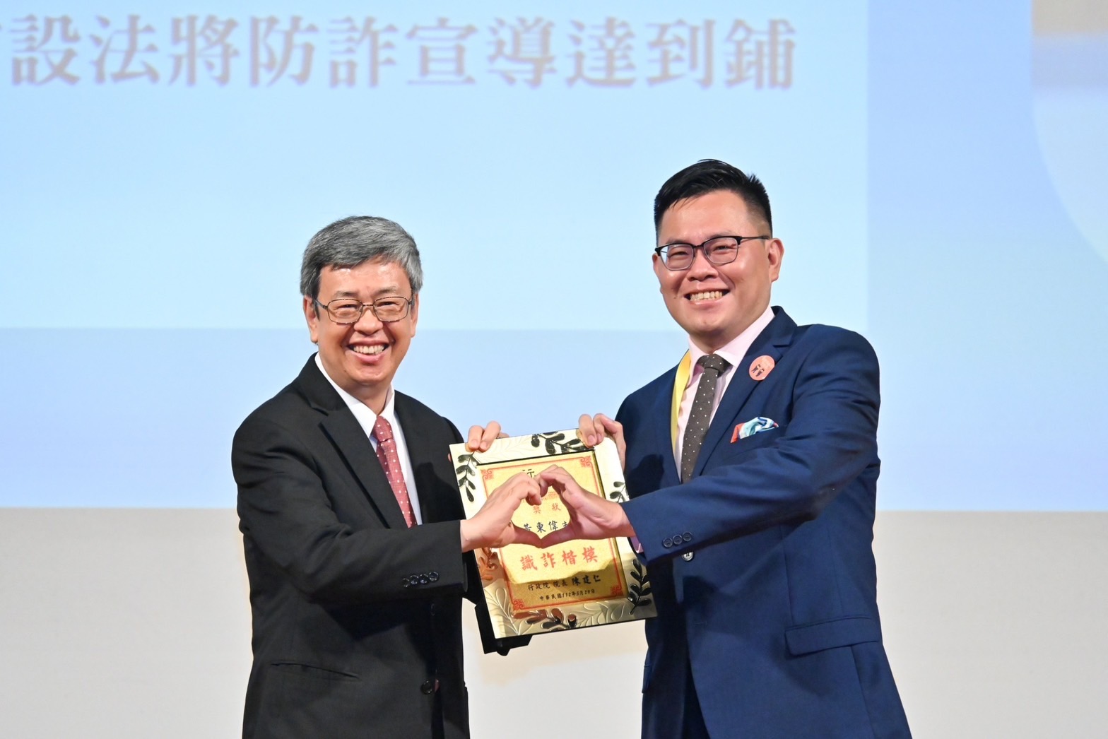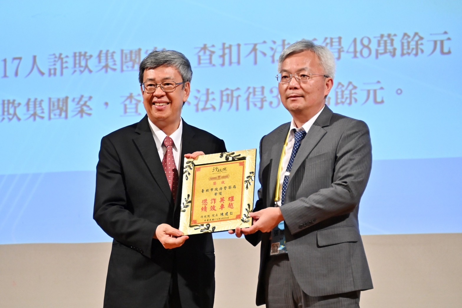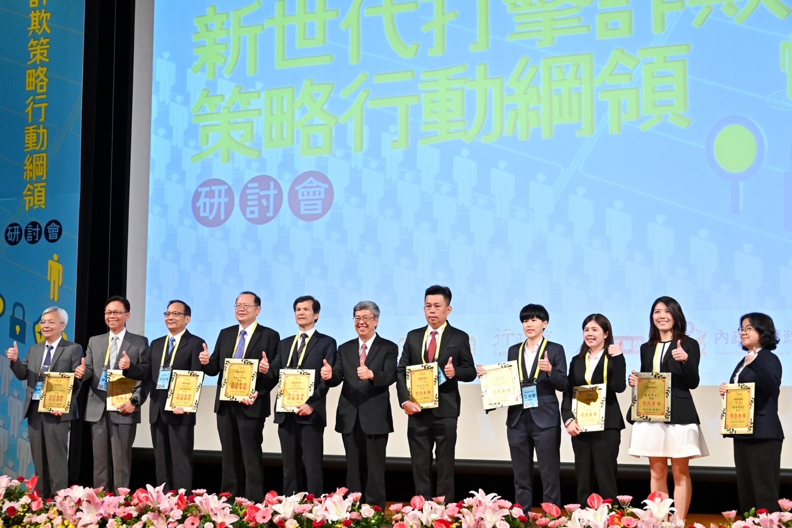 陳院長表示,內政部今日特別舉辦研討會,邀集中央及地方政府所有打詐夥伴齊聚一堂,共同交流及分享打詐經驗,他也要藉此機會表揚與慰勉這一年來辛苦付出的同仁,因為大家共同努力,才使臺灣人民身家財產獲得很好的保障,「有你們真好!」,至盼中央與地方、政府與民間持續攜手合作,共同精進各項打詐工作。隨後,陳院長依序頒發「懲詐英雄」、「識詐楷模」、「堵詐表率」及「阻詐先鋒」等獎項,分別與30位打詐有功人員合影留念。