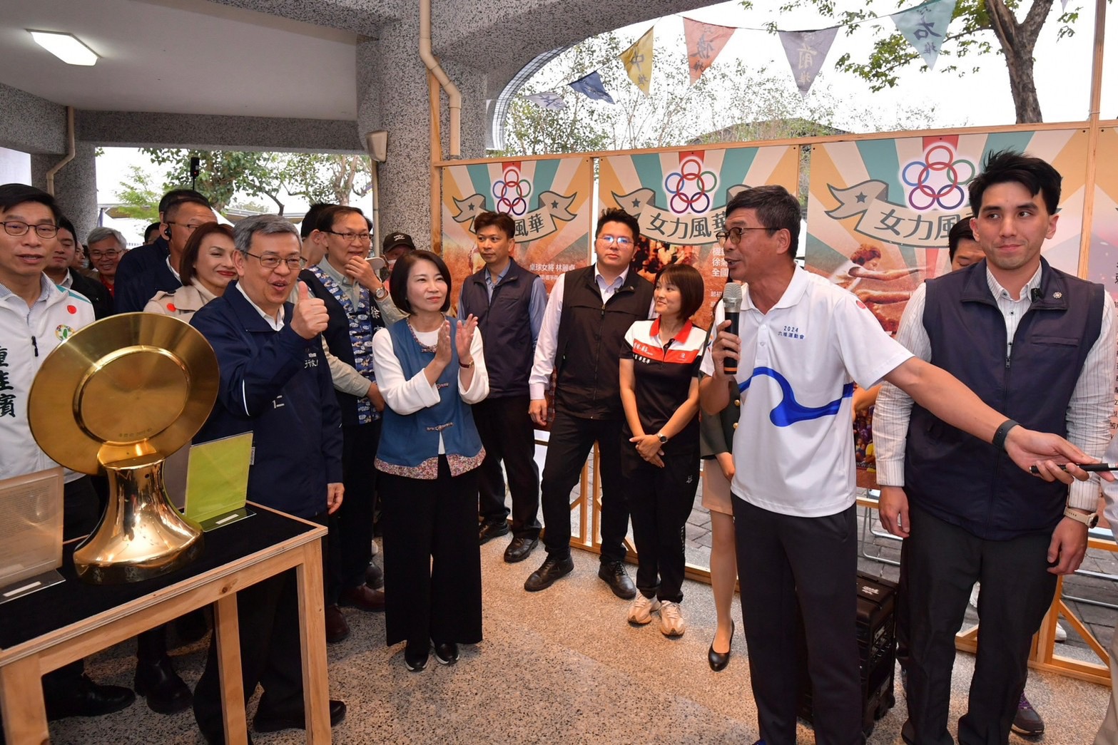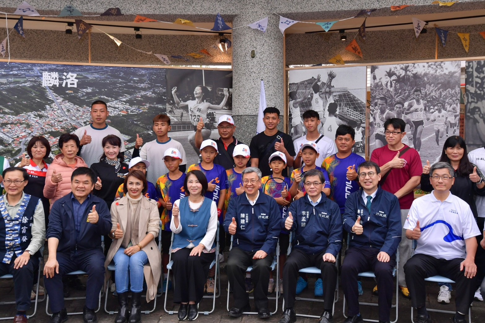 陳院長到場後,與行政院李孟諺秘書長、林子倫發言人、客家委員會楊長鎮主委、鍾佳濱立委、莊瑞雄立委、徐富癸立委、邱議瑩立委及屏東縣周春米縣長等人,參觀「向前行–2024六堆運動會及前堆客庄人文影像巡展」,聽取六堆運動會簡史、女力運動員及軟式網球選手介紹,並與資深運動員徐菊英、曾財華、吳玉枝、林森麟、傑出運動員張慈芳、馮子瑜、何孟勳、張昱帆、馮慶弘、黃正琦、李佳鴻,以及麟洛國小軟網隊代表等合影留念。