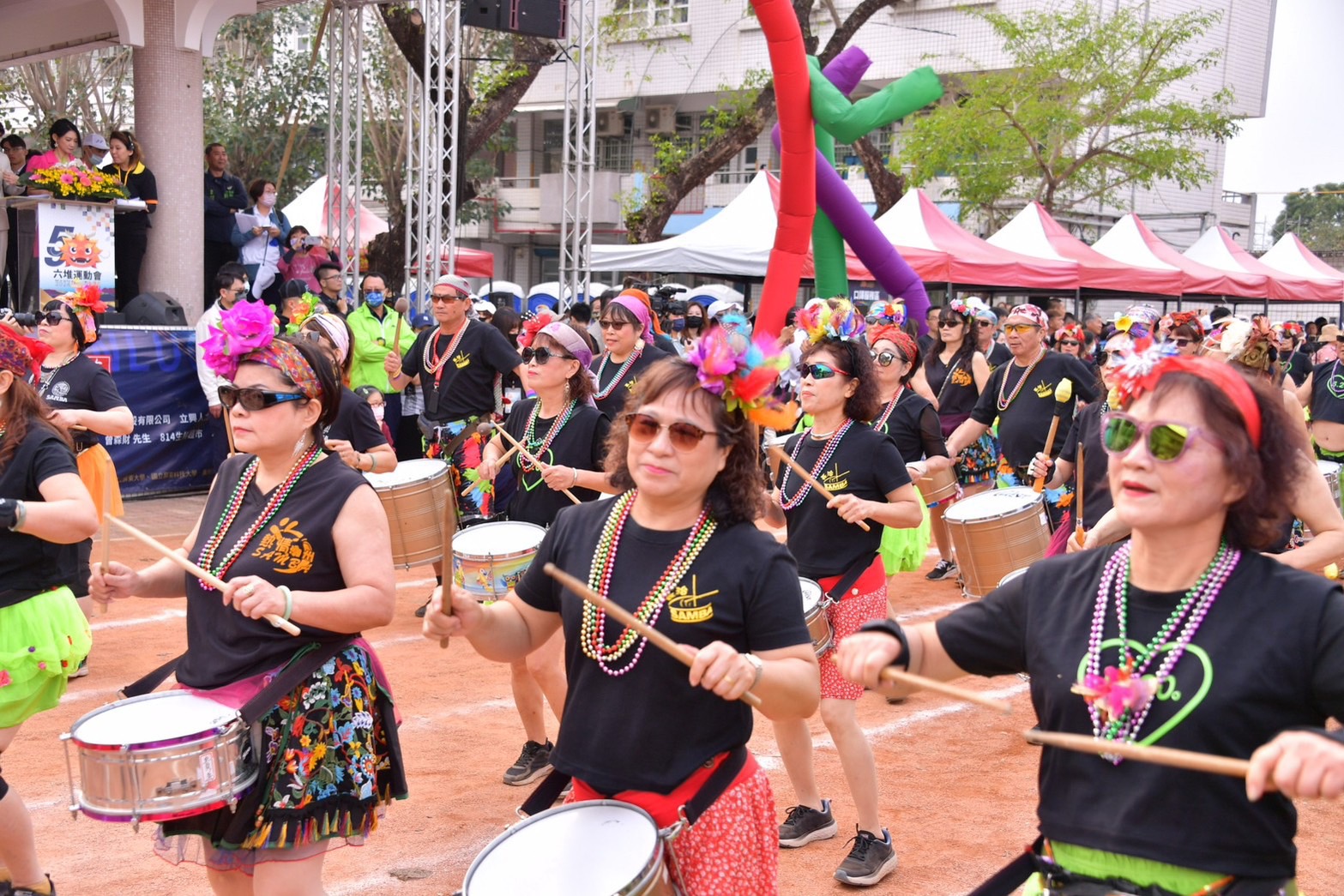 隨後,開幕典禮正式開始,本屆大會籌備委員、裁判及運動員、六堆12鄉區運動員代表依序進場,今(2024)年吉祥神獸Q版麒麟大型空飄氣球及麒麟兄妹人偶也在長治森巴鼓隊擊鼓配樂中熱鬧登場。致詞結束後,陳院長頒授「六堆旗」予本屆運動會主辦單位屏東麟洛鄉鍾慶平鄉長,並頒發「第59屆六堆運動會大會麒麟獎」獎狀及禮品予資深運動員,表彰他們對地方體育發展的卓越貢獻。