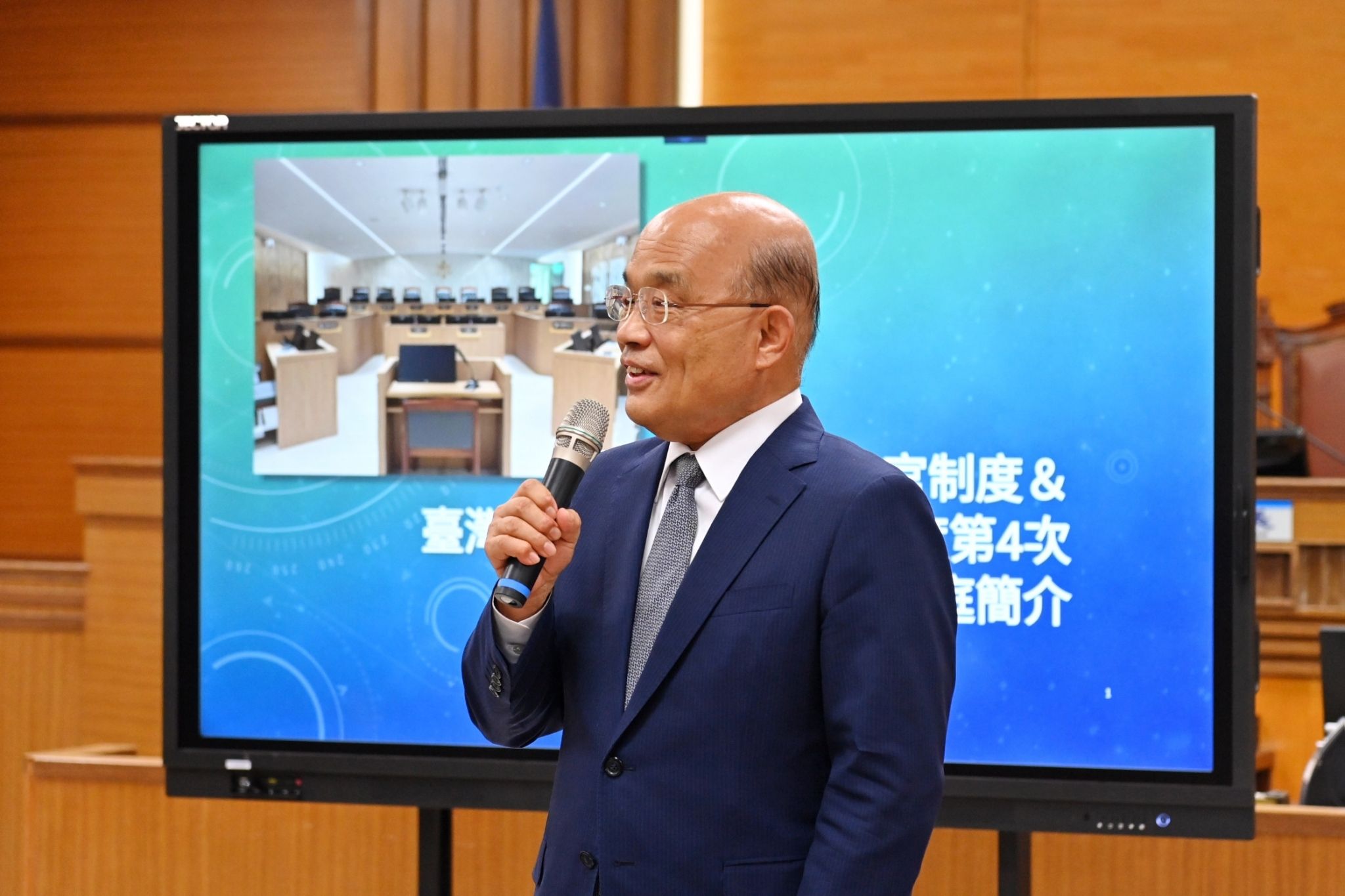 蘇院長致詞時首先感謝司法院許宗力院長及新北地方法院陳賢慧院長邀請他參訪新北地方法院,旁聽國民法官模擬法庭的審理程序。過去他求學時,曾讀到論語中的「民可使由之,不可使知之」,但現在政府施政不僅要達到「使知之」的目的,讓民眾明瞭政府施政意涵,還要讓民眾共同參與公共政策,相當不容易。