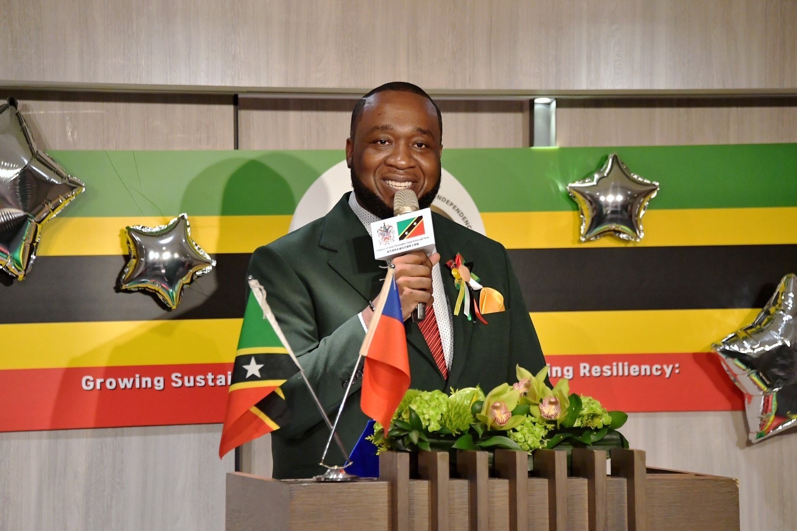 陳院長到場後,先聆聽克國歌手Howard Liburd演唱歌曲,及鋼鼓演奏聖克里斯多福及尼維斯國歌與中華民國國歌。隨後,院長致詞時指出,他很榮幸受邀並代表蔡英文總統參加克國40週年獨立紀念日慶祝酒會,今年同時也是臺克兩國建交40週年,外交部長吳釗燮正以總統特使身分率團前往克國祝賀,國防部也派遣三軍儀隊赴克國表演,歡慶兩國40年友誼。院長說,臺灣是克國於1983年獨立建國後第一個建交的國家,臺克是真切交心的好朋友,今日慶祝活動對兩國意義非凡,他要代表臺灣政府及人民,向克國政府及人民表達最誠摯祝賀。