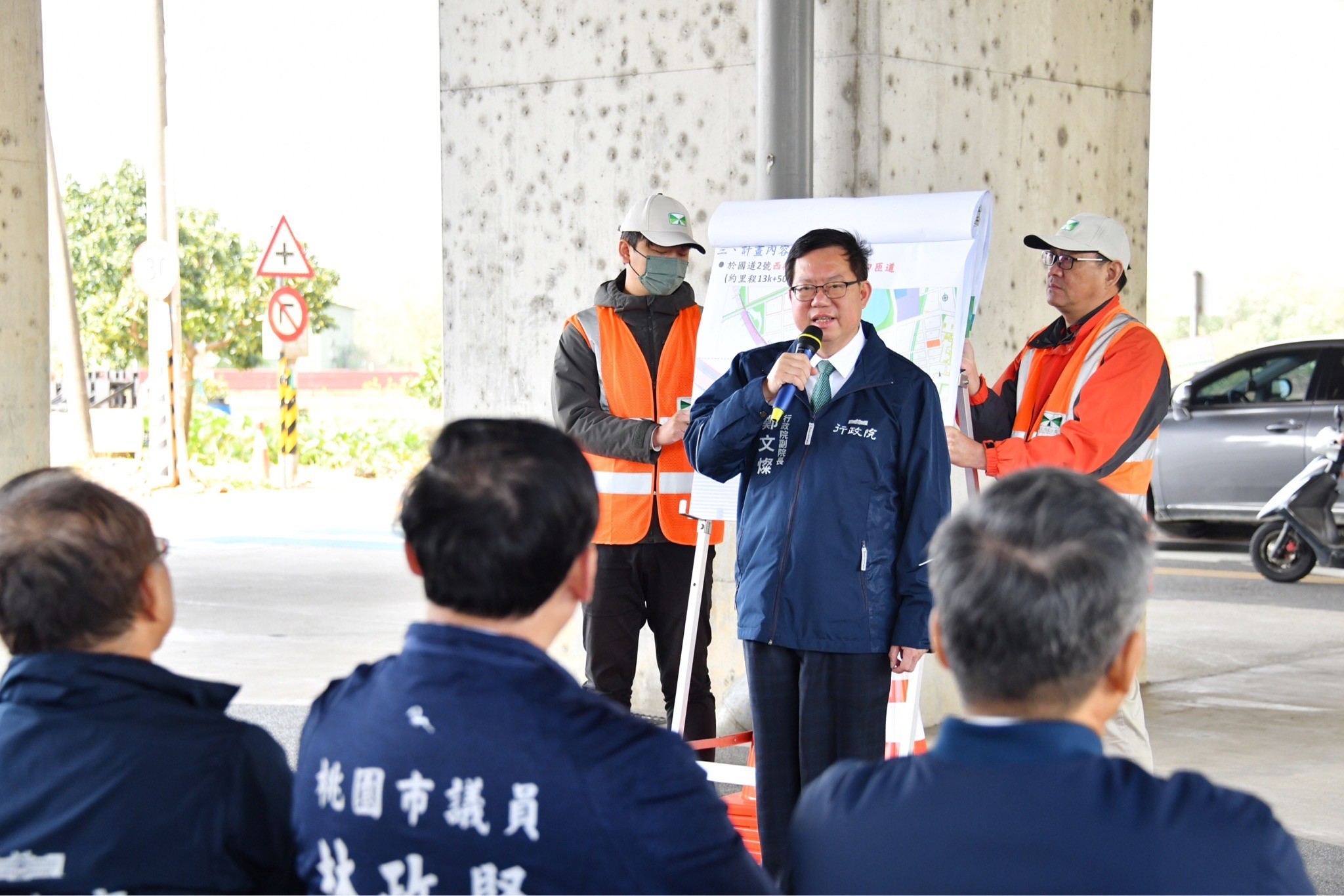 此行,鄭副院長先聽取交通部高公局蔡宗描組長簡報後,在交通部陳彥伯次長、桃園市政府詹榮鋒秘書長、高公局趙興華局長、桃園市議會林政賢議員、黃瓊慧議員、張肇良議員、許家睿議員、李宗豪議員等人陪同下進行現地視察後結束行程。