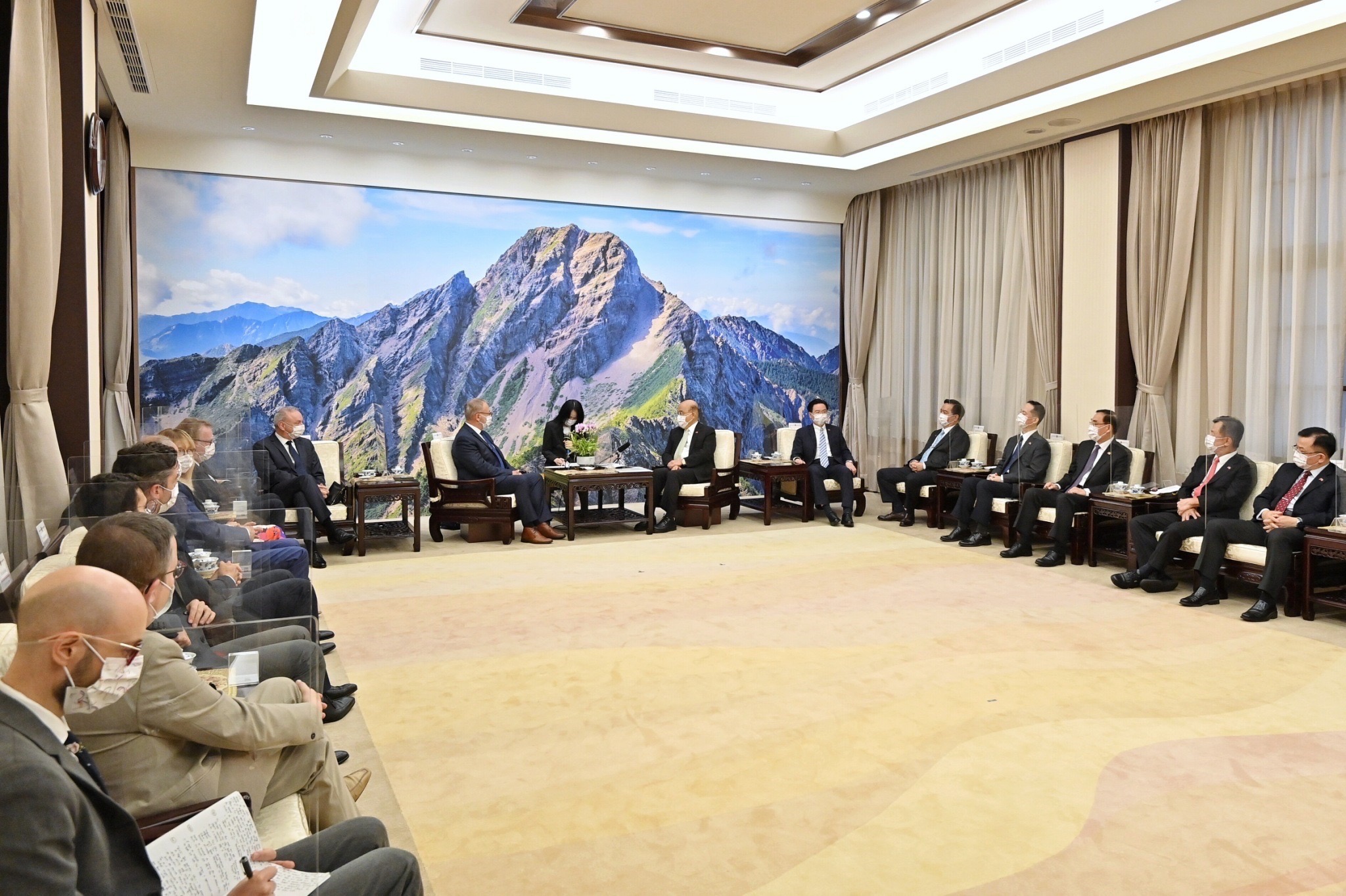 蘇院長表示,葛里歐副主席率領訪團一行,於全球疫情期間,不畏旅行不便影響,特別遠道前來我國訪問,他除了代表我國政府與人民表達誠摯歡迎外,亦感謝訪團成員對於臺法關係的重視。