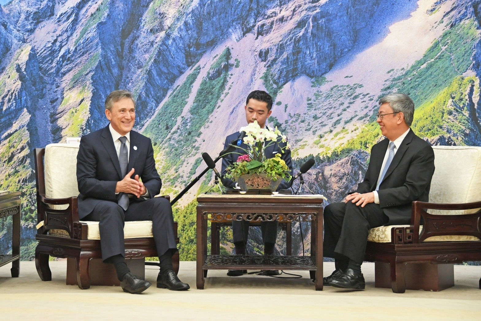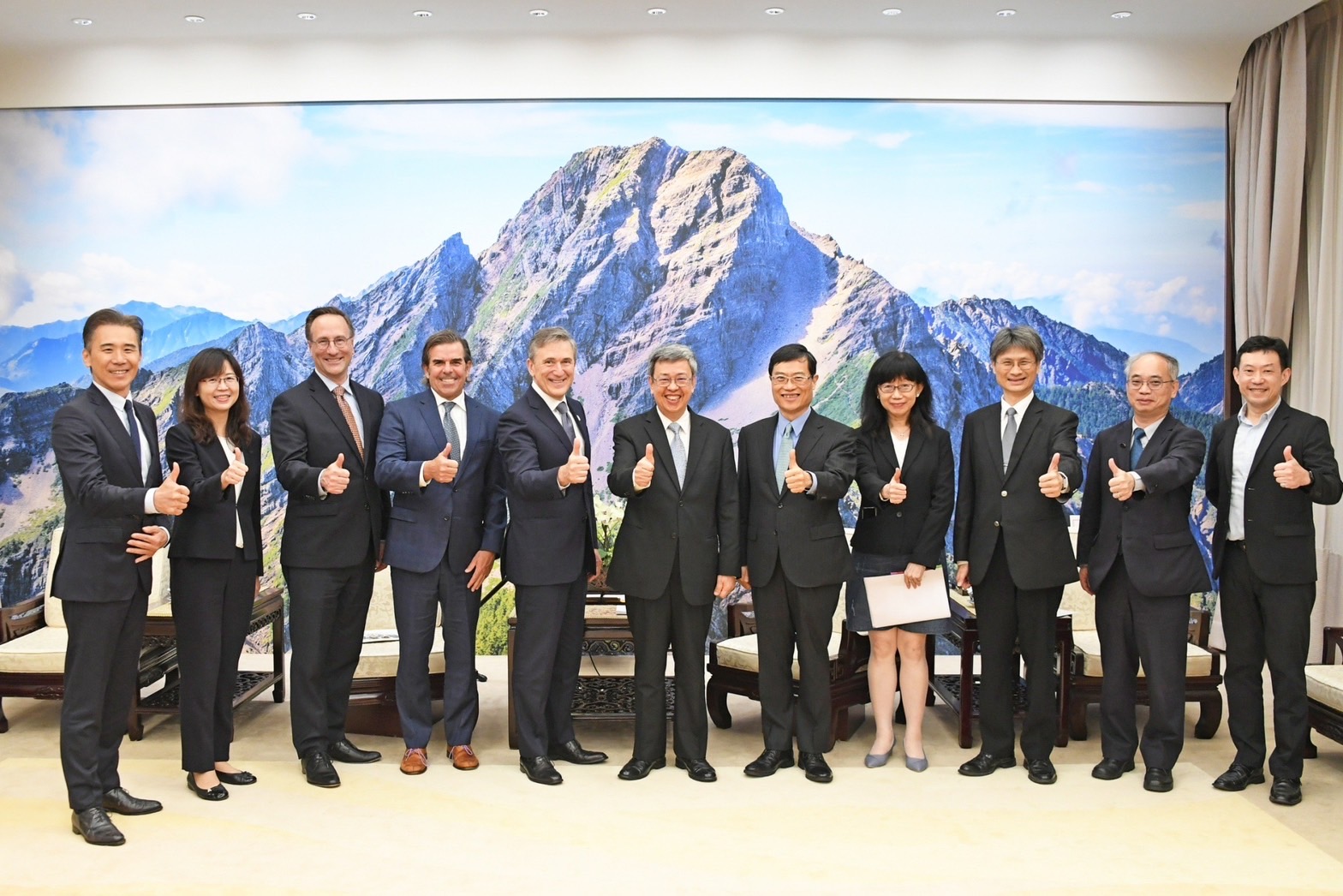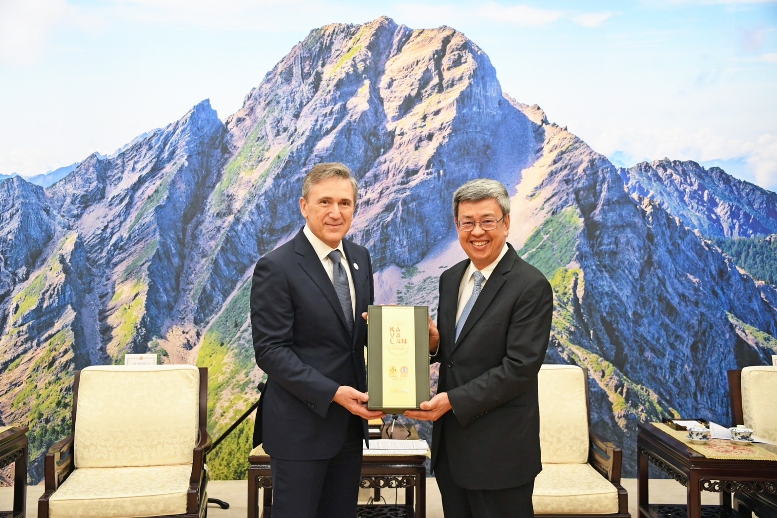 訪賓一行由經濟部次長陳正祺與國家科學及技術委員會副主委陳儀莊陪同,前來行政院拜會陳院長;院長致贈經典獨奏波本桶威士忌原酒予Loy總裁,雙方並合影留念。