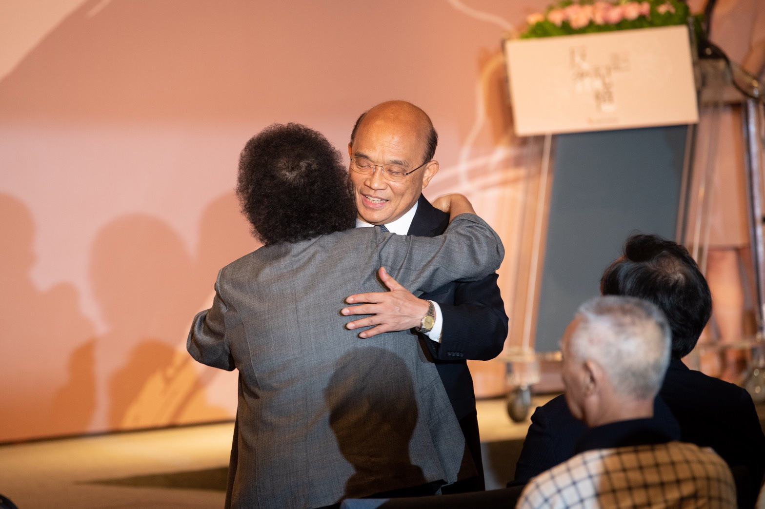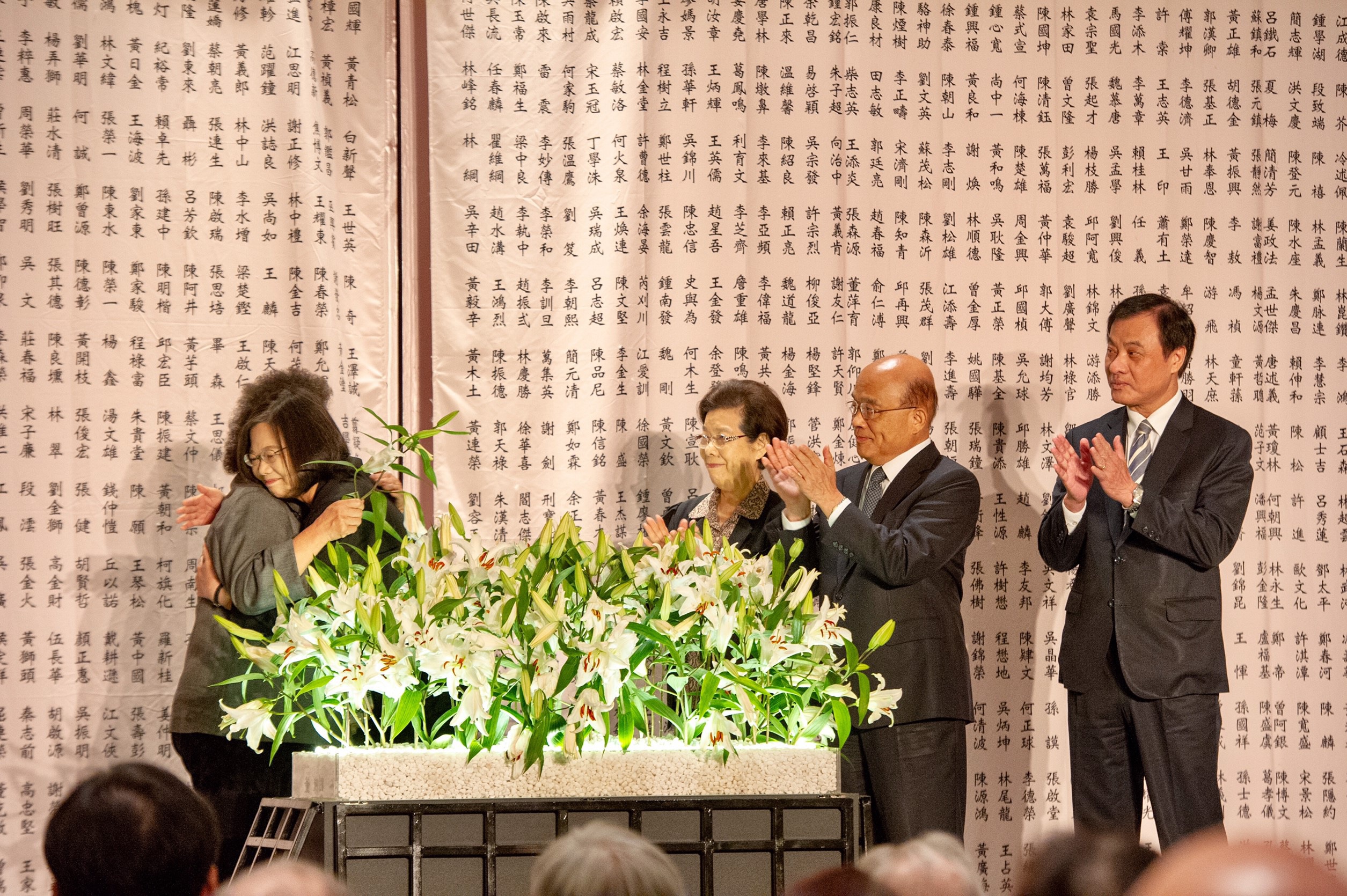 蘇院長呼籲台灣人要看得清楚、要知道過去,要知道是幾代人的犧牲,如陳菊秘書長等前輩犧牲奉獻在前,這麼多後進堅定追隨他們的腳步,「番薯不怕落土爛,只求枝葉代代傳。」台灣人要勇敢、要堅毅,才能守住。民主自由是如此不容易,希望台灣人要團結、要打拚,才能繼續向前行。最後,蘇院長給予陳秘書長一個大大的擁抱,畫面令人動容。蘇院長也一一為受難者們送上百合花,並對他們說聲「辛苦了」。