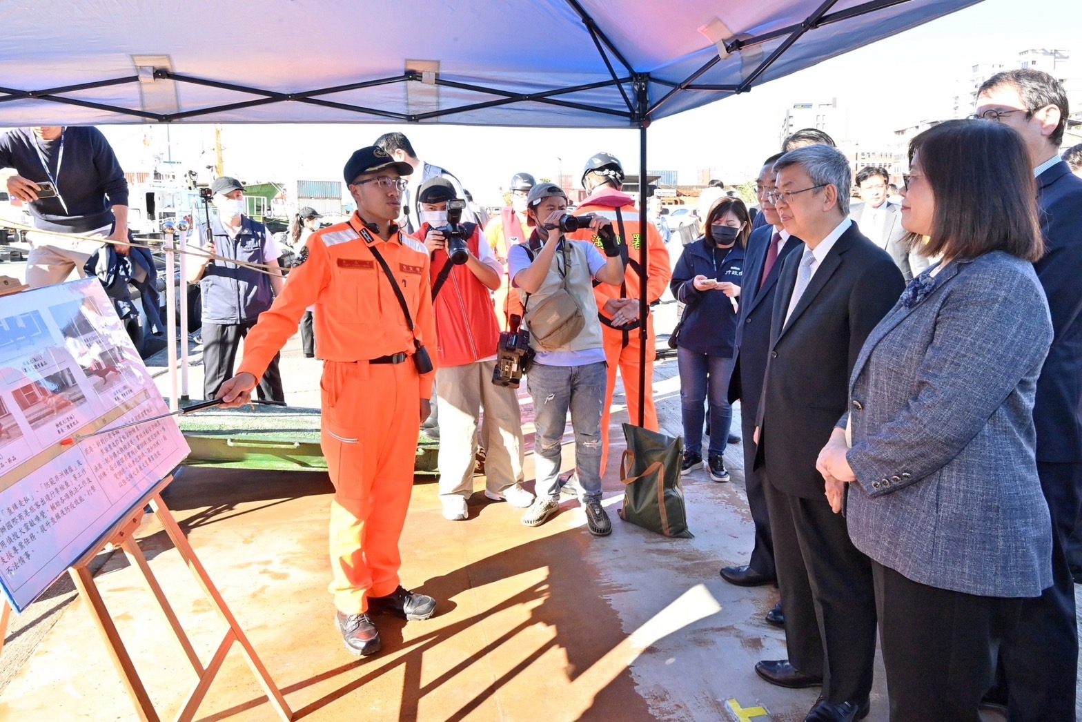 陳院長到場後,首先聽取海洋委員會海巡署偵防分署黃世賢分署長說明案情簡報,並於致詞後,分別頒發加菜金予基隆地檢署、橋頭地檢署、海巡署、內政部警政署、財政部關務署及高雄市政府等機關;隨後,院長與行政院林子倫發言人、海洋委員會管碧玲主任委員、法務部蔡清祥部長、財政部謝鈴媛次長、最高檢察署邢泰釗檢察總長、高等檢察署張斗輝檢察長、基隆地檢署李嘉明檢察長、橋頭地檢署張春暉檢察長、關務署彭英偉署長、海巡署周美伍署長及警政署李西河副署長等人,逐一檢視基隆查緝隊及臺南查緝隊的查緝成果,並前往基隆港東十五碼頭,聽取海巡偵搜犬區隊蔡長亨區隊長安檢勤務說明,隨後登上10069巡防艇,了解艇上儀器與轄區概況,以及海巡同仁執勤情形;最後,院長和與會貴賓及海巡署執勤同仁一同在碼頭邊合影留念。