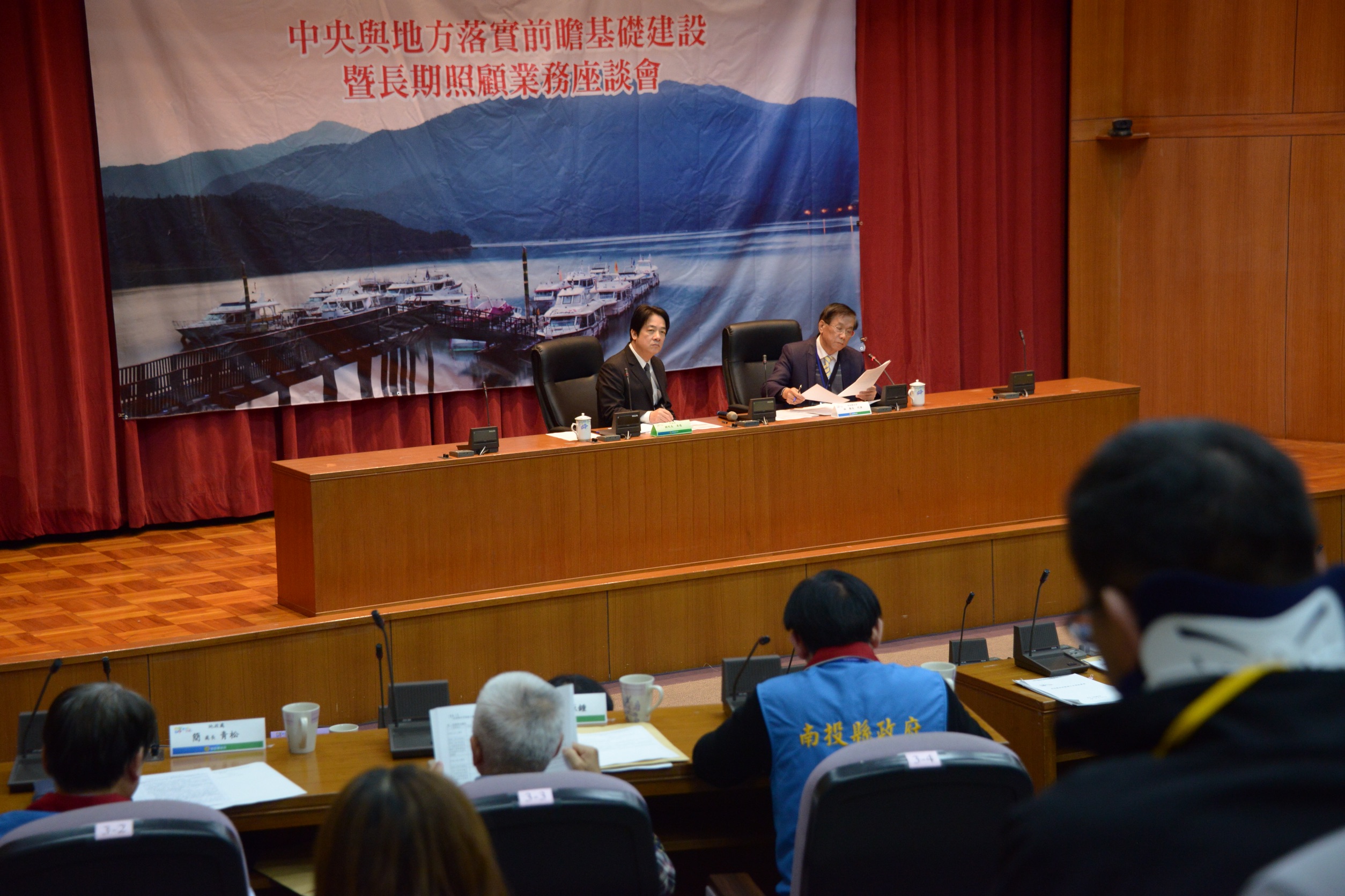 行政院長賴清德今(2)日率行政團隊至南投縣出席「中央與地方落實前瞻基礎建設暨長期照顧業務座談會」,與縣府團隊、鄉鎮市長及地方民代座談,會中熱烈交流討論。賴院長表示,此行是為落實蔡英文總統「前瞻基礎建設」及「長照2.0」兩大政策,希望縮短中央與地方距離,建立直接溝通橋樑,提高行政效率,順利推展各項政務,使台灣持續進步。
