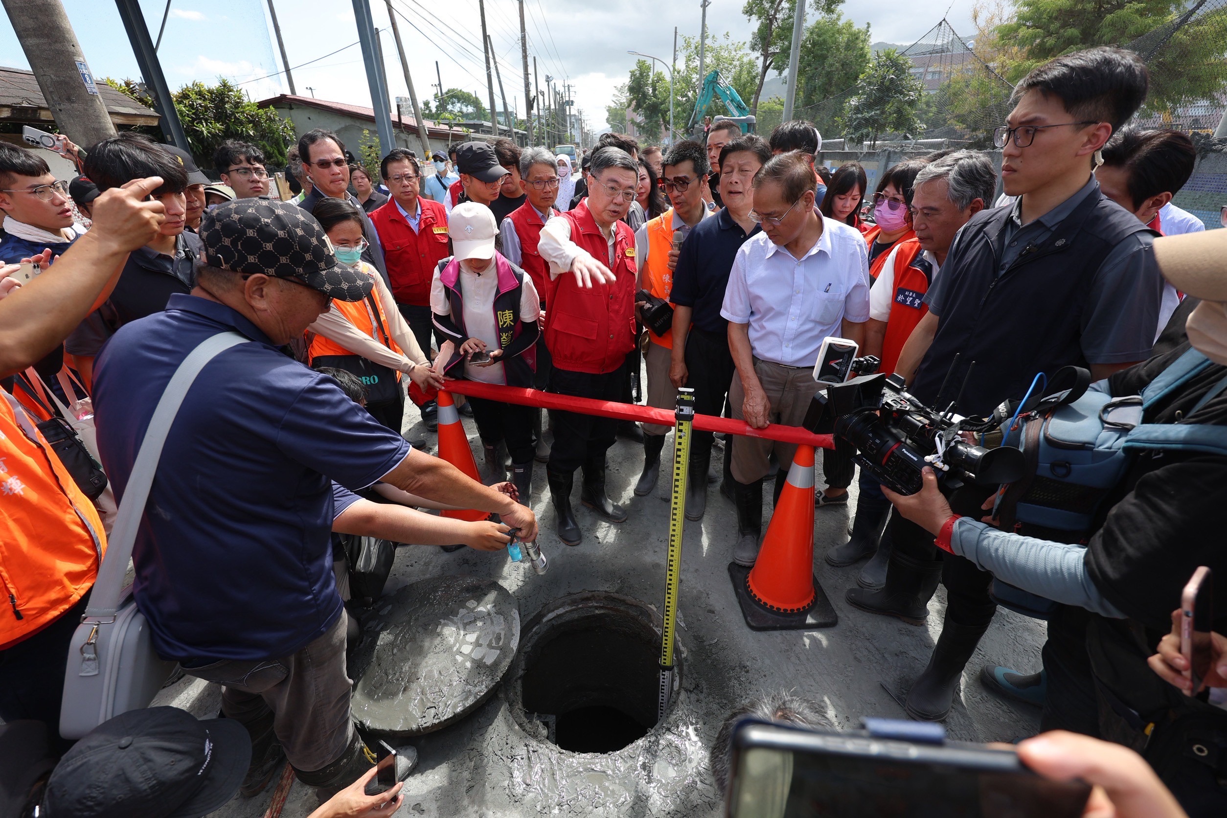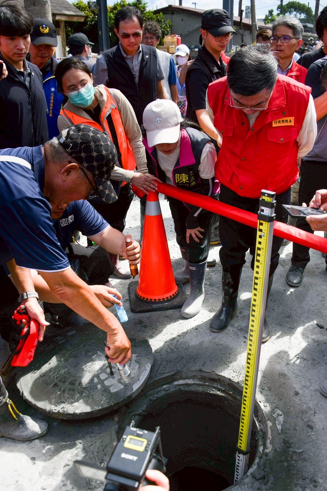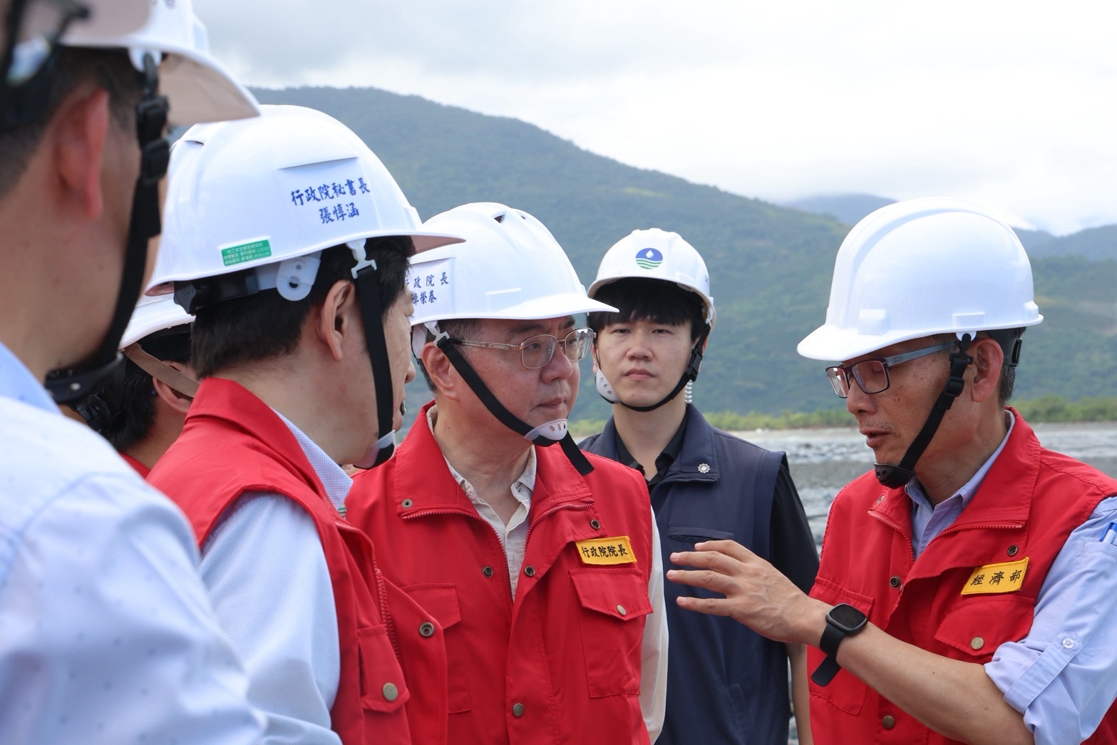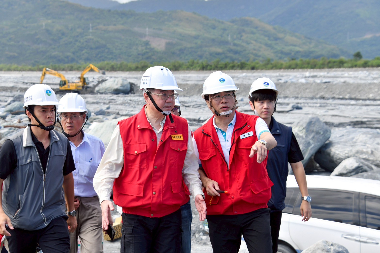 卓院長結束前進協調所視察行程後,首先前往光復國中及光復鄉中山路三段、中學街路口視察雨水下水道及側溝淤積情形,聽取內政部國土管理署於望聖副署長及下水道工程分署陳高孝副分署長說明災損情況與救災進度;接續前往光復堤防堤尾視察堤防受損及搶修情形,並聽取經濟部水利署林元鵬署長說明災損情況與搶修進度。