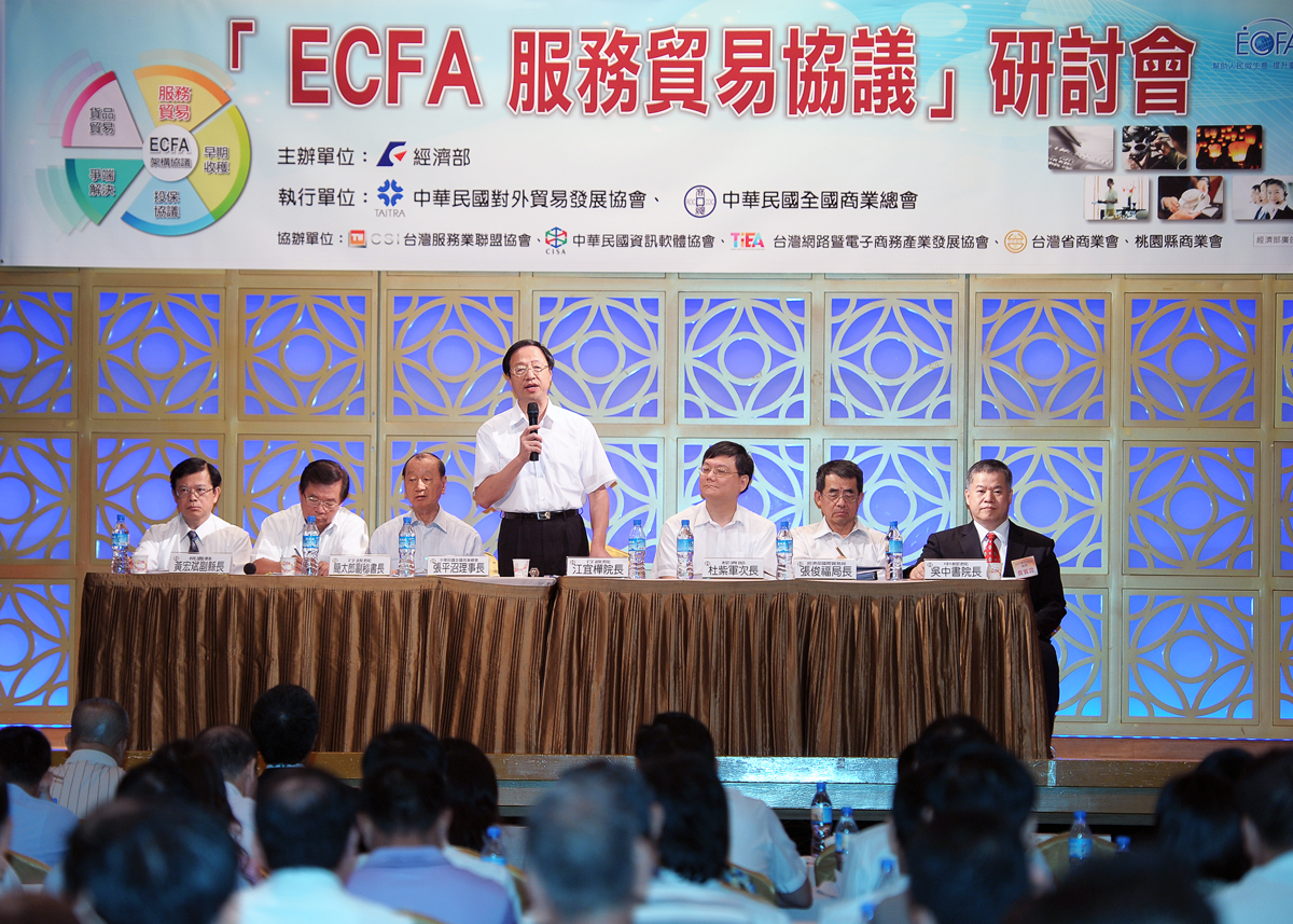 行政院長江宜樺今(11)日出席「ECFA服務貿易協議商機」論壇致詞時表示,上(6)月21日由海基會與大陸海協會簽定海峽兩岸服務貿易協議,這是洽簽ECFA多年後的重大進展,而這項協議與正在談判中的貨品貿易服務協定為最重要的兩根支柱。