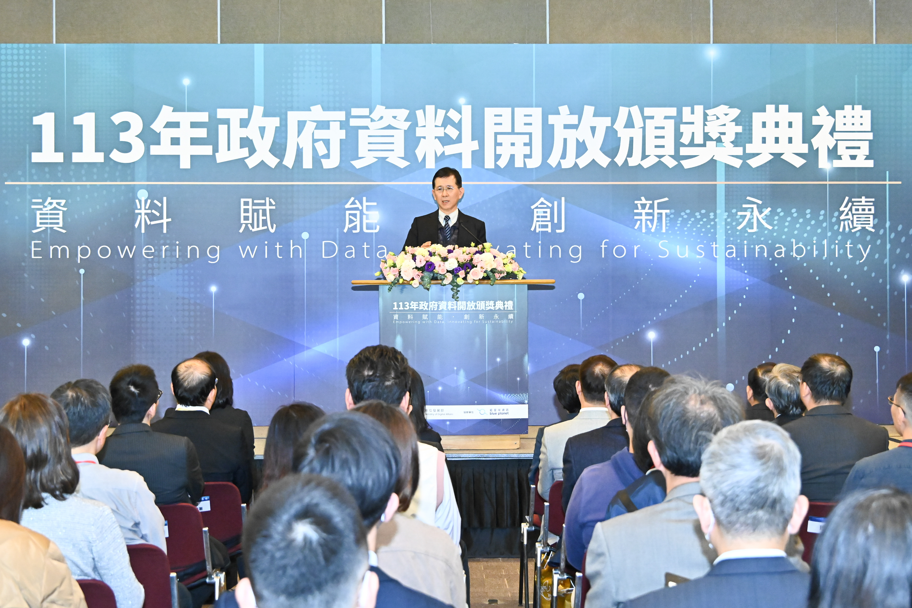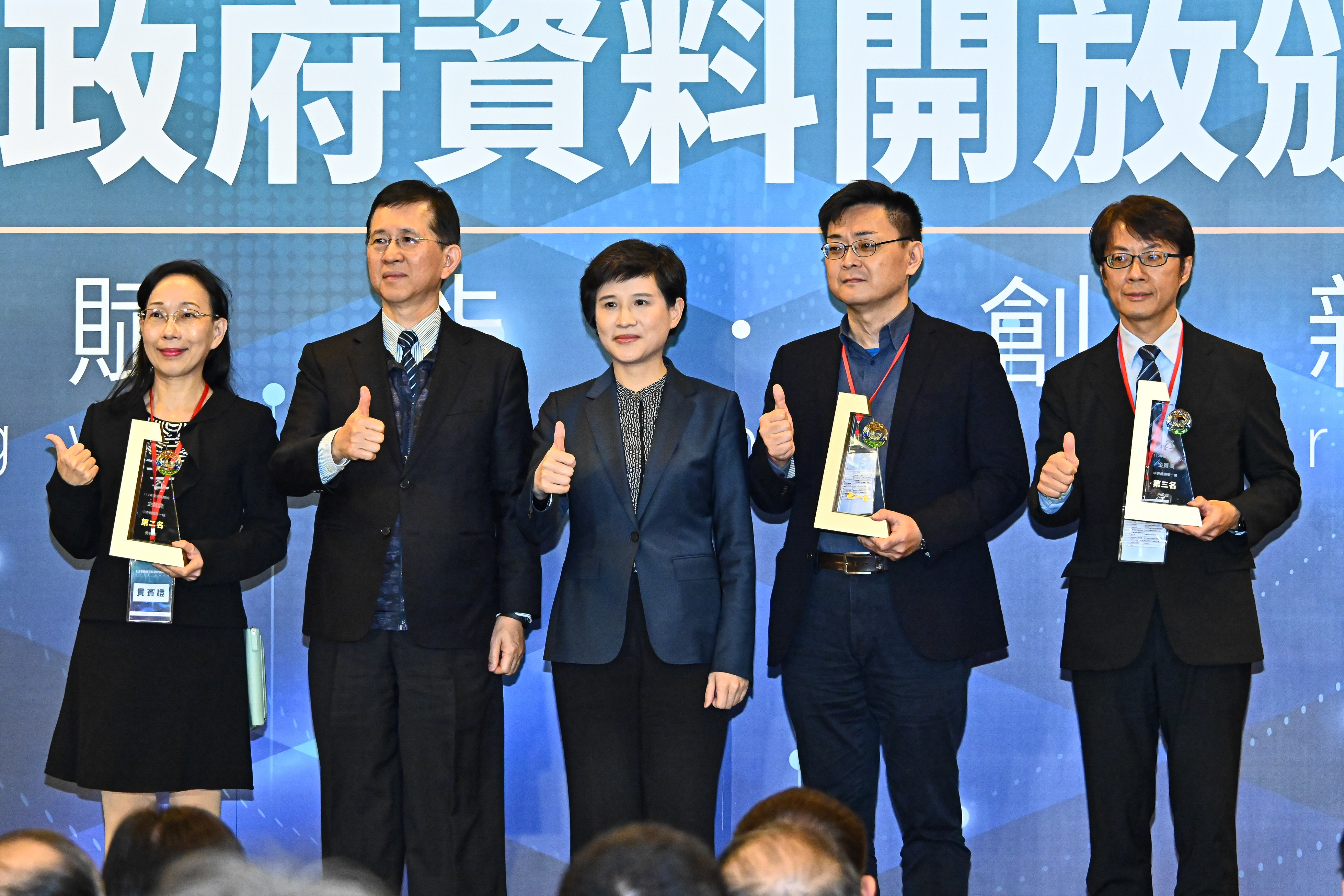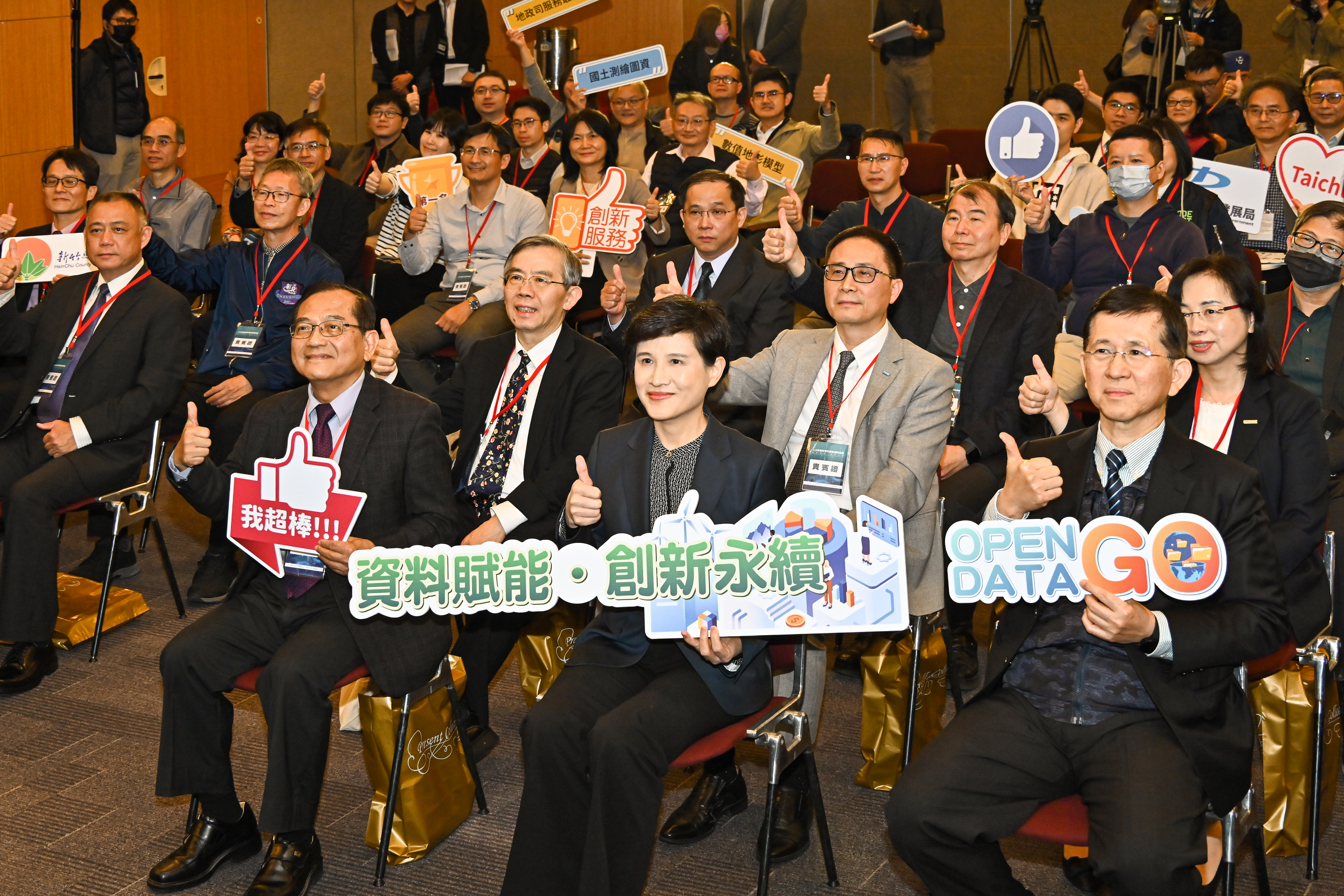 此行,鄭副院長到場後,手持「資料賦能•創新永續」手拿板,與數發部黃彥男部長及在座貴賓進行大合影;致詞結束後,鄭副院長逐一頒發「政府資料開放金質獎」予10個中央機關及地方政府,並合影留念。