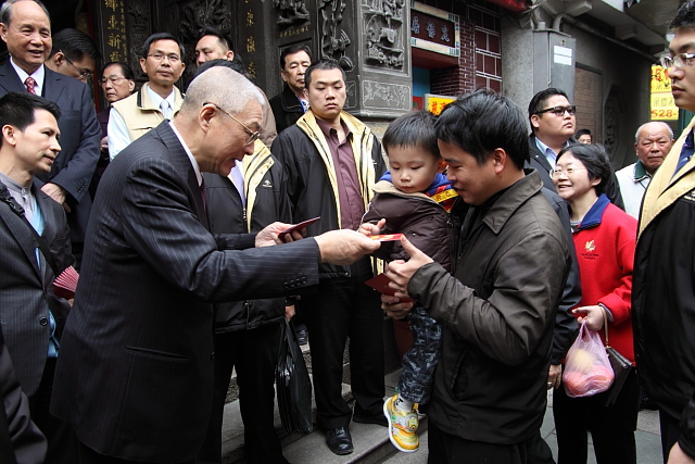 行政院長吳敦義今(13)日接連前往台中市大甲鎮瀾宮、豐原慈濟宮及台北市松山慈惠堂新春祈福參拜,祈求國運昌隆、風調雨順,兩岸和平穩定發展,民眾安康樂利,社會祥和。