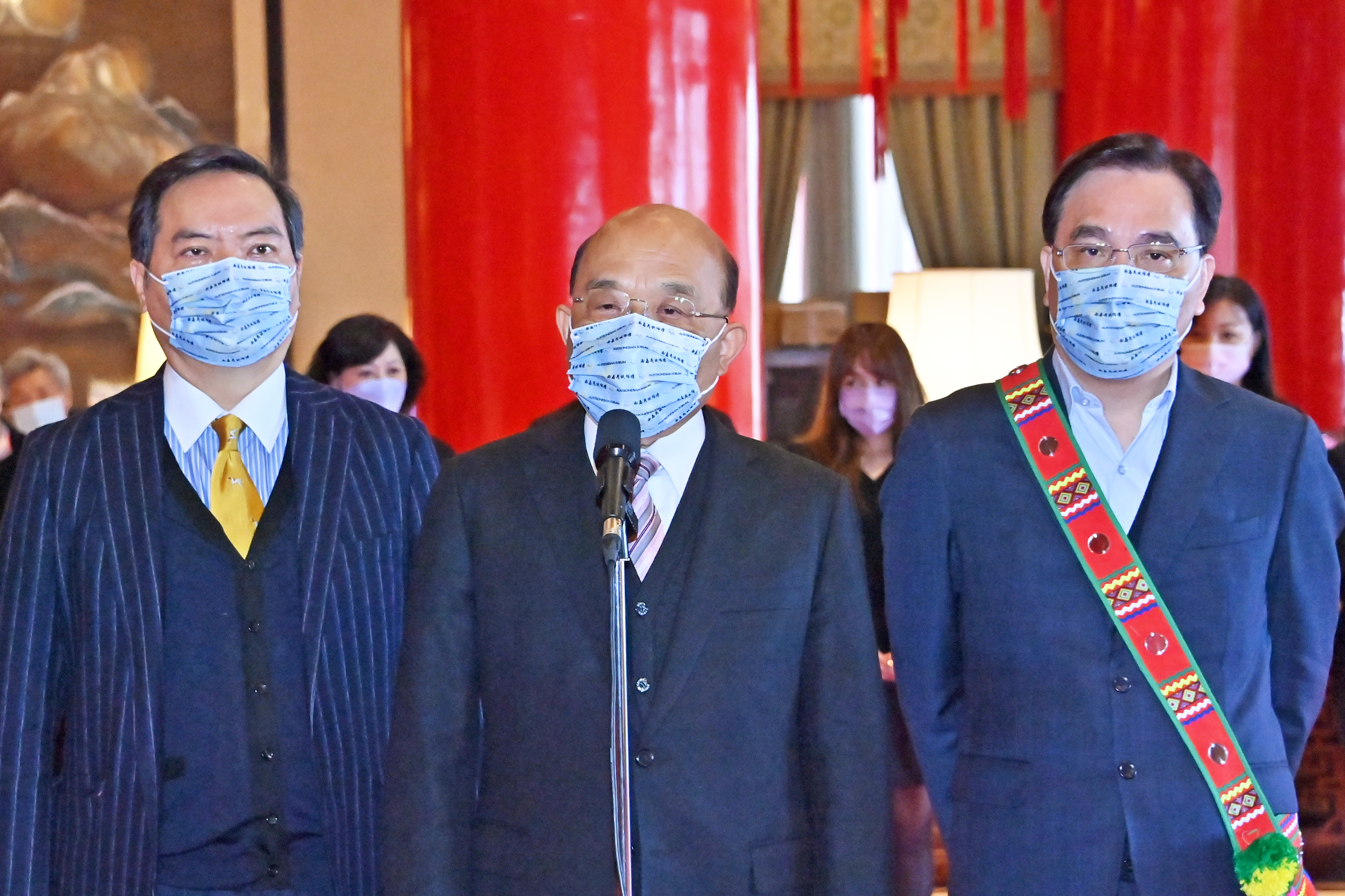 稍早,由泰雅族耆老與原住民族16族代表,以lmuhuw (傳統詠唱)方式進行祝禱祈福,蘇院長與蔡總統也共同見證此一祈福儀式。16族代表們詠唱後舉起小米酒杯,向祖靈及大地母親敬酒,象徵對大家滿滿的祝福,現場氣氛神聖隆重。隨後,我國友邦帛琉共和國前總統、傳統領袖委員會雅拉爾德州傳統領袖雷蒙傑索也以特別嘉賓身分代表致詞,並以家鄉語言吟唱祝禱,祝福現場與會嘉賓。