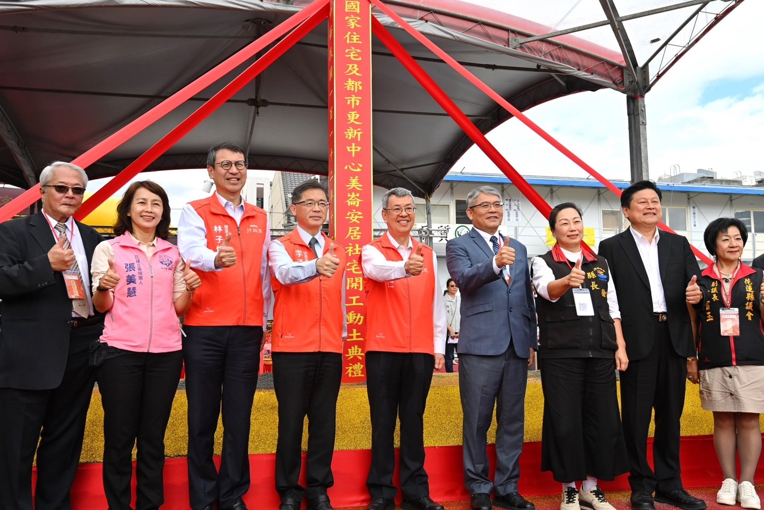 今日動土典禮在祥獅獻瑞的鑼鼓聲中熱鬧展開,陳院長到場後,首先聽取國家住都中心陳建男組長簡報「社會住宅新建統包工程」,並於致詞結束後,與總統府盧博基國策顧問、行政院李孟諺秘書長、林子倫發言人、東部聯合服務中心郭應義副執行長、內政部次長暨國家住都中心花敬群代理董事長、傅崐萁立法委員、花蓮縣徐榛蔚縣長、花蓮縣議會徐雪玉副議長、花蓮市魏嘉彥市長等人共同進行祈福儀式,上香祈求工程順利,執金鏟起鍬三鏟,完成動土儀式,並合影留念。
