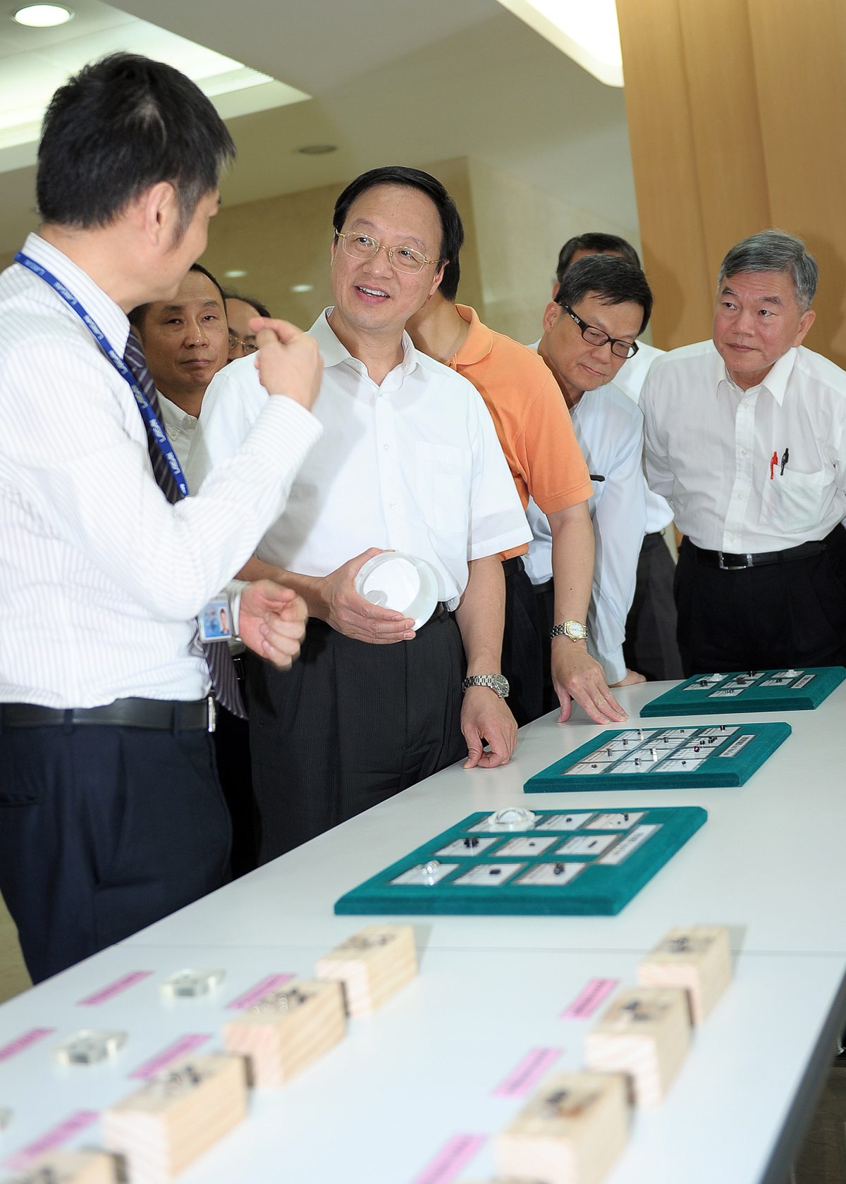 江院長指出,臺灣產業必須轉型,持續提升產品附加價值,而大立光的發展,由傳統相機鏡頭開始,透過不斷努力與研發,演進發展至今日生產各式精密、高品質光學鏡頭,更成為全球著名手機品牌鏡頭之主要供應商。他並以大立光生產如米粒般大小的手機鏡頭為例,強調這種配合客戶需求,持續創新研發,並提供客製化服務及產品的作為,正是政府「三業四化」政策中,「製造業服務化」的良好典範,也是他十分推崇的創業與企業精神。