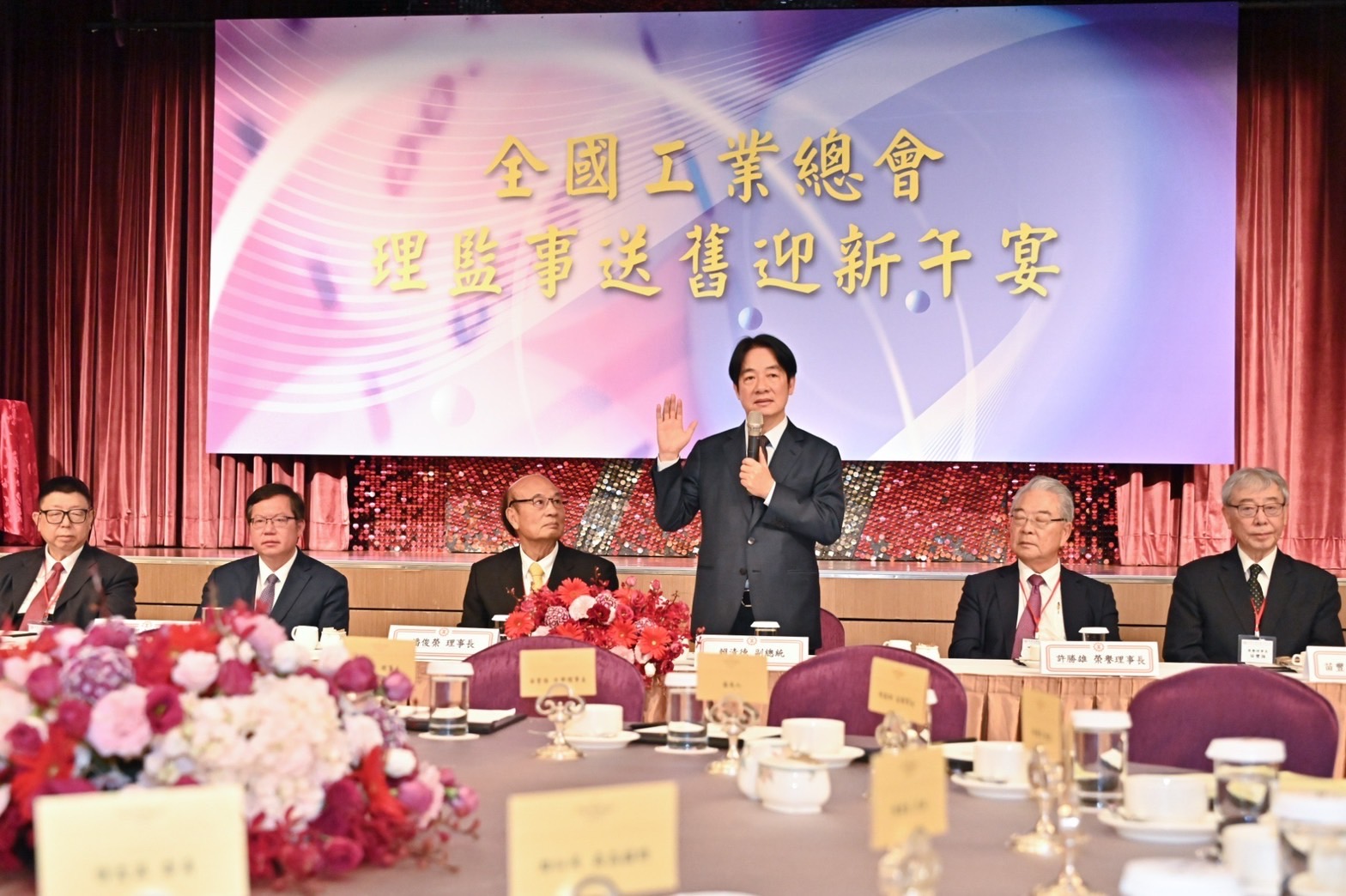 致詞結束後,賴清德副總統頒發中華民國全國工業總會理事長當選證書予潘俊榮新任理事長,隨後與鄭副院長、經濟部林全能次長、工總潘理事長、苗豐盛監事會召集人、許勝雄榮譽理事長、苗豐強榮譽理事長、何壽川副理事長、陳進財副理事長、詹正田副理事長、侯傑騰副理事長及陳益民秘書長合影留念。