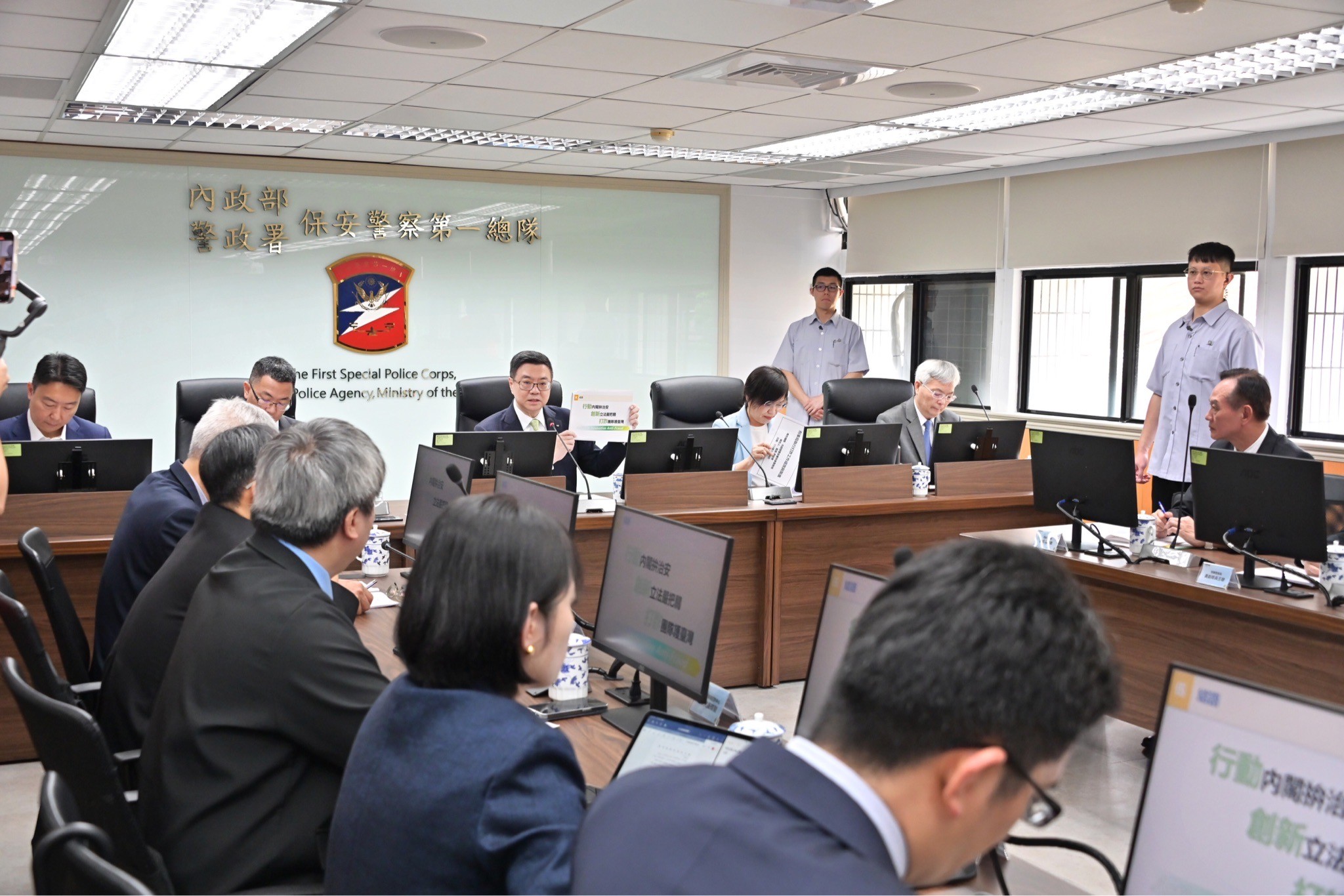 卓院長進一步指出,周局長於簡報結語時提到「行動內閣拚治安、創新立法嚴把關、打詐團隊護臺灣」,這不是一句口號,而是新內閣團隊的目標,同時也是非常神聖、重大的使命。卓院長特別感謝刑事局積極偵辦臺中捷運英勇救人的許姓長髮男子遭冒名詐騙案,迅速破獲詐騙源頭,讓不肖之徒無法得逞,也讓人民安心。