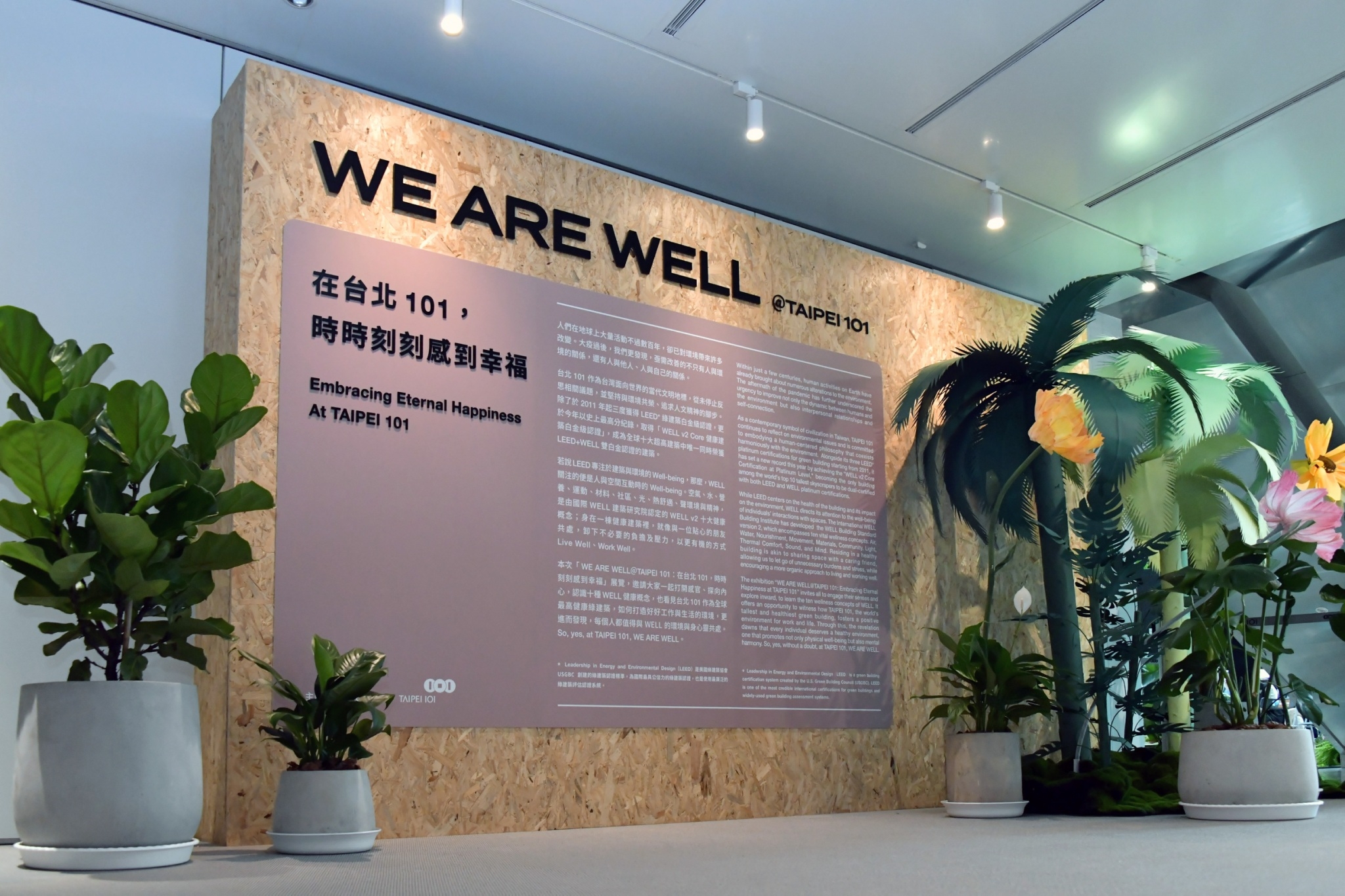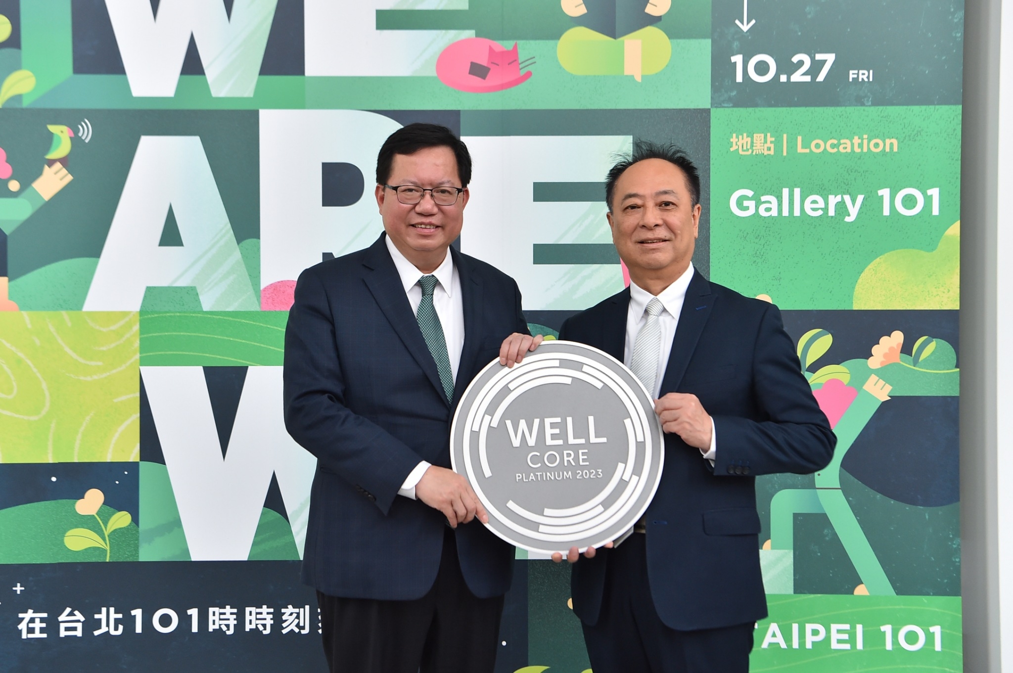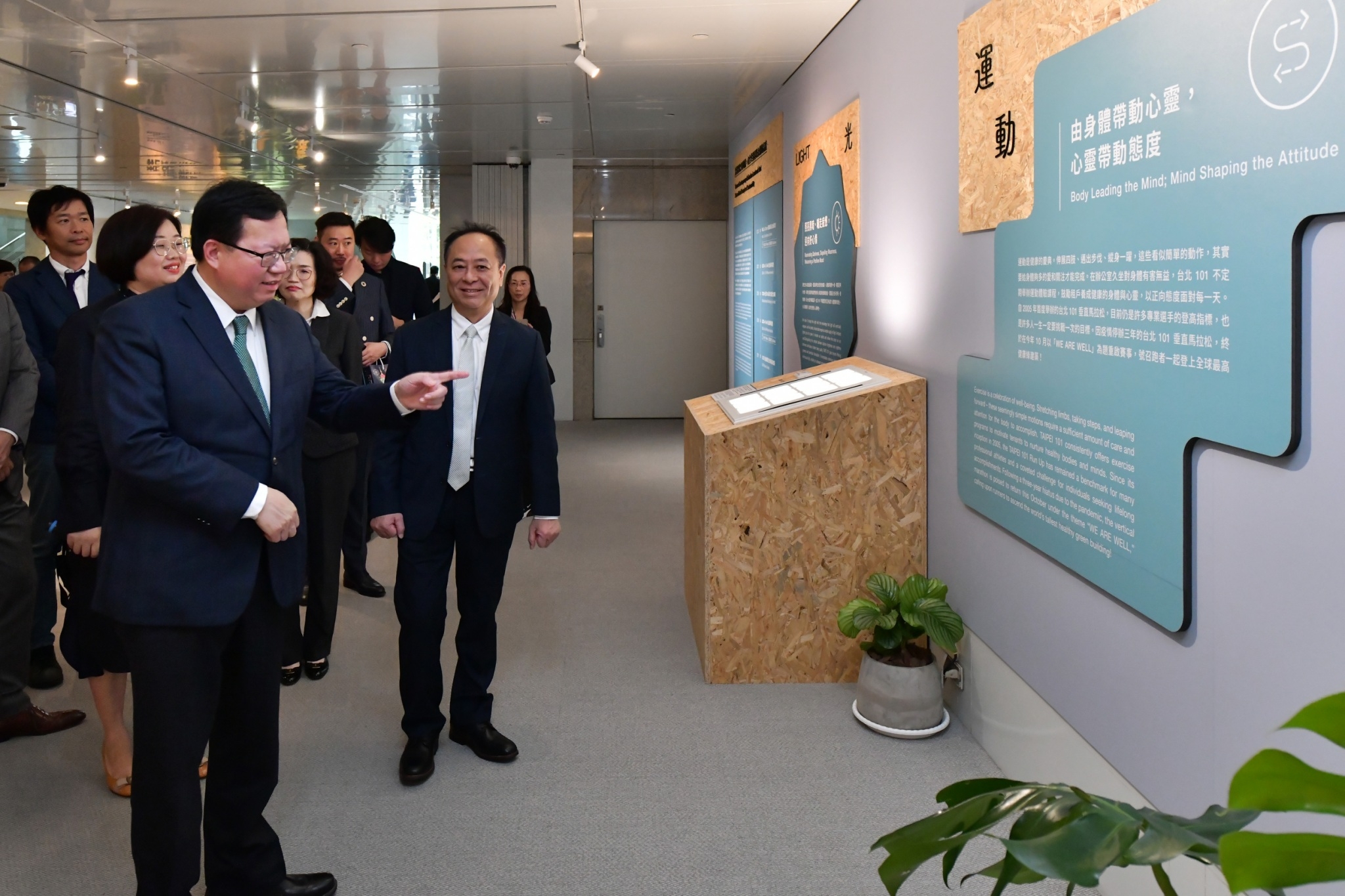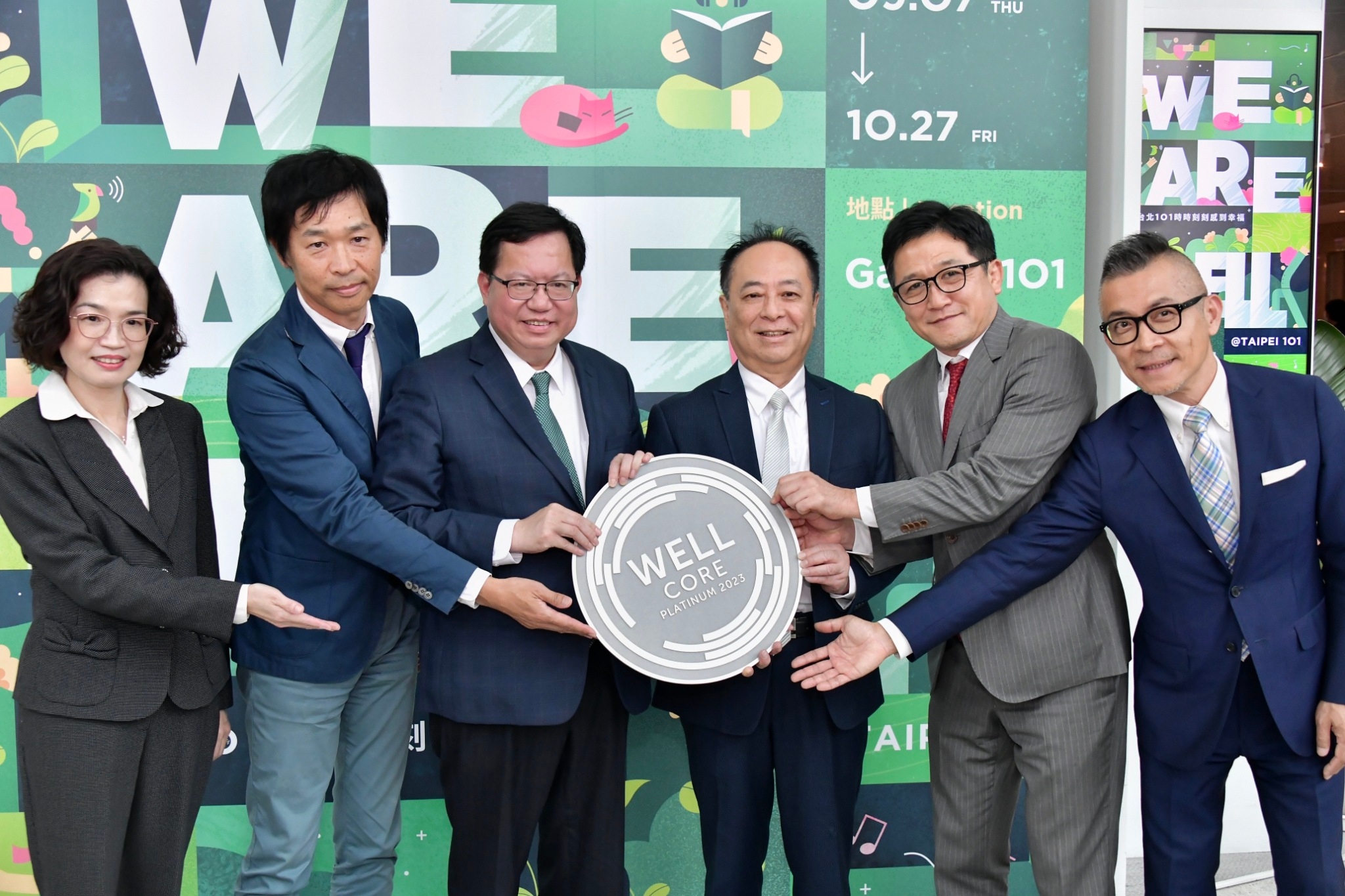 此行,鄭副院長到場後,先觀賞「台北101永續旅程」影片,並見證國際WELL建築研究院(IWBI)亞洲區總裁雪婭頒發「WELL健康建築白金級認證」予台北101董事長張學舜。隨後,鄭副院長與IWBI雪婭總裁、台北101張董事長、朱麗文總經理、台北101大樓事業處劉家豪營運長等人於舞臺上舉杯合影留念,並參觀「WE ARE WELL@TAIPEL 101」展覽,了解健康綠建築元素和台北101實踐成果。